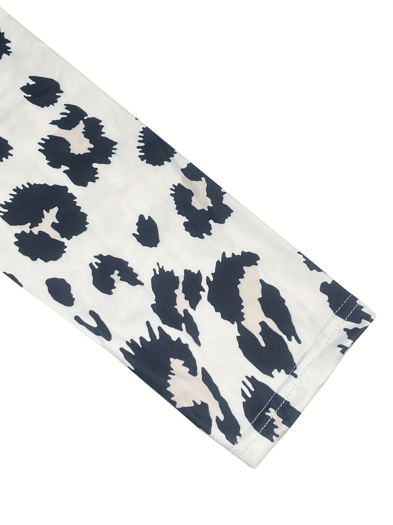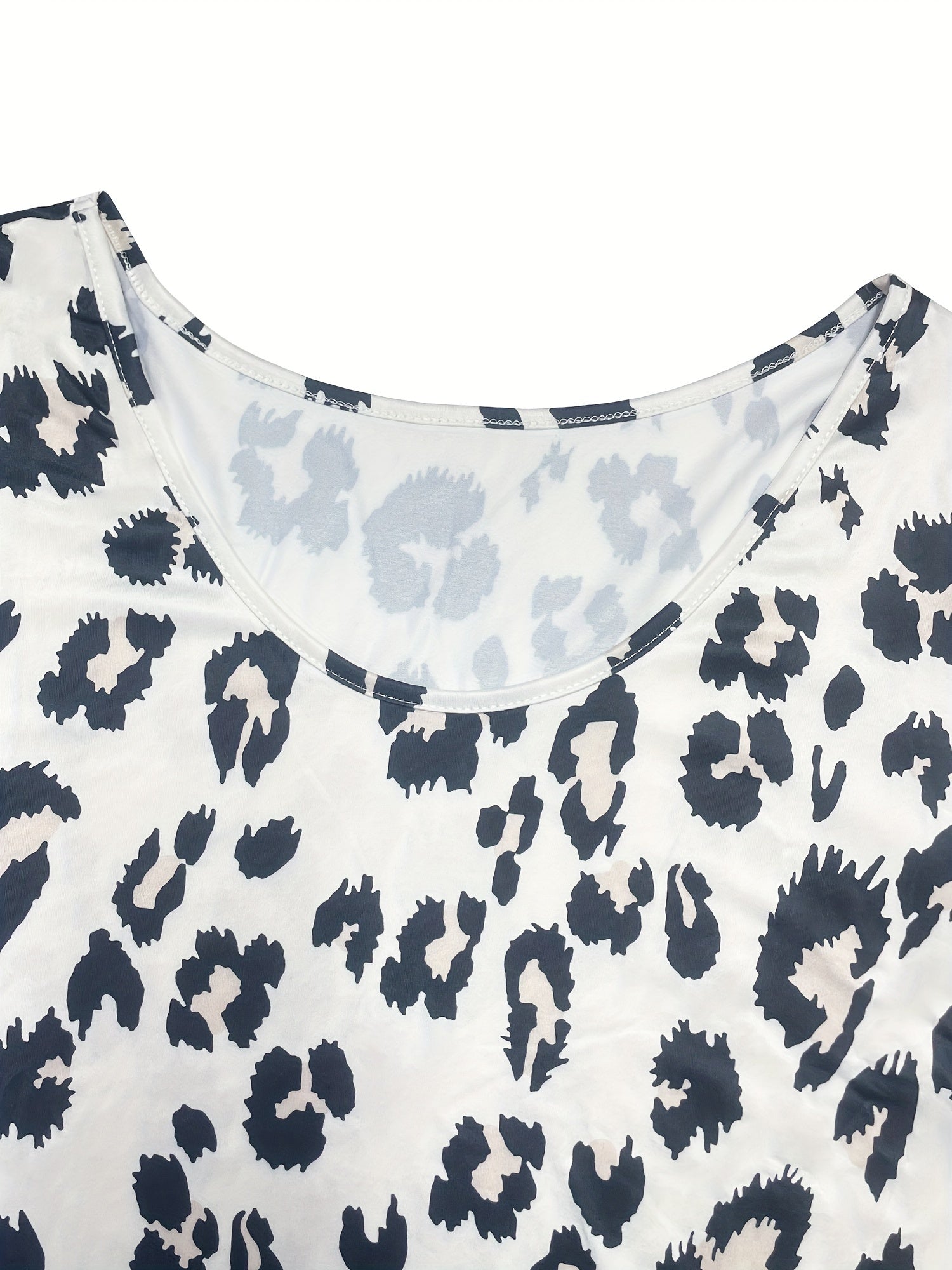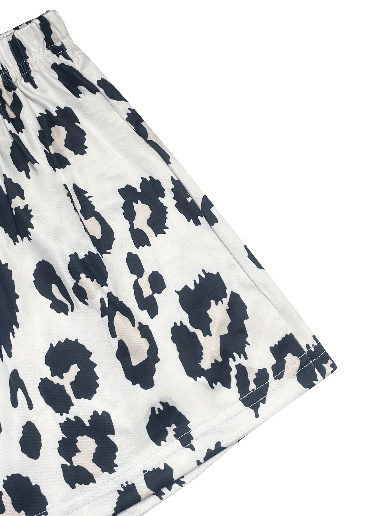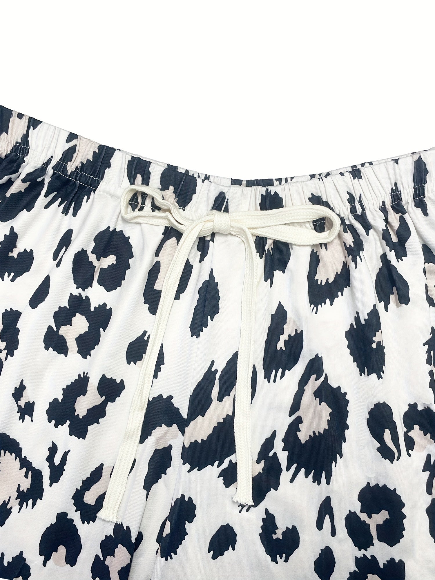 V-yoqasi bilan leopard naqshli lounge to'plami va shortilar, qulay kechalar uchun mukammal.