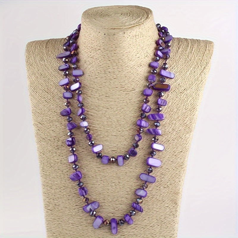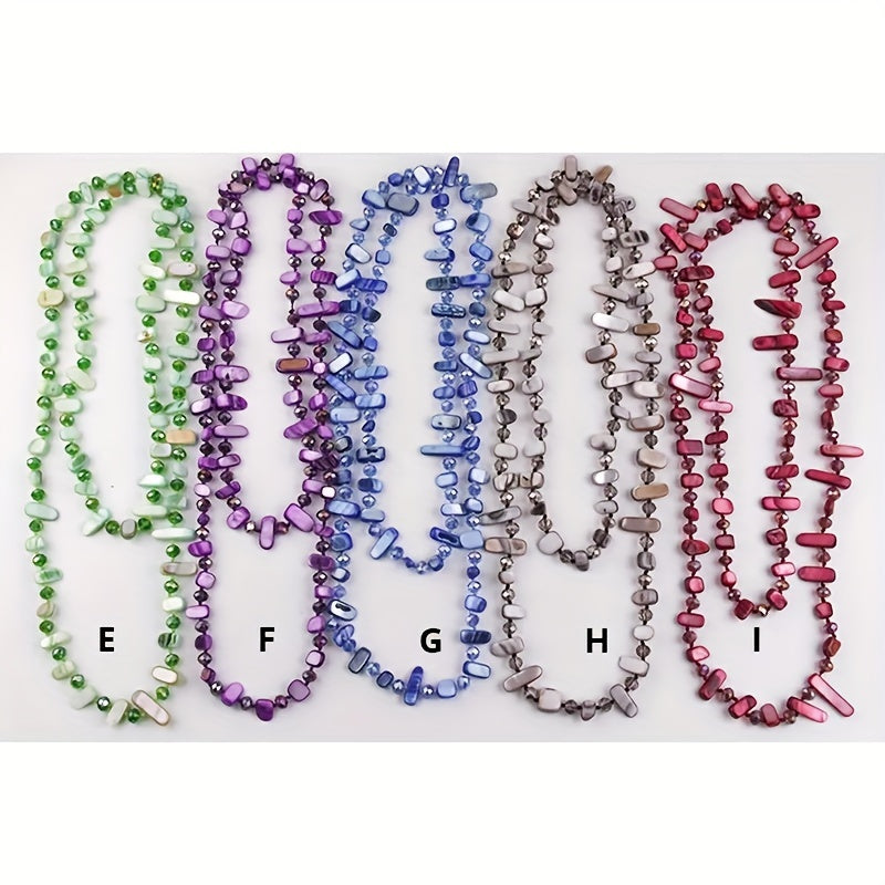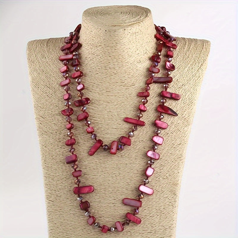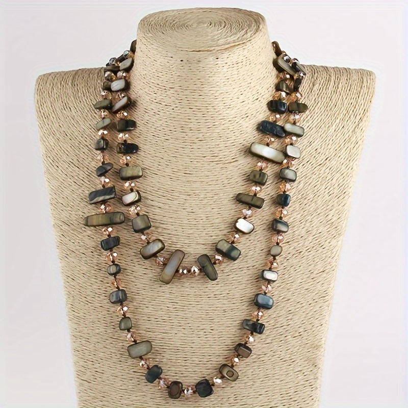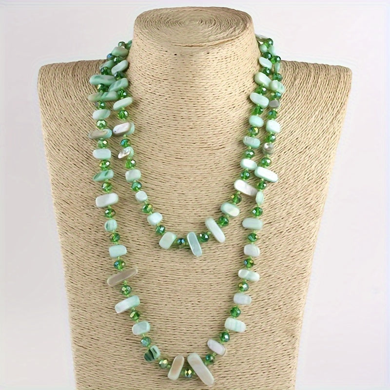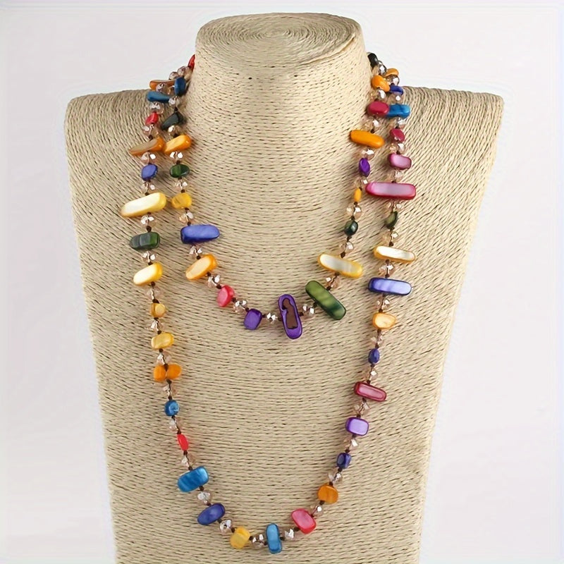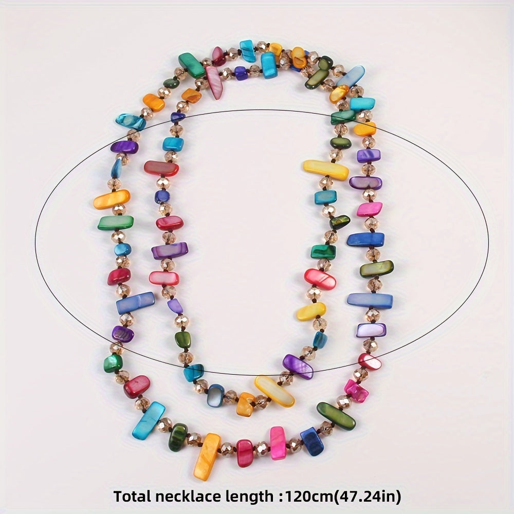Kamalak kristallari va qobiq marjonlari bilan bezatilgan uzun tugilgan marjon - boho-chic, bohem uslubini sevuvchi ayollar uchun ideal sovg'a.