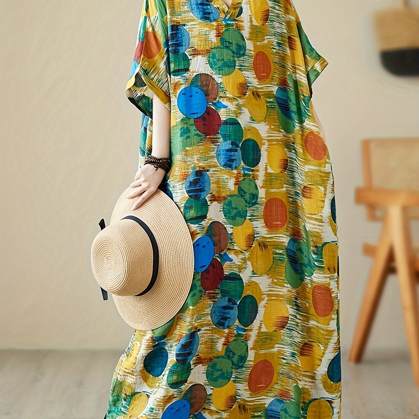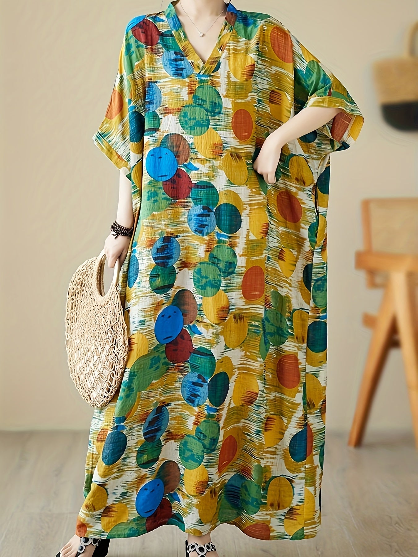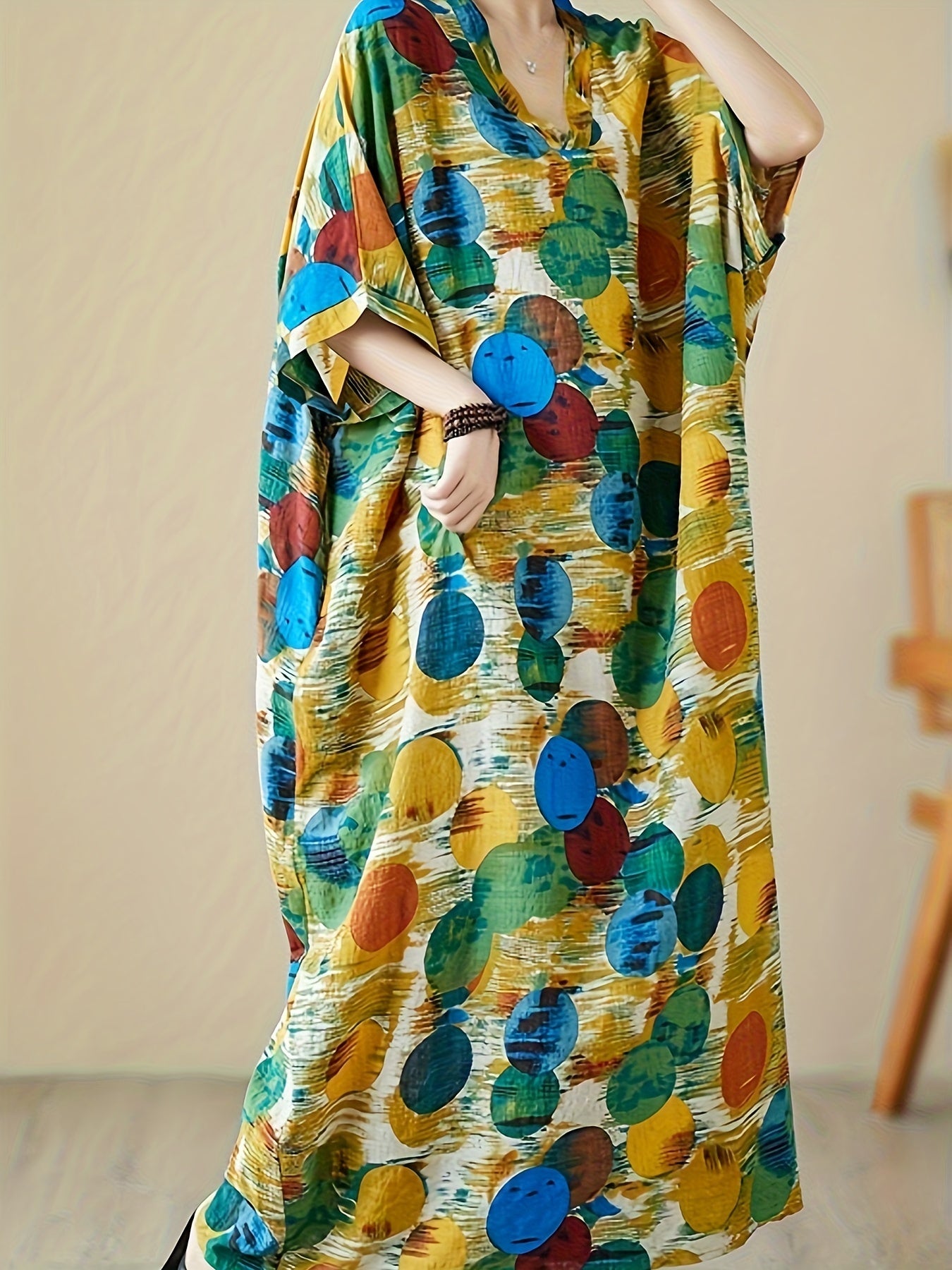 Katta o'lchamdagi ayollar uchun rang-barang naqshli, keng kesimli V-yuqori maxi ko'ylak va kimono uslubi