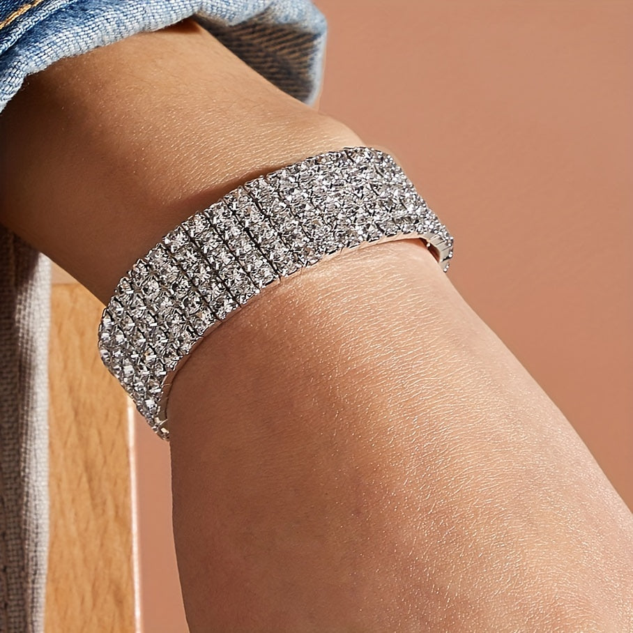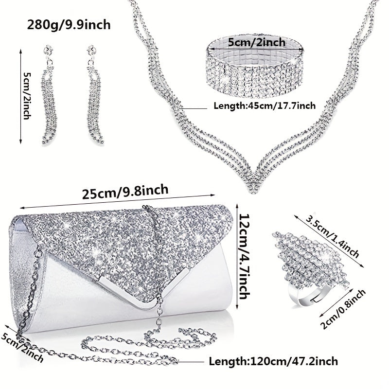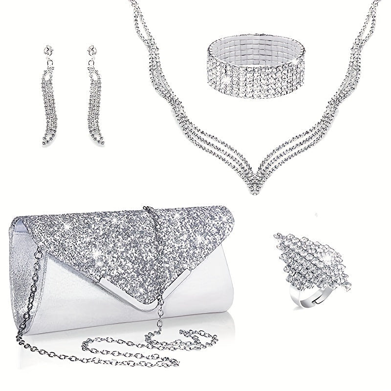 6 ta taqinchoq, marjon, bilaguzuk, uzuk va sumkadan iborat hashamatli taqinchoq to'plami, barchasi porloq rhinestone'lar bilan bezatilgan. Kechki ziyofat kiyimlaringizga nafislik qo'shish uchun mukammal.