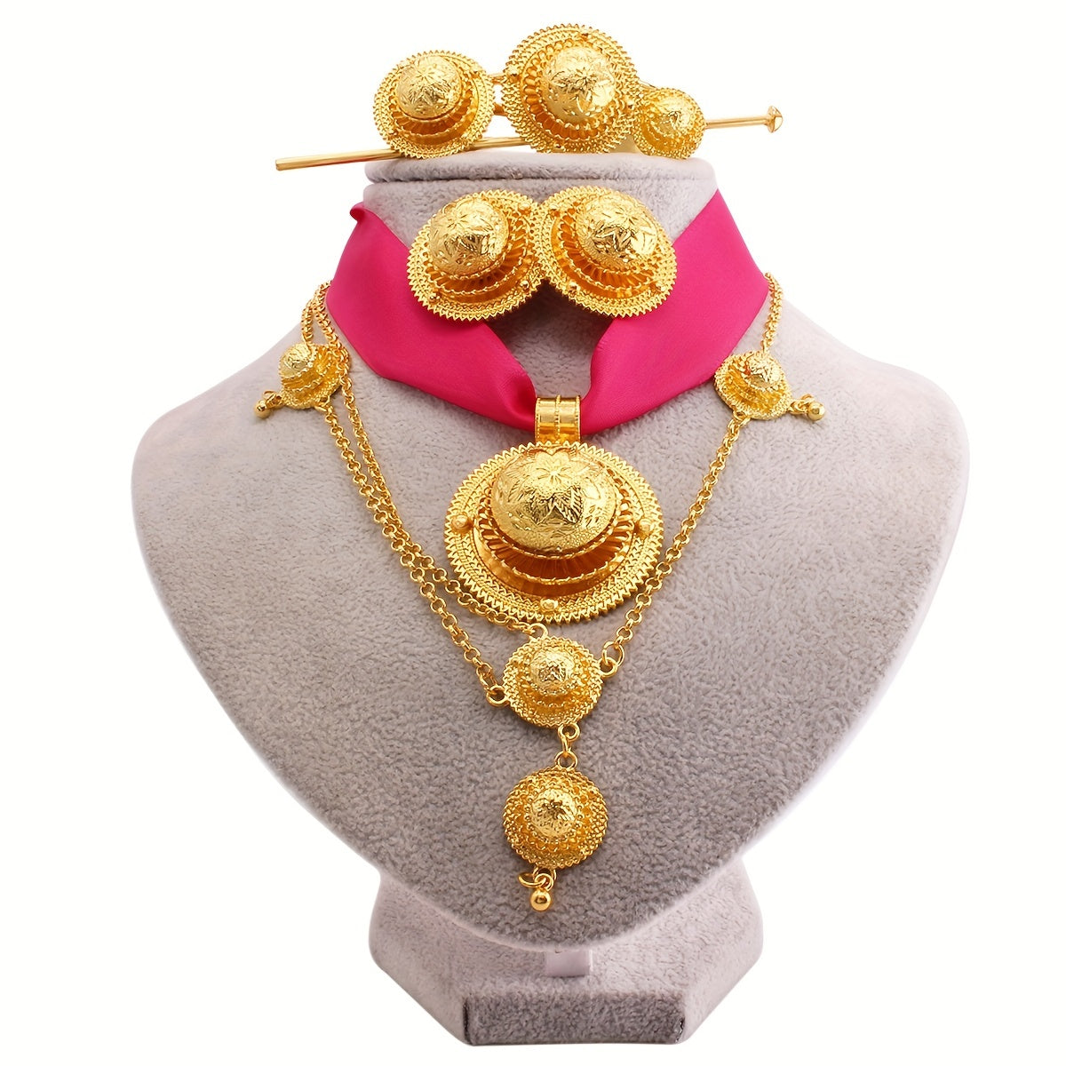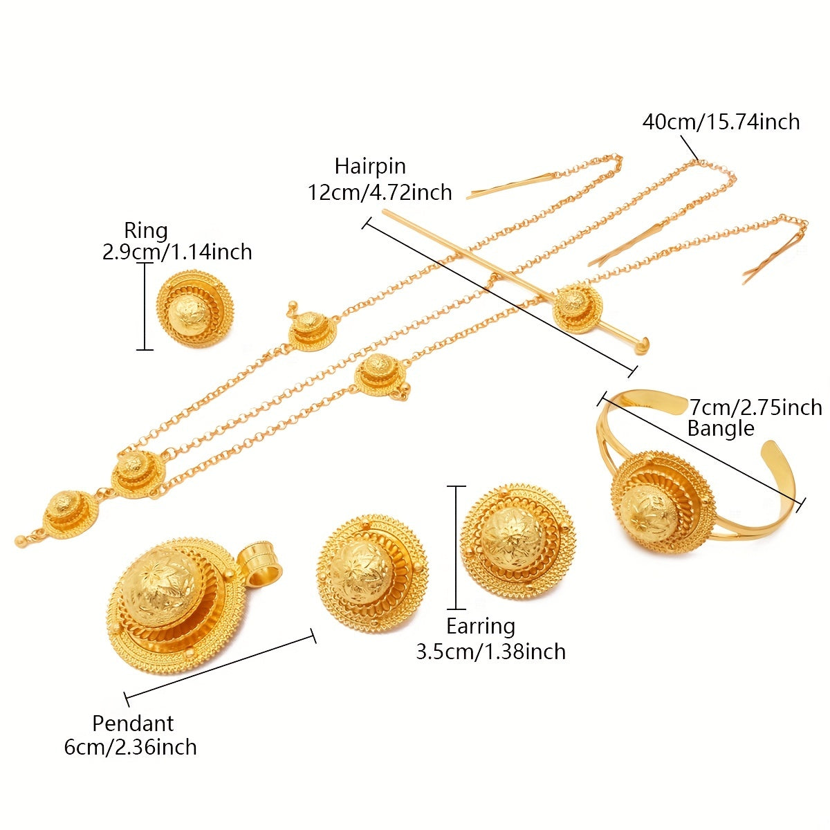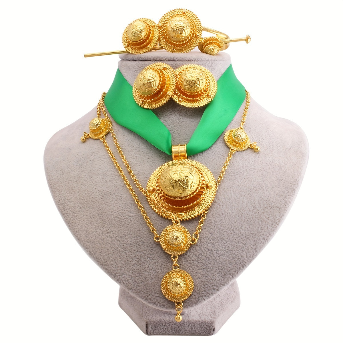 Zinaplatali sink qotishmasidan tayyorlangan, kechki ziyofatlar va to'y tadbirlari uchun mukammal, o'ziga xos dizaynga ega bo'lgan, bilaguzuk, uzuk, marjon, taqinchoq va soch ignasidan iborat hashamatli taqinchoq to'plami.