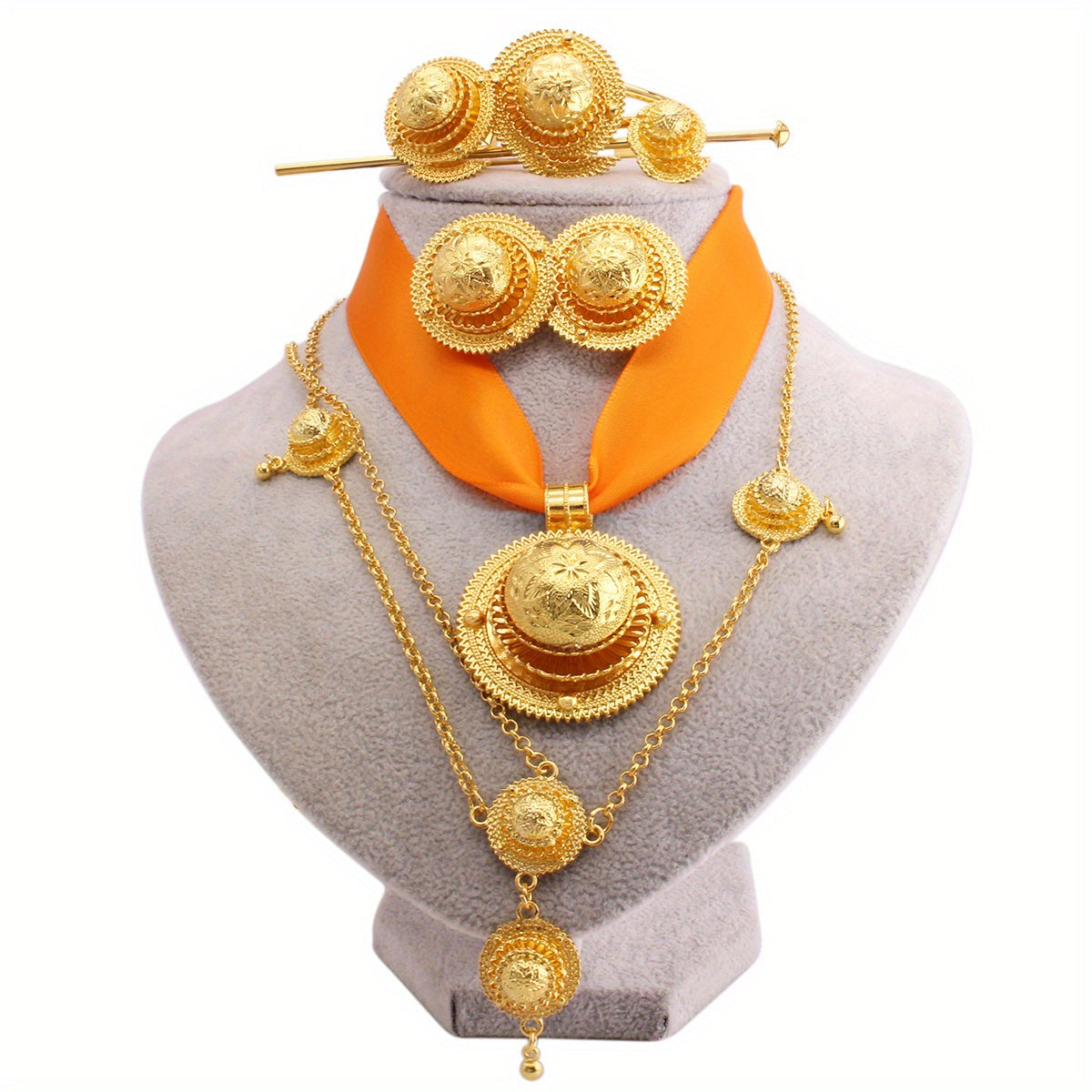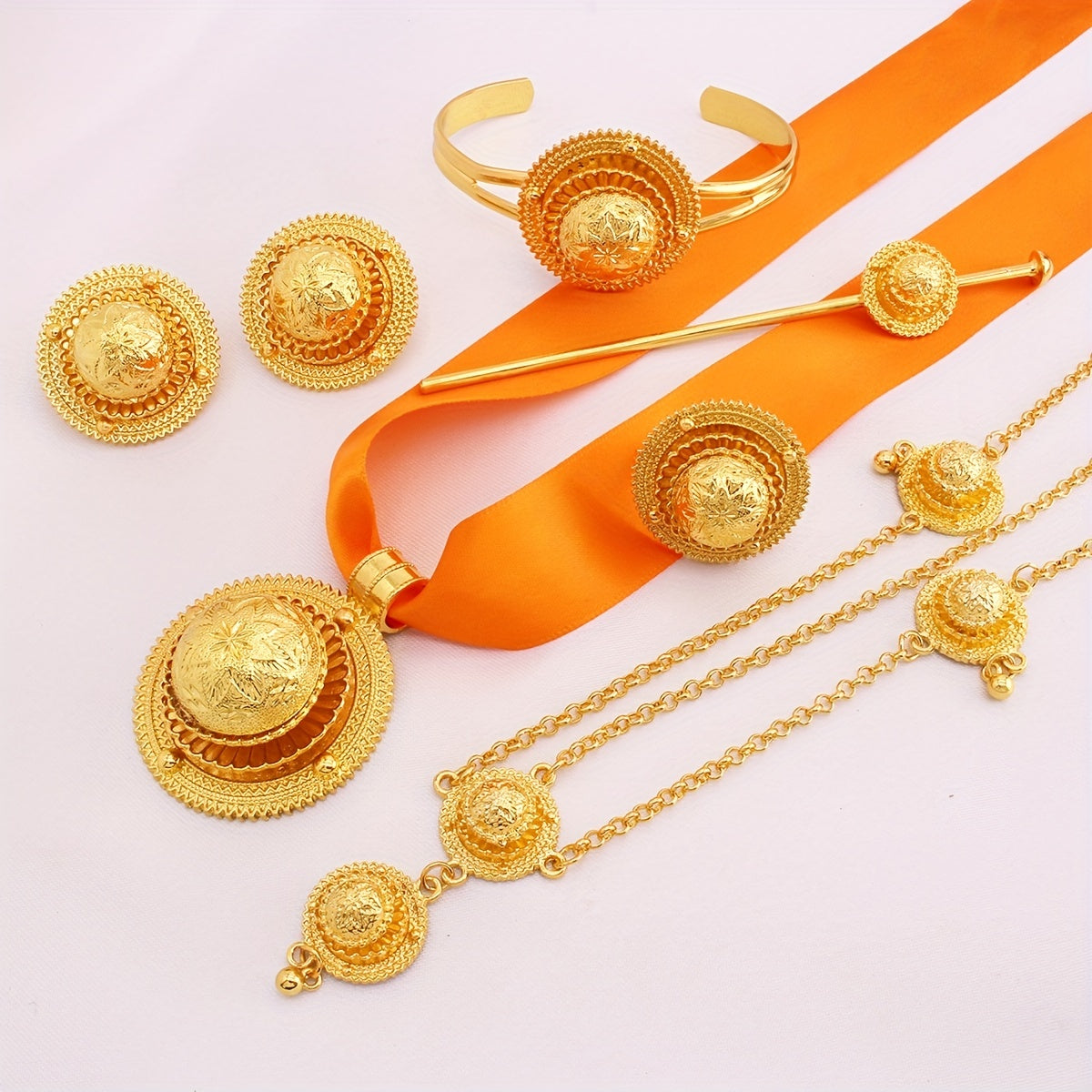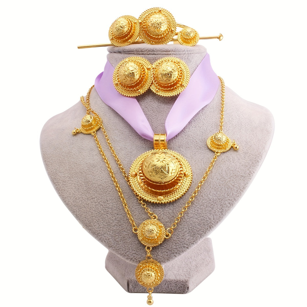 Zinaplatali sink qotishmasidan tayyorlangan, kechki ziyofatlar va to'y tadbirlari uchun mukammal, o'ziga xos dizaynga ega bo'lgan, bilaguzuk, uzuk, marjon, taqinchoq va soch ignasidan iborat hashamatli taqinchoq to'plami.