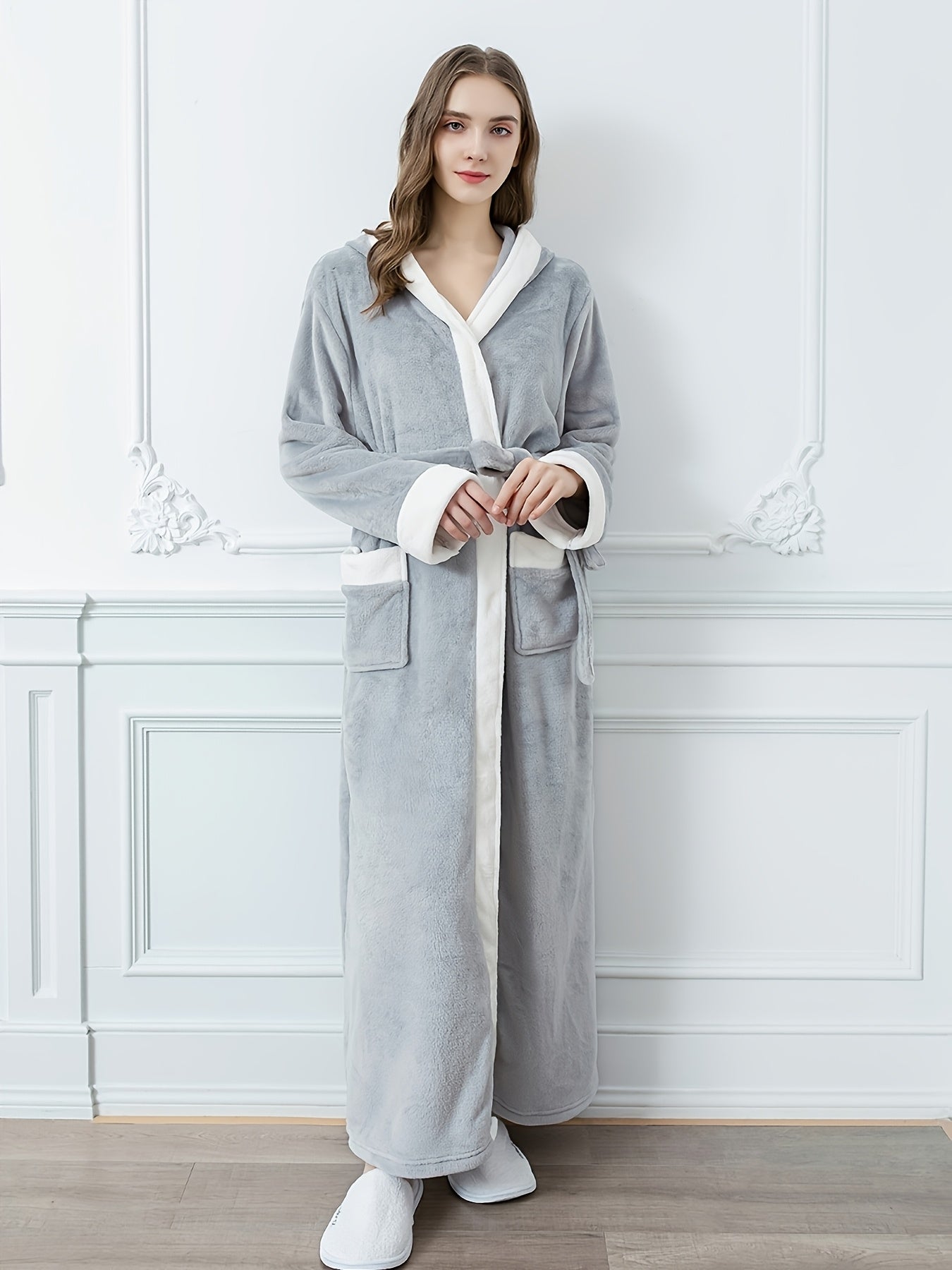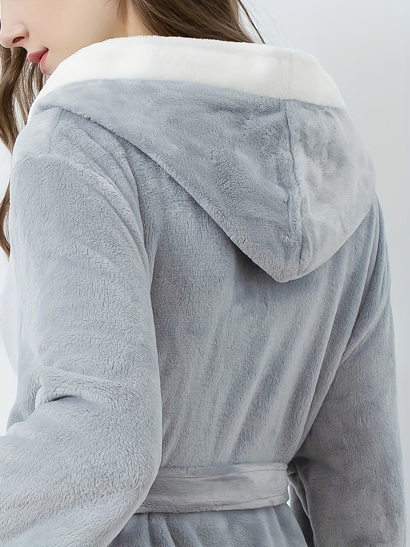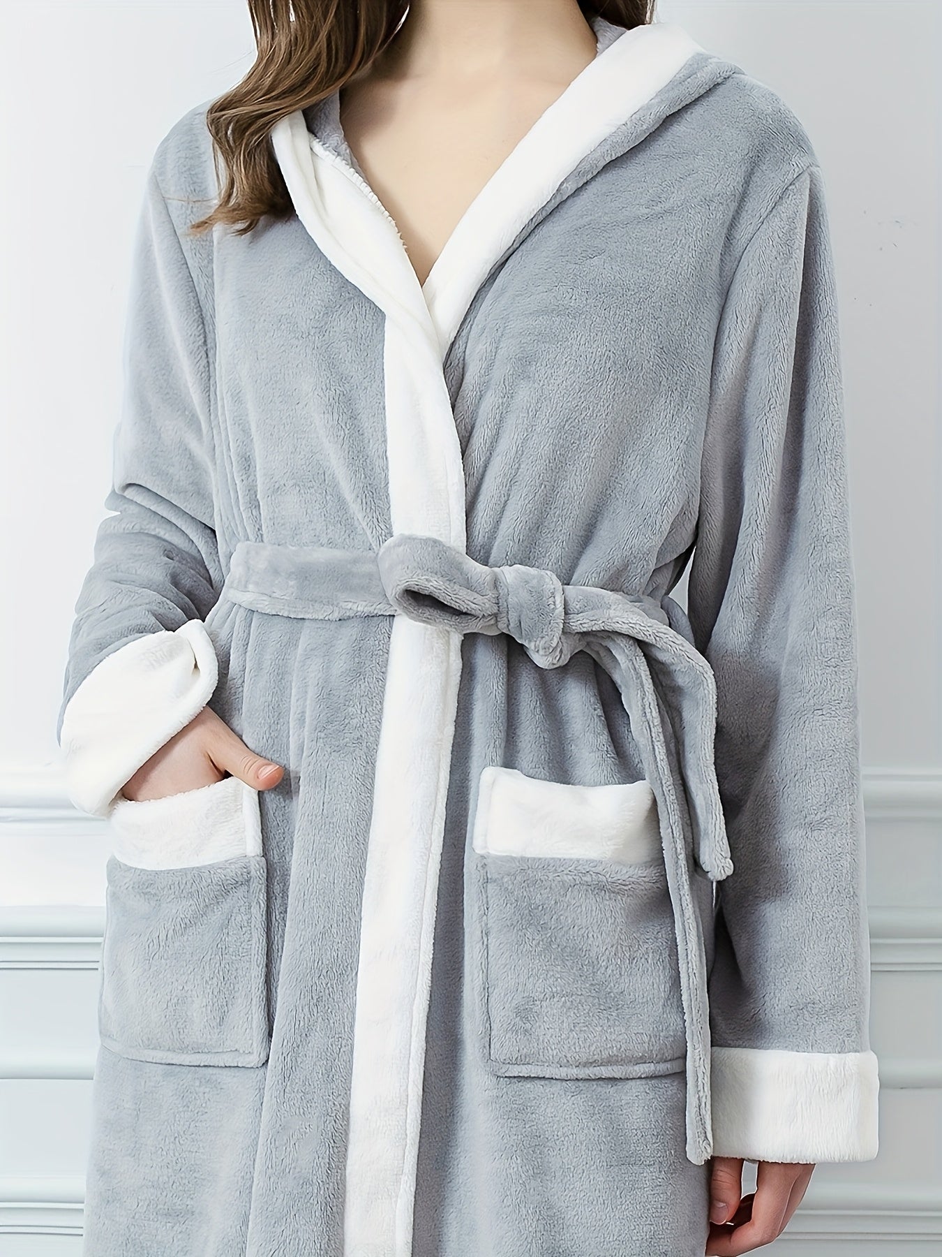 Erkaklar va ayollar uchun mo'ynali yenglar, cho'ntaklar va yumshoq polyester materialdan tayyorlangan hashamatli engil kulrang kapüşonli hammom ro'moli. Kuz va qish uchun qulaylik uchun ideal.