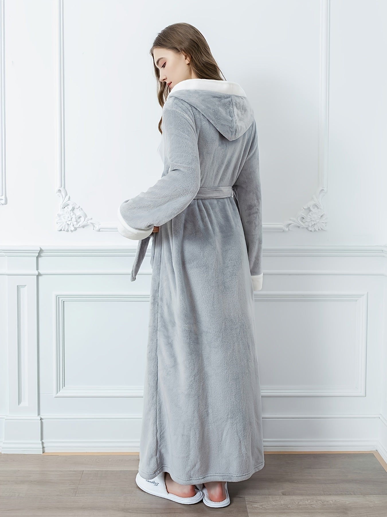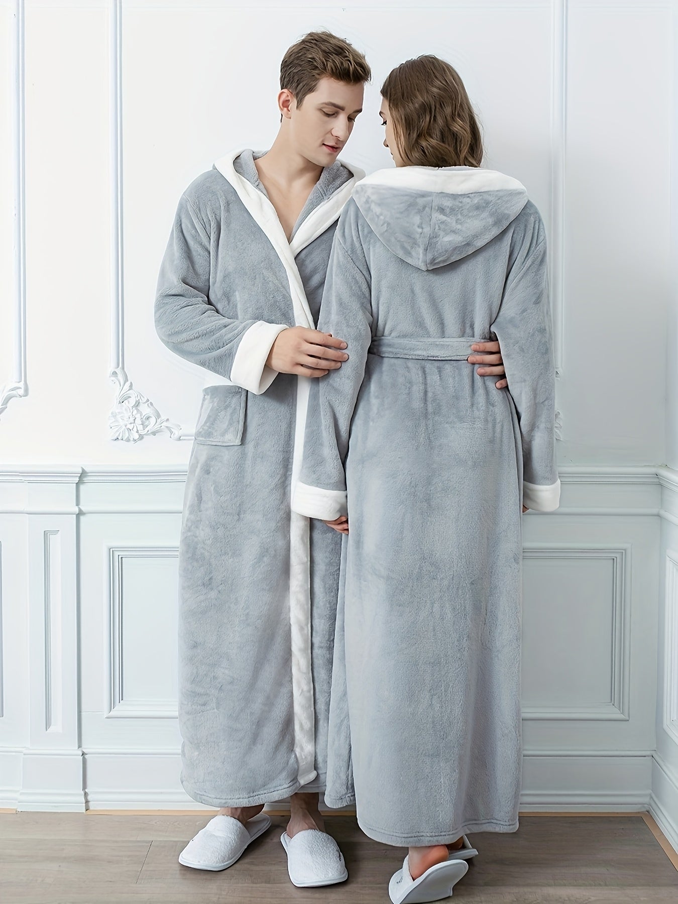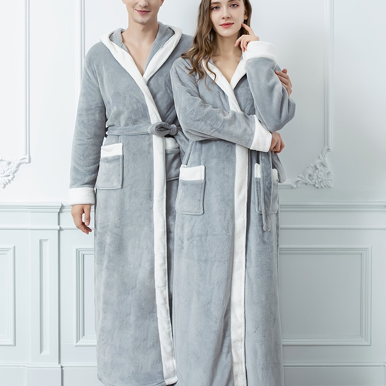 Erkaklar va ayollar uchun mo'ynali yenglar, cho'ntaklar va yumshoq polyester materialdan tayyorlangan hashamatli engil kulrang kapüşonli hammom ro'moli. Kuz va qish uchun qulaylik uchun ideal.
