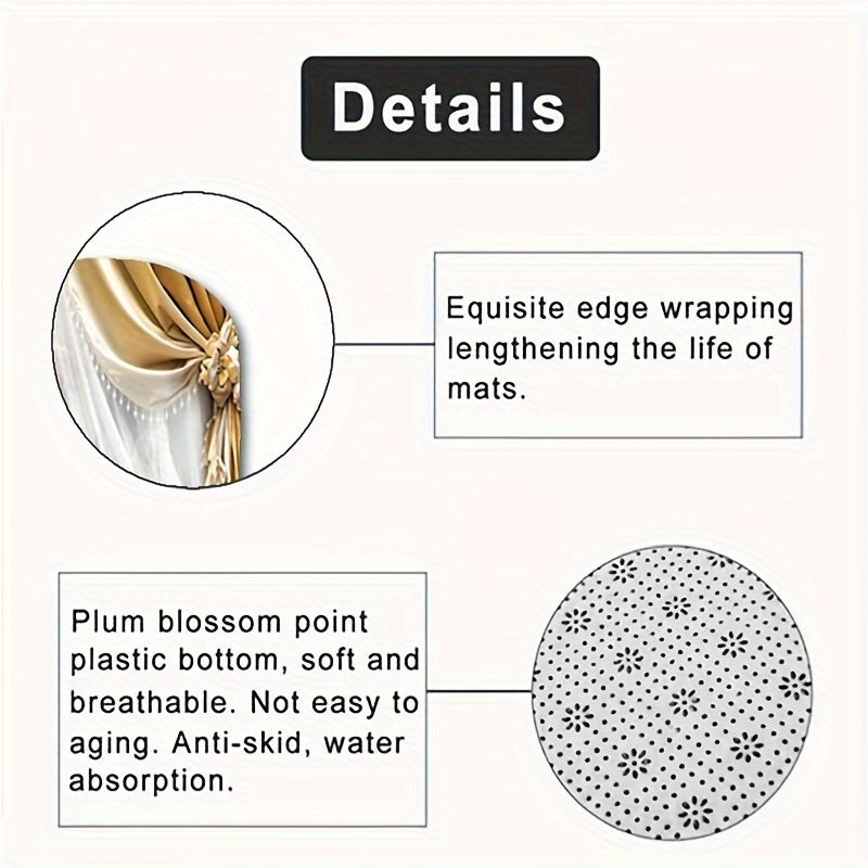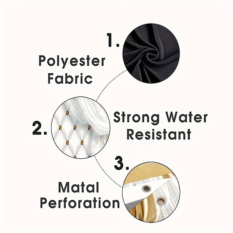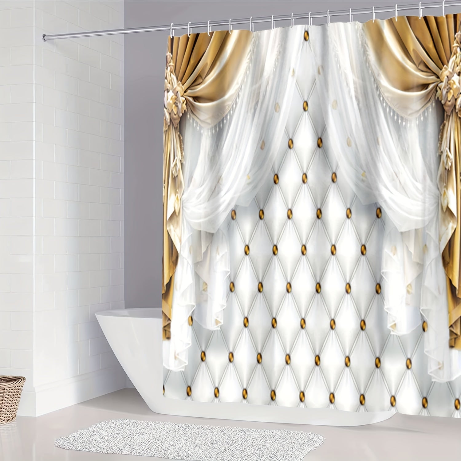 Oltin va oq rangdagi mos hammom gilami va aksessuarlar bilan birga 4 qismli hashamatli dush pardasi to'plami.