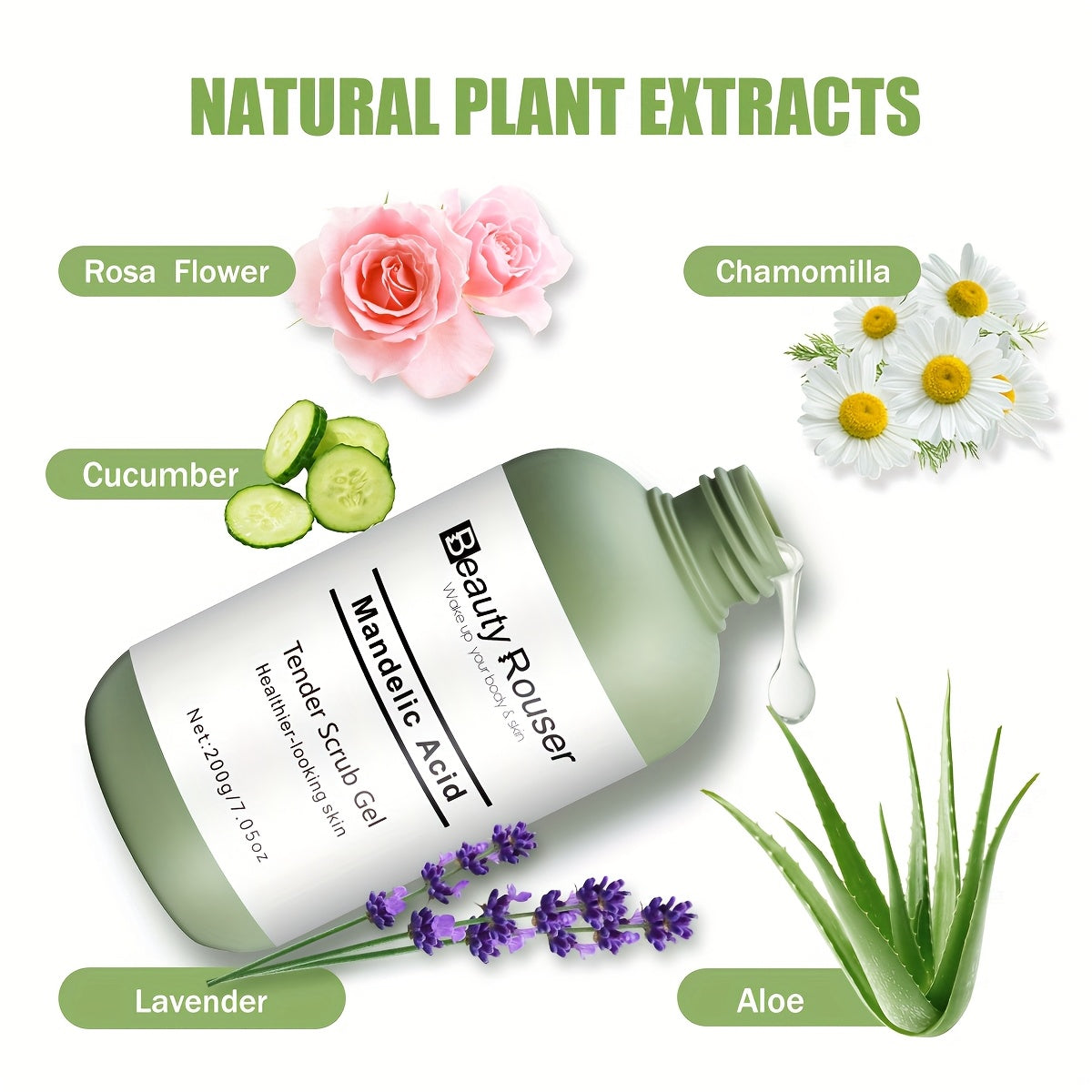 Mandelik kislota tozalovchi geli aloe va atirgul ekstrakti bilan - yumshoq, namlantiruvchi yuz va tanani skrab, chuqur po'lat tozalash, terini to'sib qo'yadi, alkogolsiz, barcha teri turlari uchun mos.