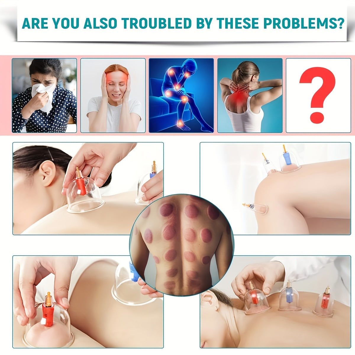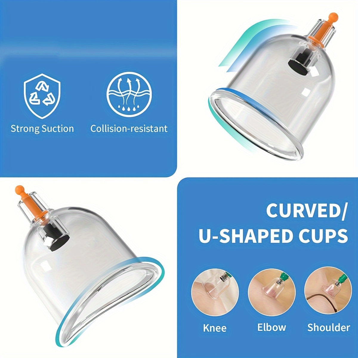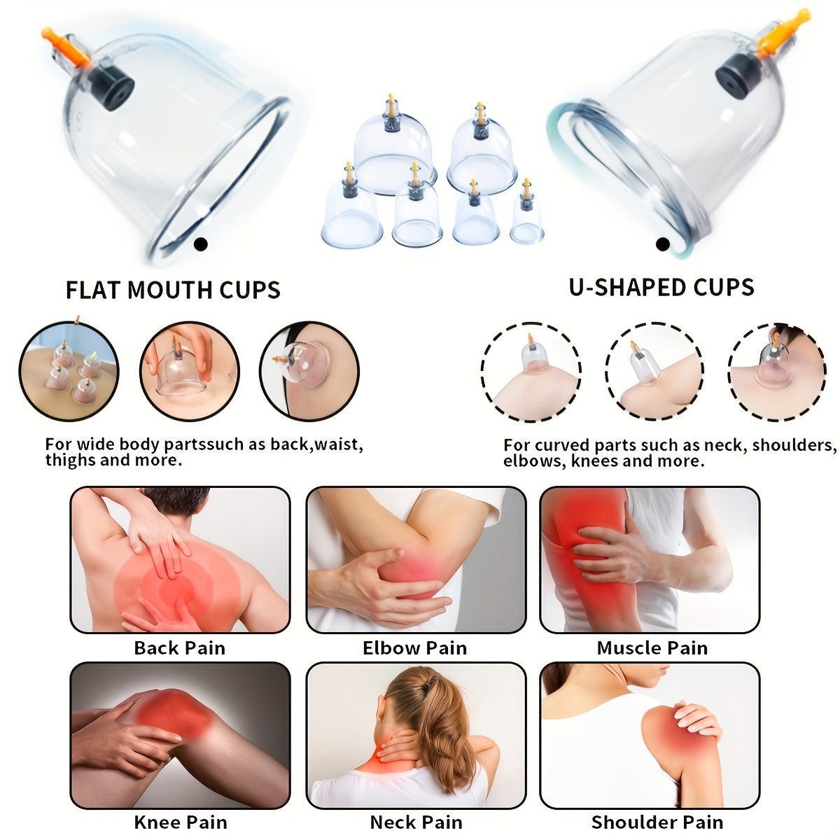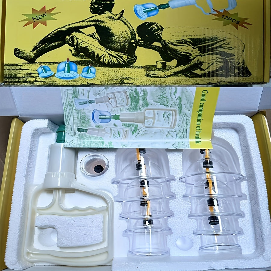 Bir nechta vakuum stakanlari, qo'l nasosi va massaj terapevtlari va Xitoy akupunkturasi uchun batafsil qo'llanma bilan massaj qozonlari to'plami. Vakuum so'rish bilan portativ.