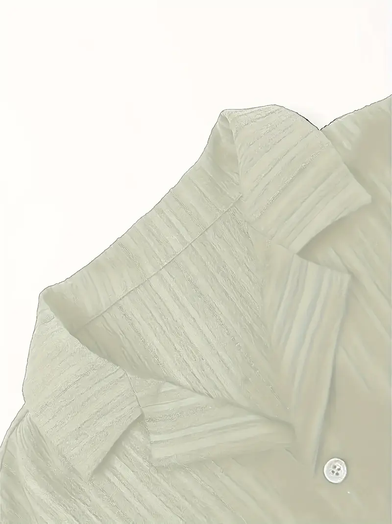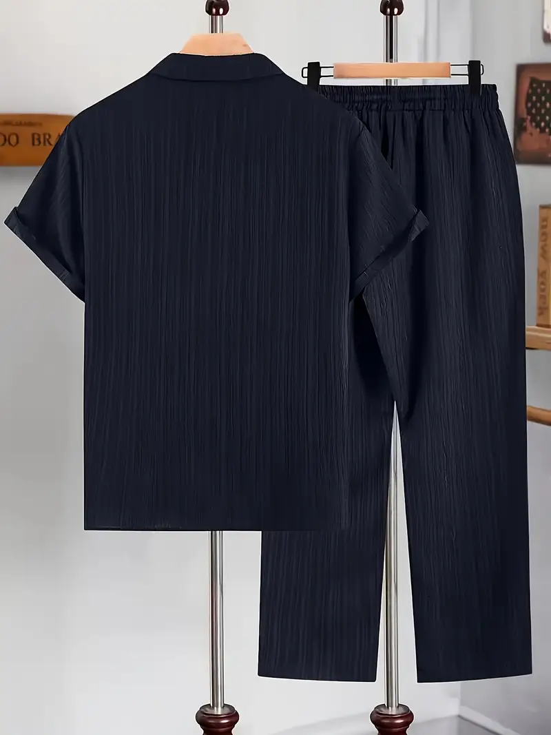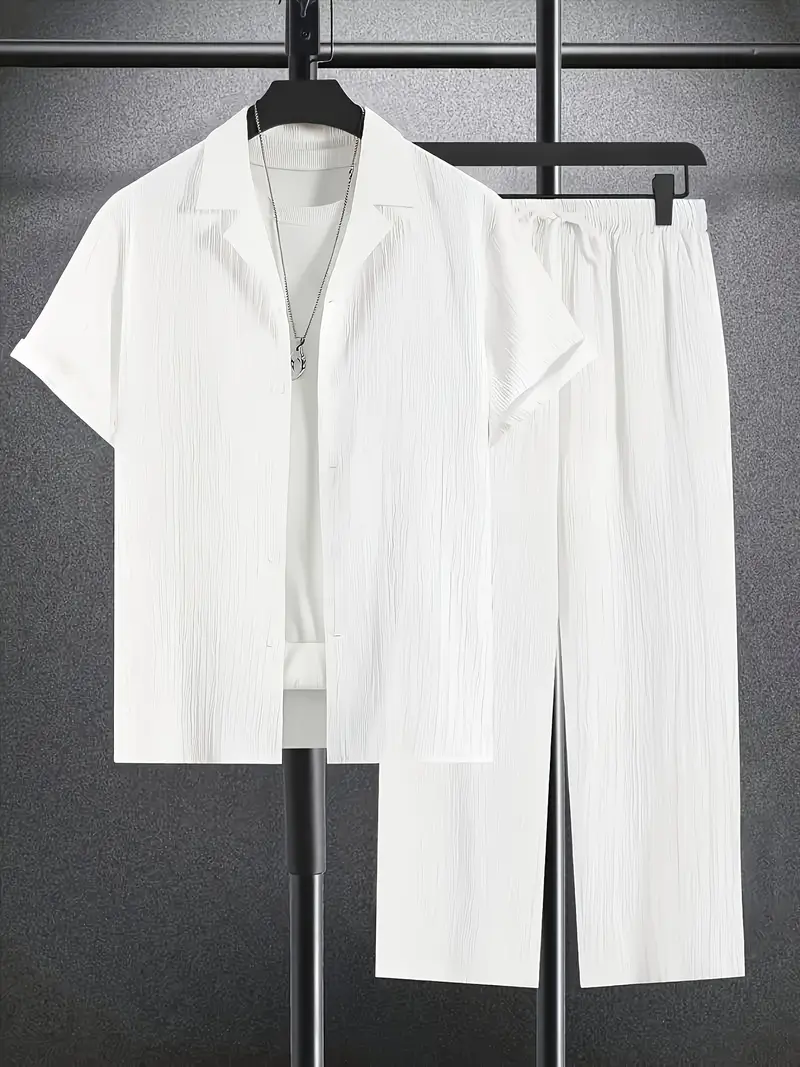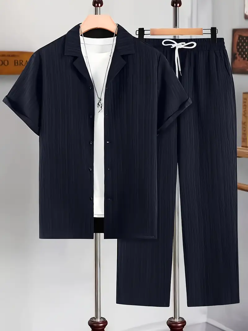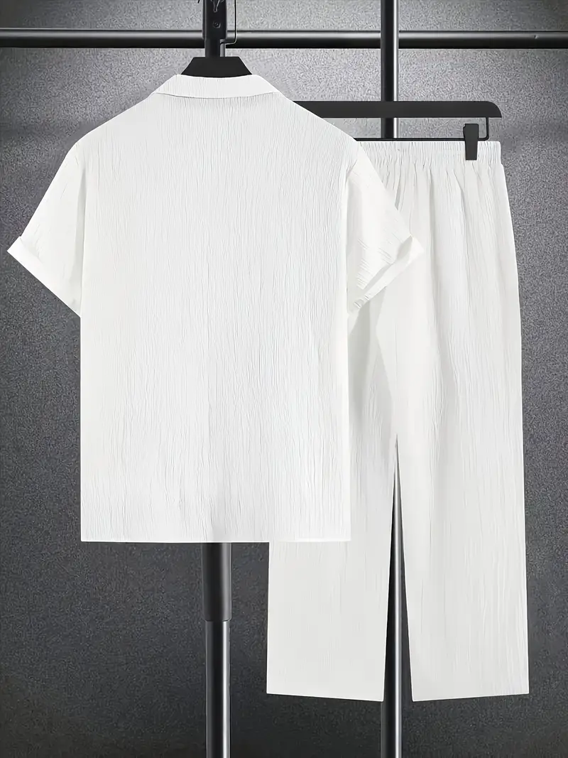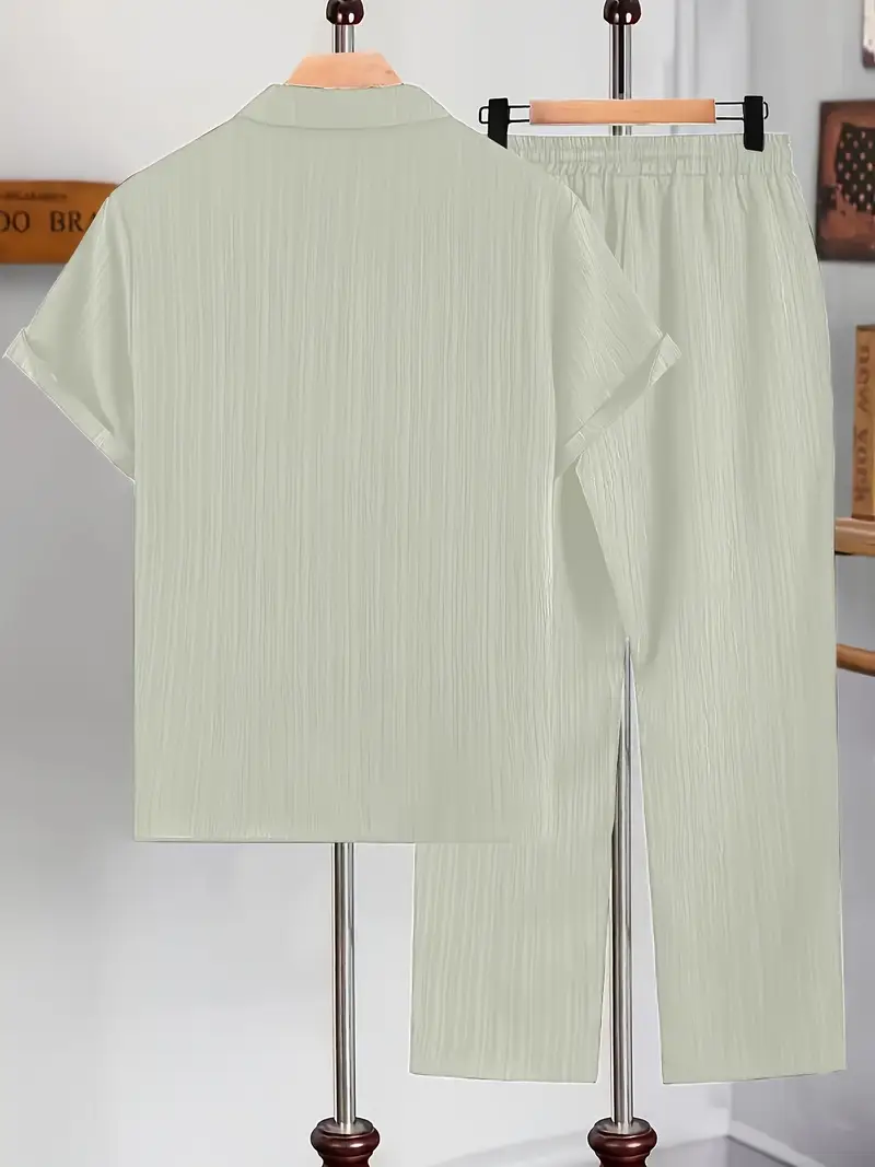 Erkaklar uchun 2 qismli tasodifiy to'plam, kubalik yaka bilan tugmachali qisqa yengli ko'ylak va bahor/kovak kolleksiyasi uchun bir rangli polyester aralashmasidan tayyorlangan tortma belli shimlar.
