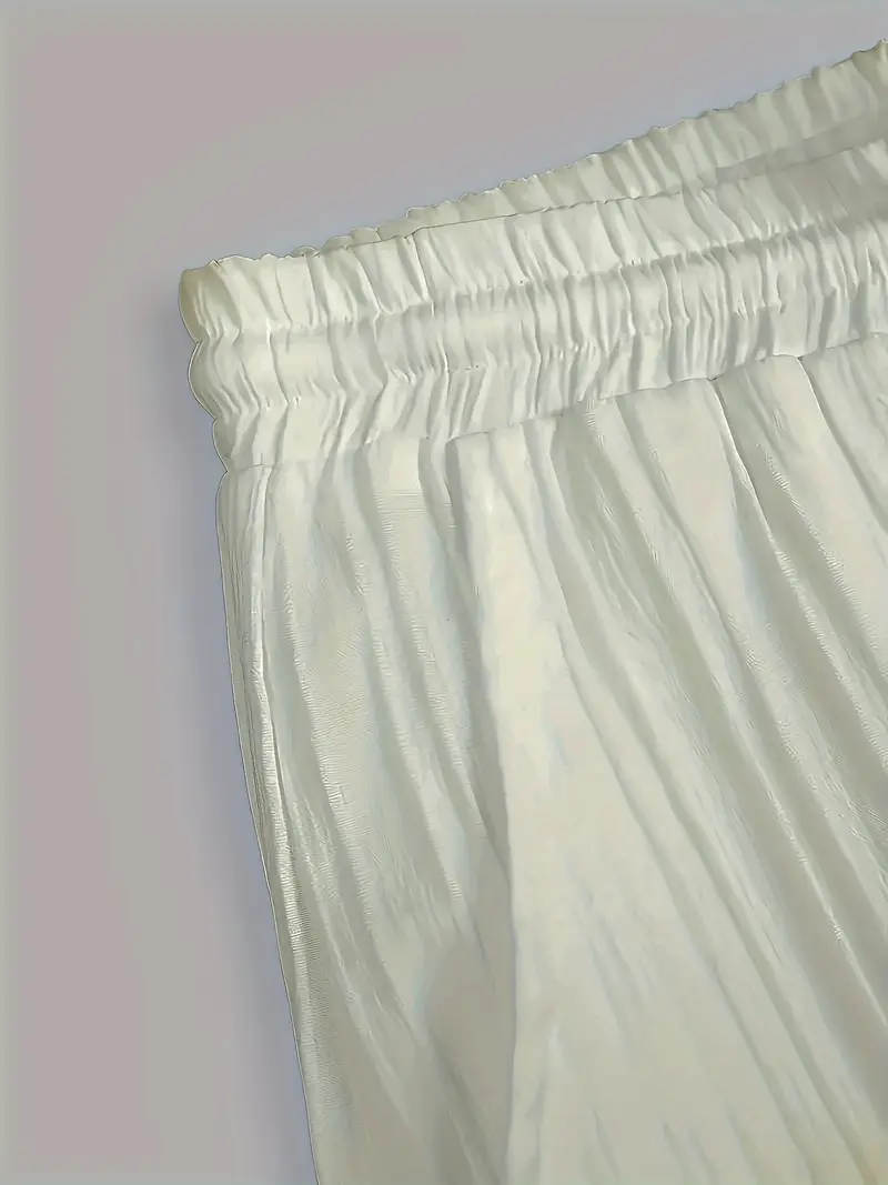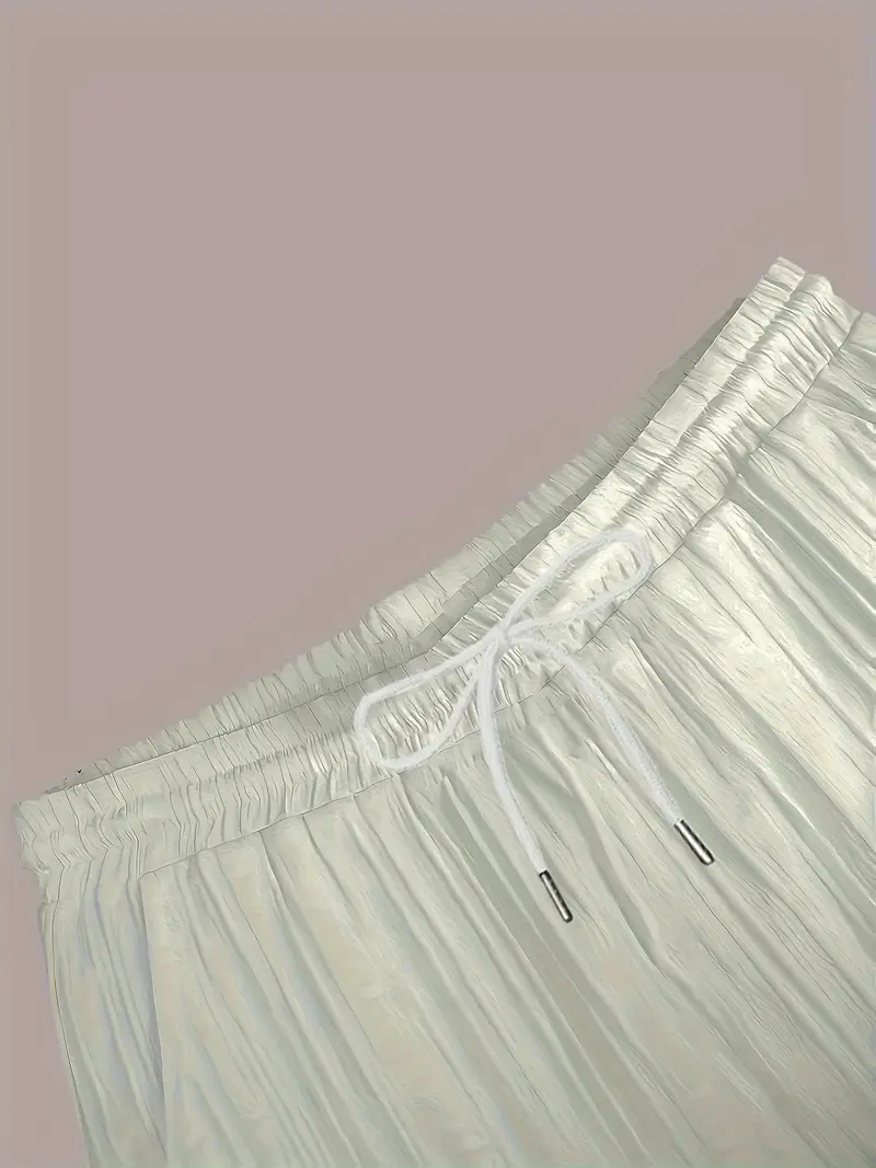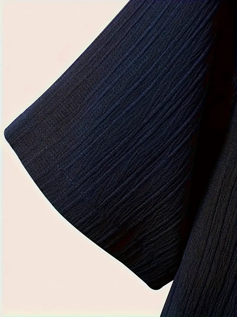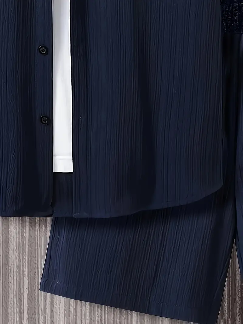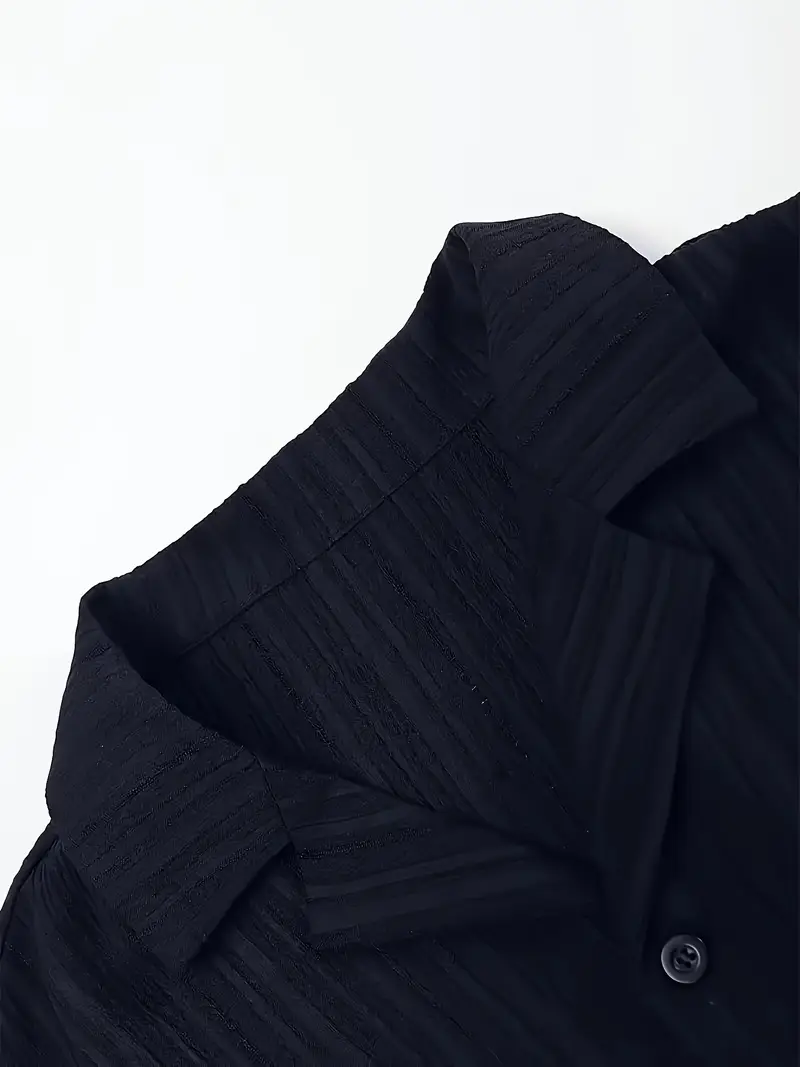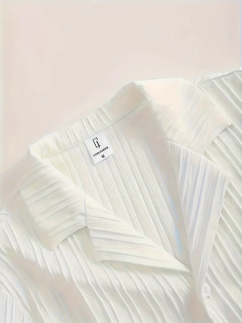 Erkaklar uchun 2 qismli tasodifiy to'plam, kubalik yaka bilan tugmachali qisqa yengli ko'ylak va bahor/kovak kolleksiyasi uchun bir rangli polyester aralashmasidan tayyorlangan tortma belli shimlar.