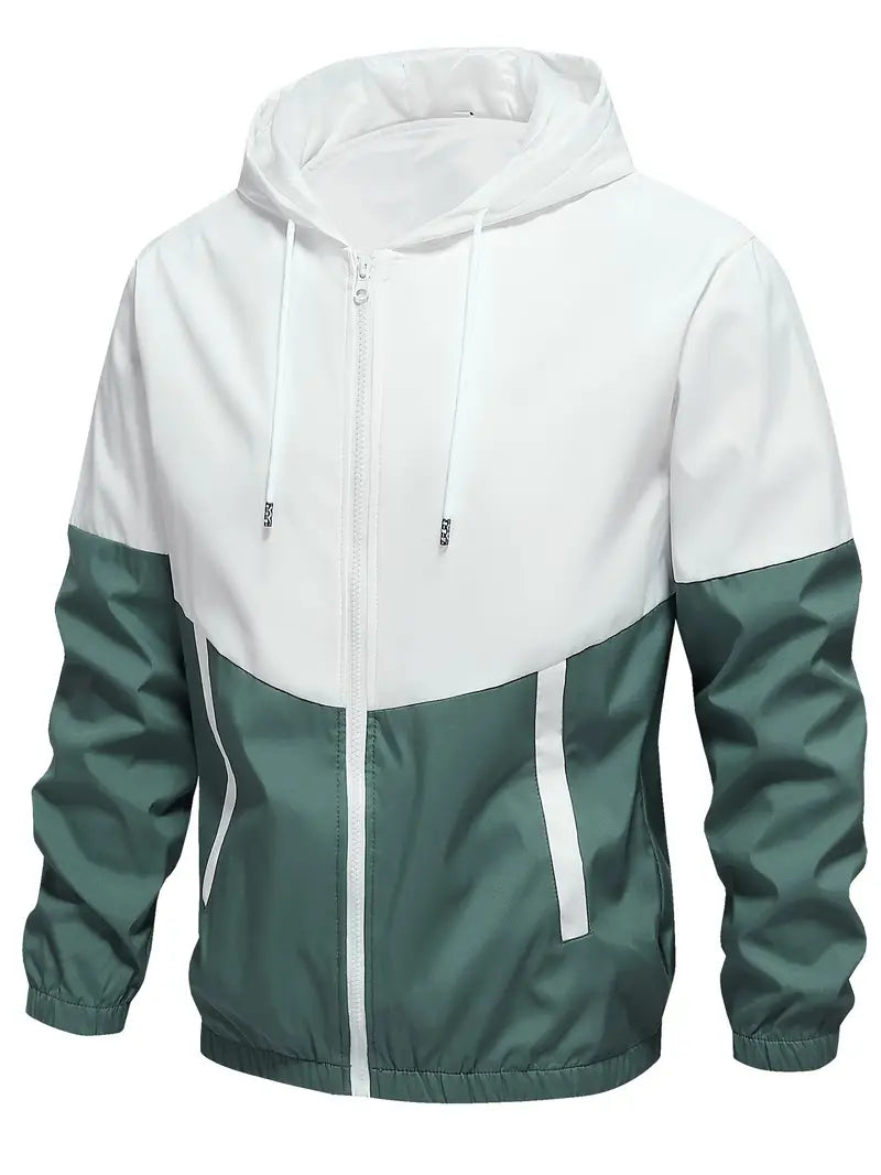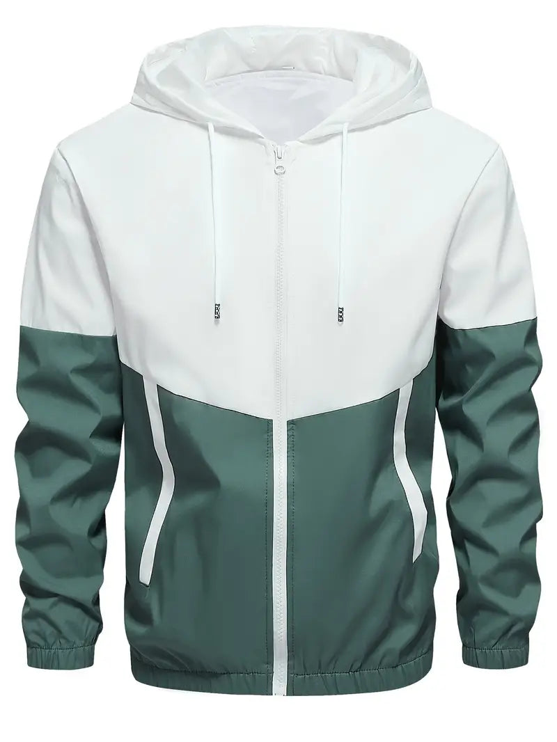 Erkaklar uchun 2-qismli tasodifiy sport to'plami, uslubiy rang blokirovka dizayni bilan kapyushonli kurtka va shimlar, bahor yoki kuzda zamonaviy sport ko'rinishi uchun.
