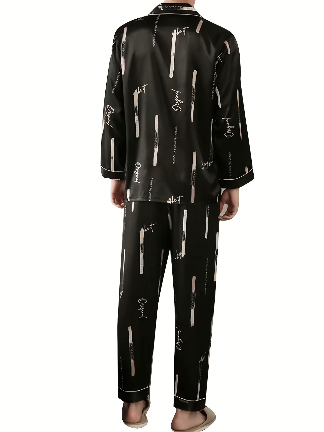 Erkaklar uchun 2 ta qismlik pijama to'plami, uzun qo'lqonli, yengil yaka, harf chiziqli naqsh. 95% polyester va 5% elastan to'qilgan matodan tayyorlangan, barcha mavsumlar uchun qulay. 110gsm, nafis va mustahkam.