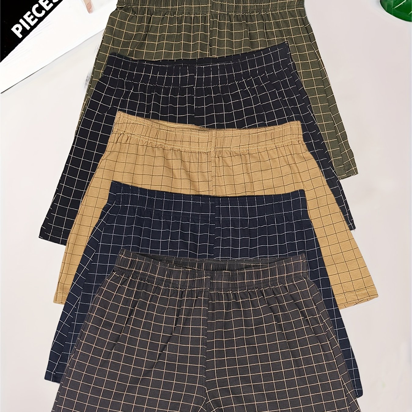 Erkaklar uchun 5 ta to'plam klassik plitkali paxta boxer shortlari, elastik bel bilan, 95% paxta, 5% spandeks, 155g/m², uy va plyaj kiyimlari uchun keng kesim.
