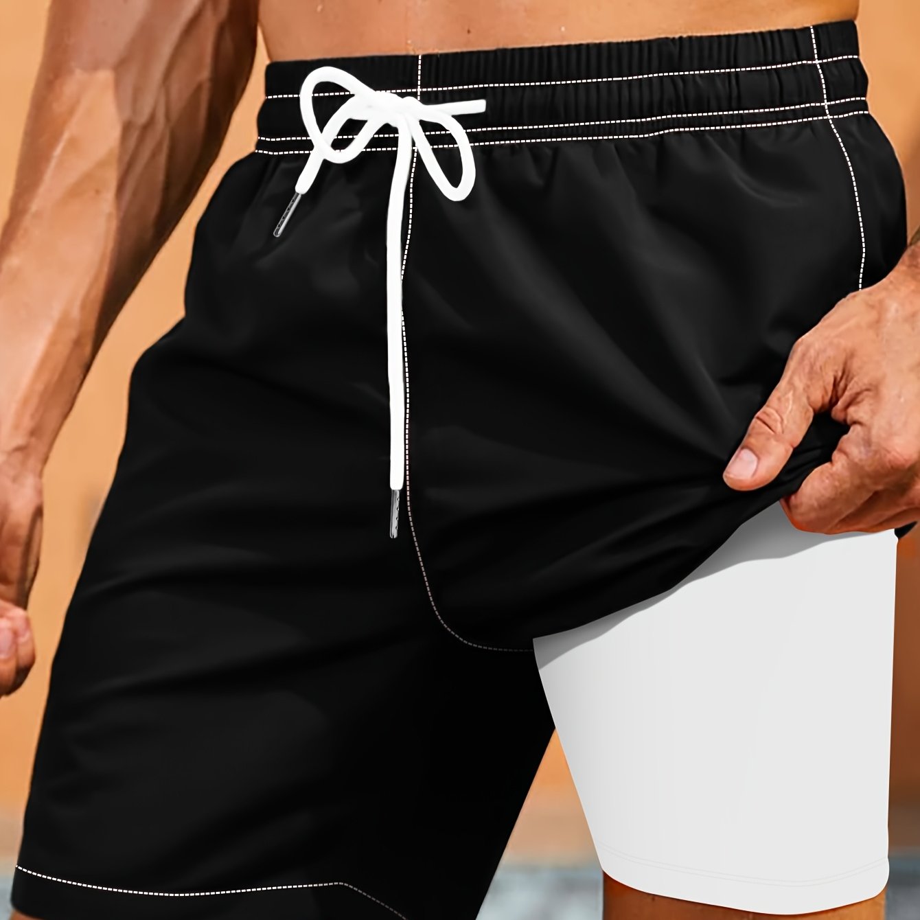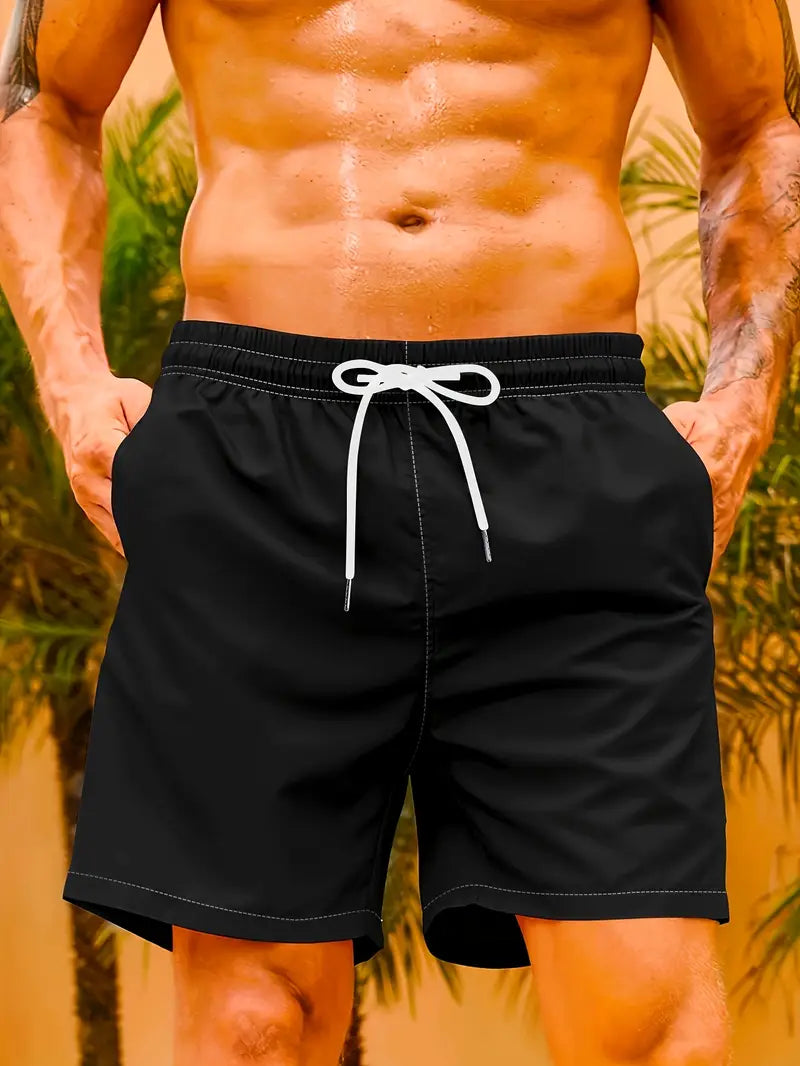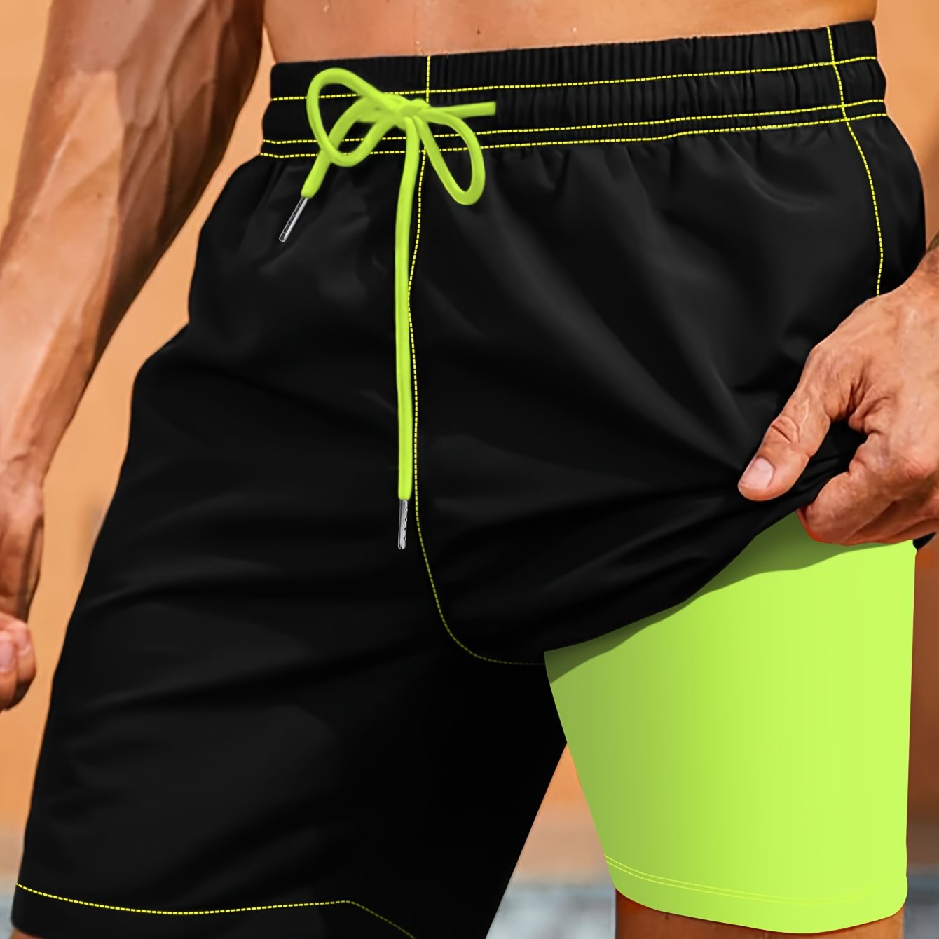 Erkaklar uchun qora plyaj shortiklari neon yashil aksentlar bilan, elastik bel, polyester/spandeks aralashmasi. Mashinada yuvish mumkin, katta o'lcham.