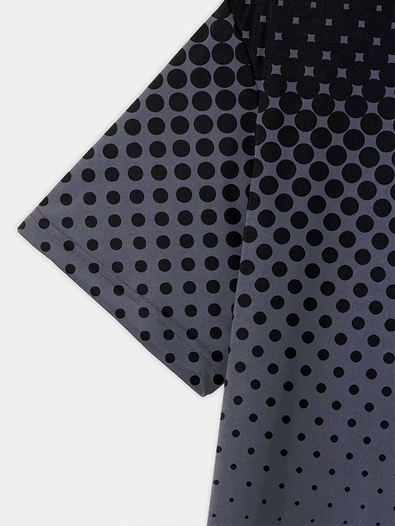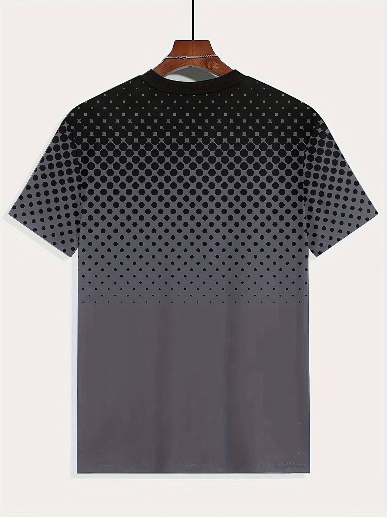 Erkaklar uchun qora tekis to'rli futbolka, klassik plid dizayni va gradiyent ko'k nuqta bosmasi bilan, polyester matodan tayyorlangan. Tasodifiy sport va plyaj uslubi, dumaloq bo'yin, mashinada yuvish mumkin.