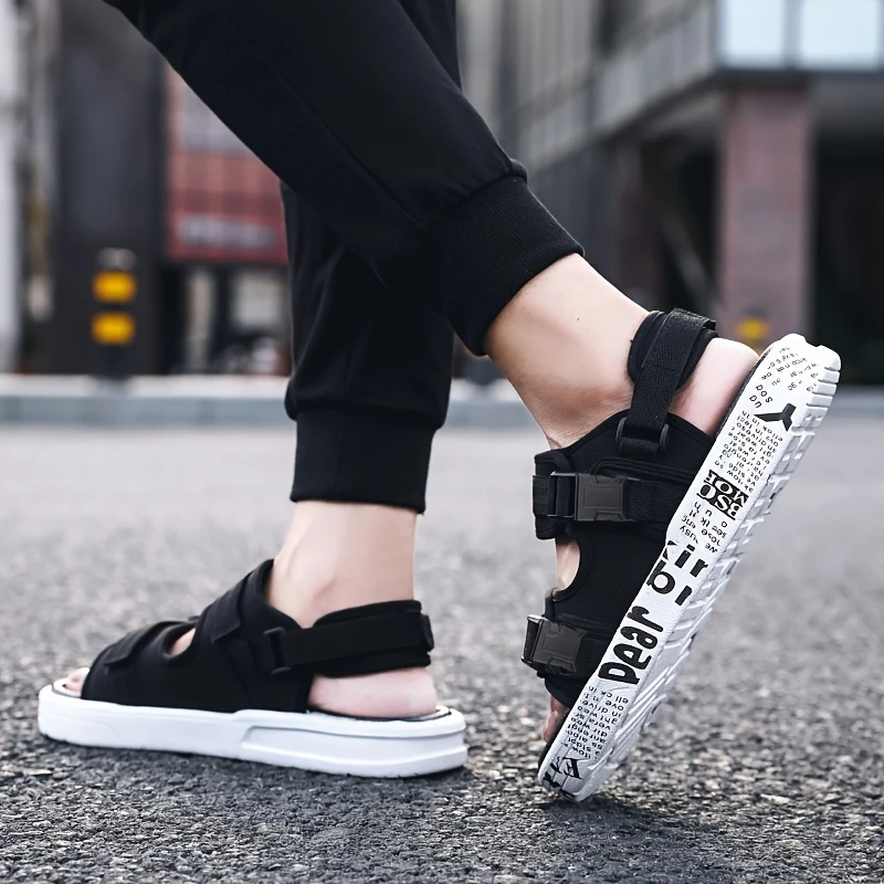 Erkaklar uchun qora mato sandallar, sariq "DEAR" bosma, qopqoq va lenta bilan yopish, sirpanmas kauchuk taglik, ochiq havoda plyajda kiyish uchun qulay.