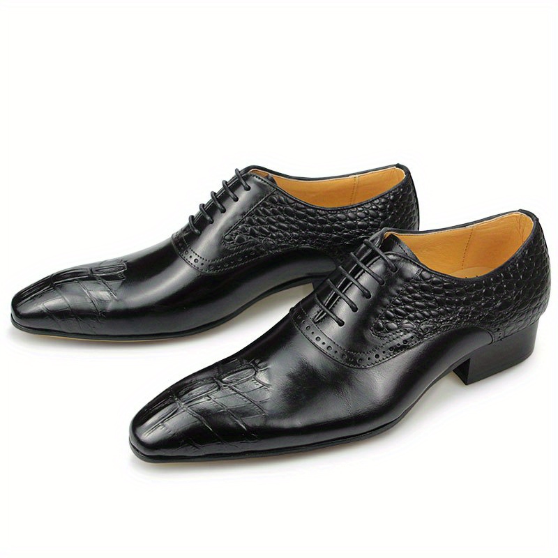 Erkaklar uchun qora Oxford kiyim poyabzallari yuqori sifatli teridan tayyorlangan bo'lib, krokodil naqshiga ega, bog'ichli yopish, uchburchak barmoq va biznes va rasmiy tadbirlar uchun mos yuqori sifatli kauchuk taglikka ega.