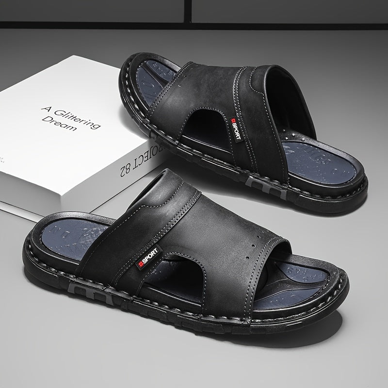 Yozgi plyaj kiyimlari uchun mustahkam mikrofiber sintetik yuqori qismi va kauchuk taglikka ega bo'lgan erkaklar uchun nafas oladigan slayd sandallar.
