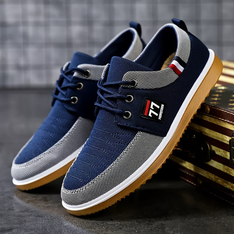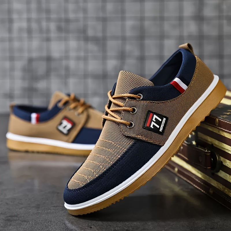 Erkaklar uchun tasodifiy kanvas krossovkalar, dengiz ko'k va bej rangli blok dizayni, yengil, nafas oladigan, mustahkam taglik, qulay astar, ish va dam olish uchun ideal.