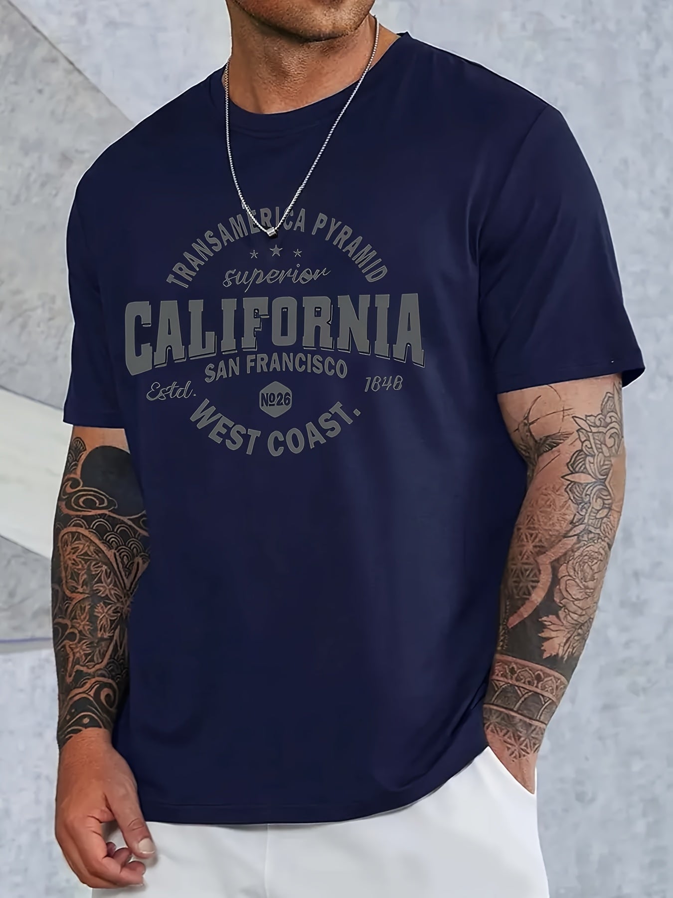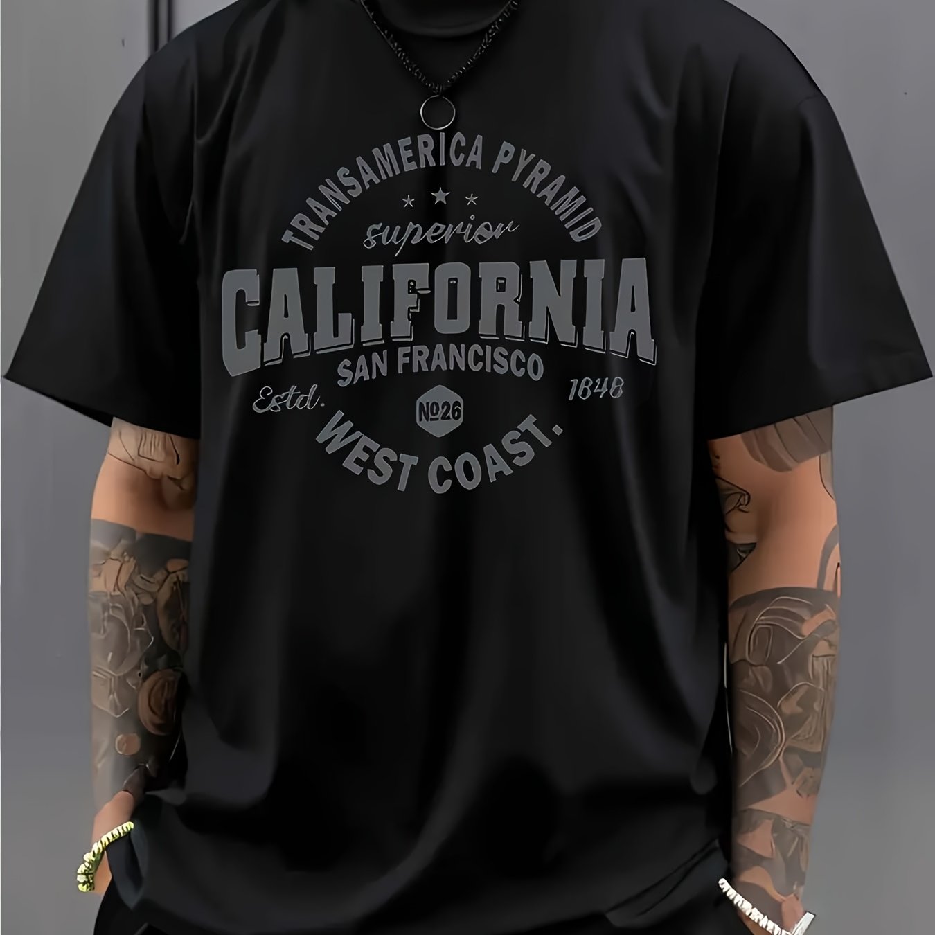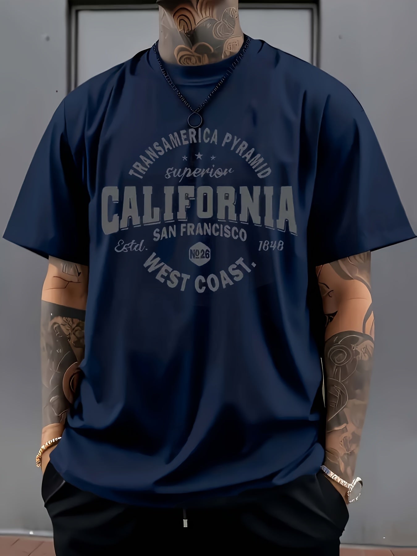 Erkaklar uchun tasodifiy krujka bo'yinli futbolka, Kaliforniya grafikasi, 3D raqamli bosma, polyester to'qima matodan tayyorlangan, ozgina cho'zilishi bilan odatiy moslik uchun. Har mavsumda kundalik va tasodifiy kiyim uchun mos.