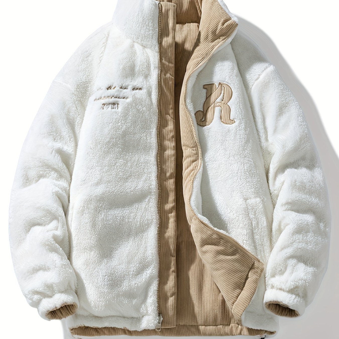 Erkaklar uchun tasodifiy to'quv ko'ylak, tikilgan harf bilan, ikki tomonlama kiyish, bir rangda, uzun qo'lqon, turli xil yeng, zip-up yopilishi, to'qilgan mato, polyester astar, oddiy moslik.