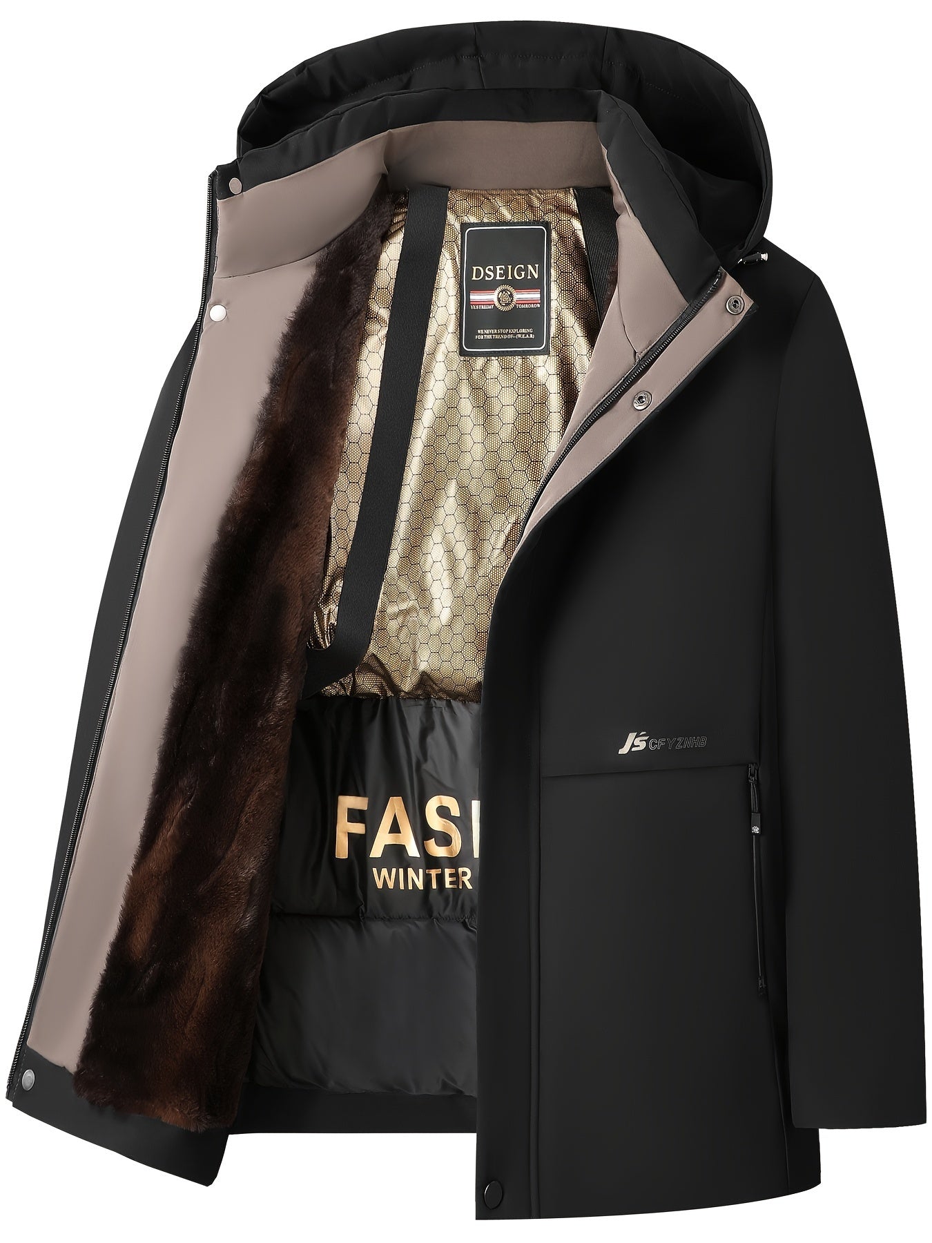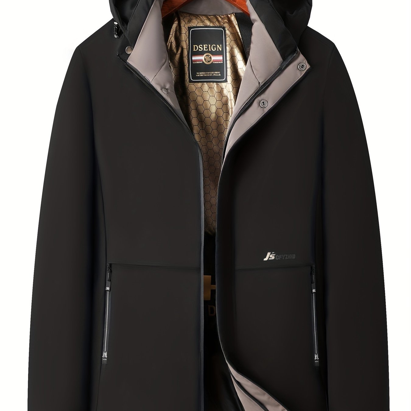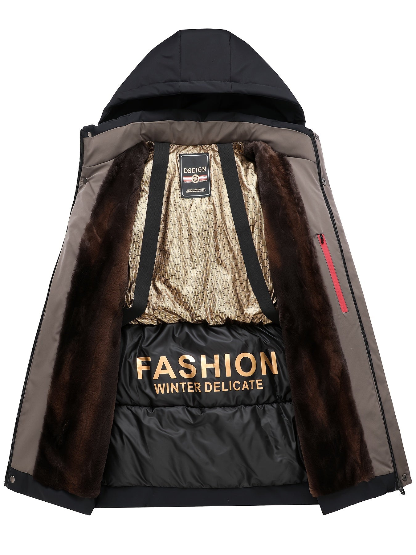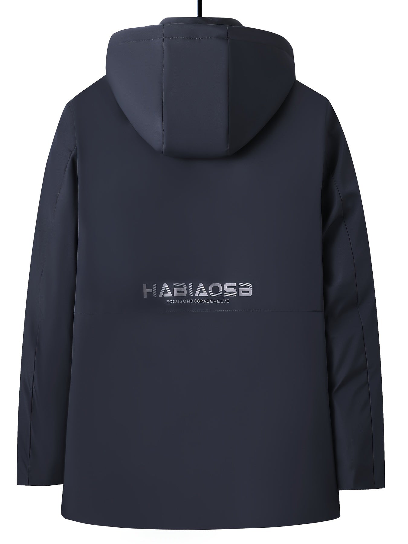 Erkaklar uchun tasodifiy kapüşonli poliester to'ldirilgan kurtka, alfavit naqshi, zip plakat va qishki issiqlik uchun poliester tolasi bilan.
