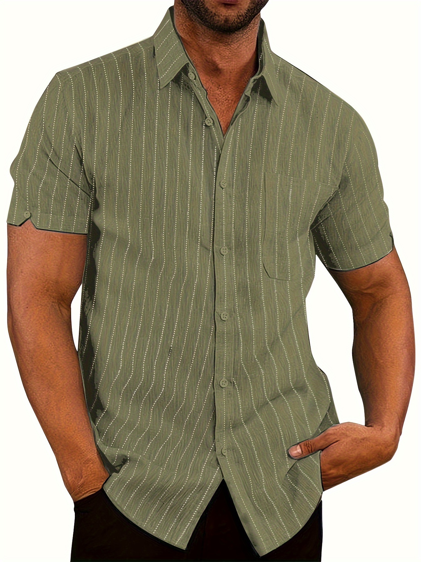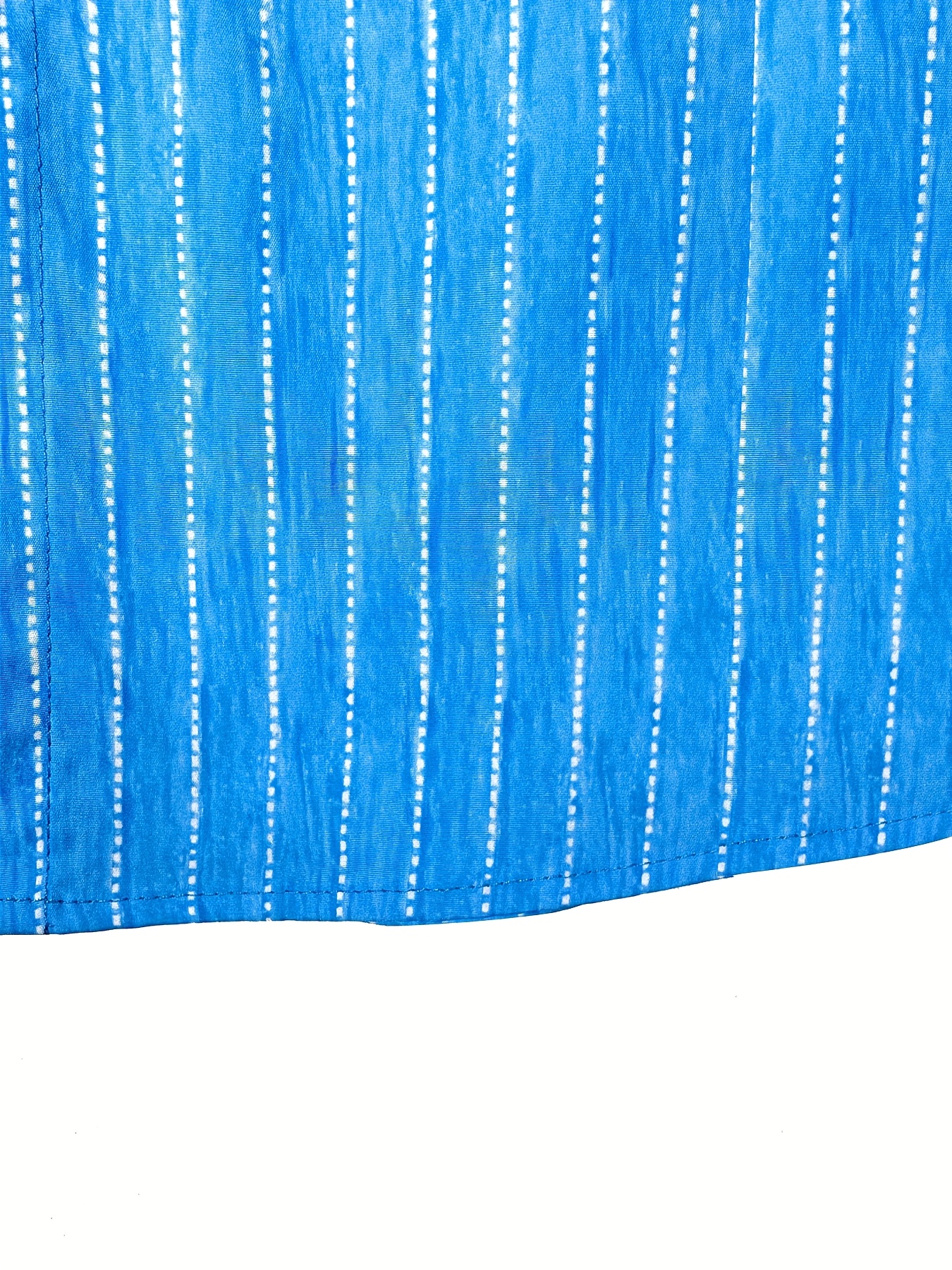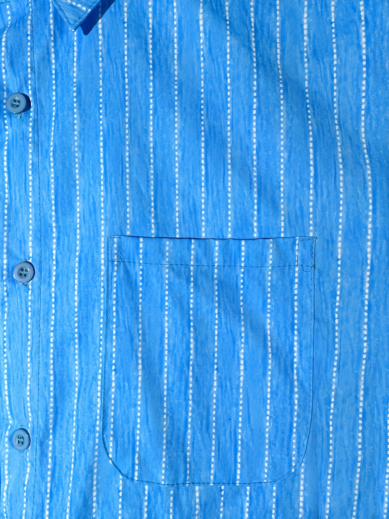 Erkaklar uchun tasodifiy engil ko'k chiziqli tugmachali ko'ylak 100% polyester to'qilgan matodan tayyorlangan, oq aksentlar bilan. Yelka yengil, qisqa yenglar va ko'krak cho'ntagi bilan, odatiy moslikda. Mos keladi.