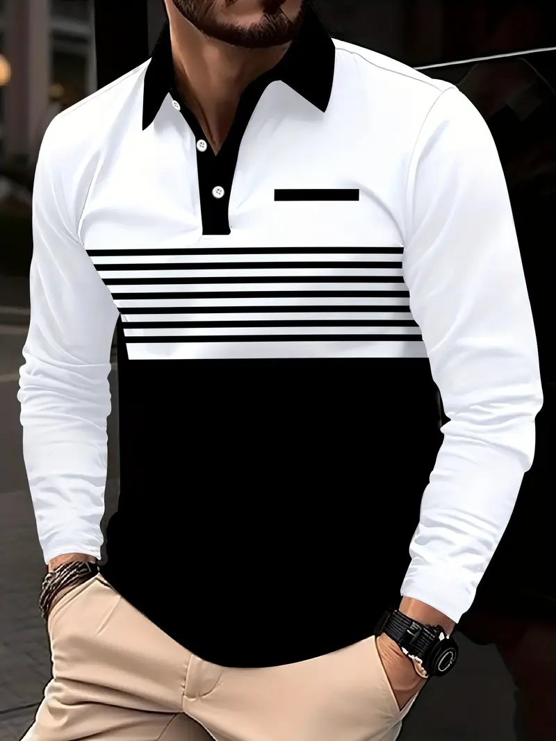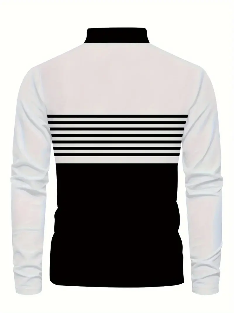 Erkaklar uchun tasodifiy uzun qo'l polo ko'ylagi, polyester yaka, butun yuzada chop etilgan, ozgina cho'ziladigan mato, bahor/kovakda ochiq havoda golf ko'chmasi uchun odatdagi moslik, katta o'lchamda.