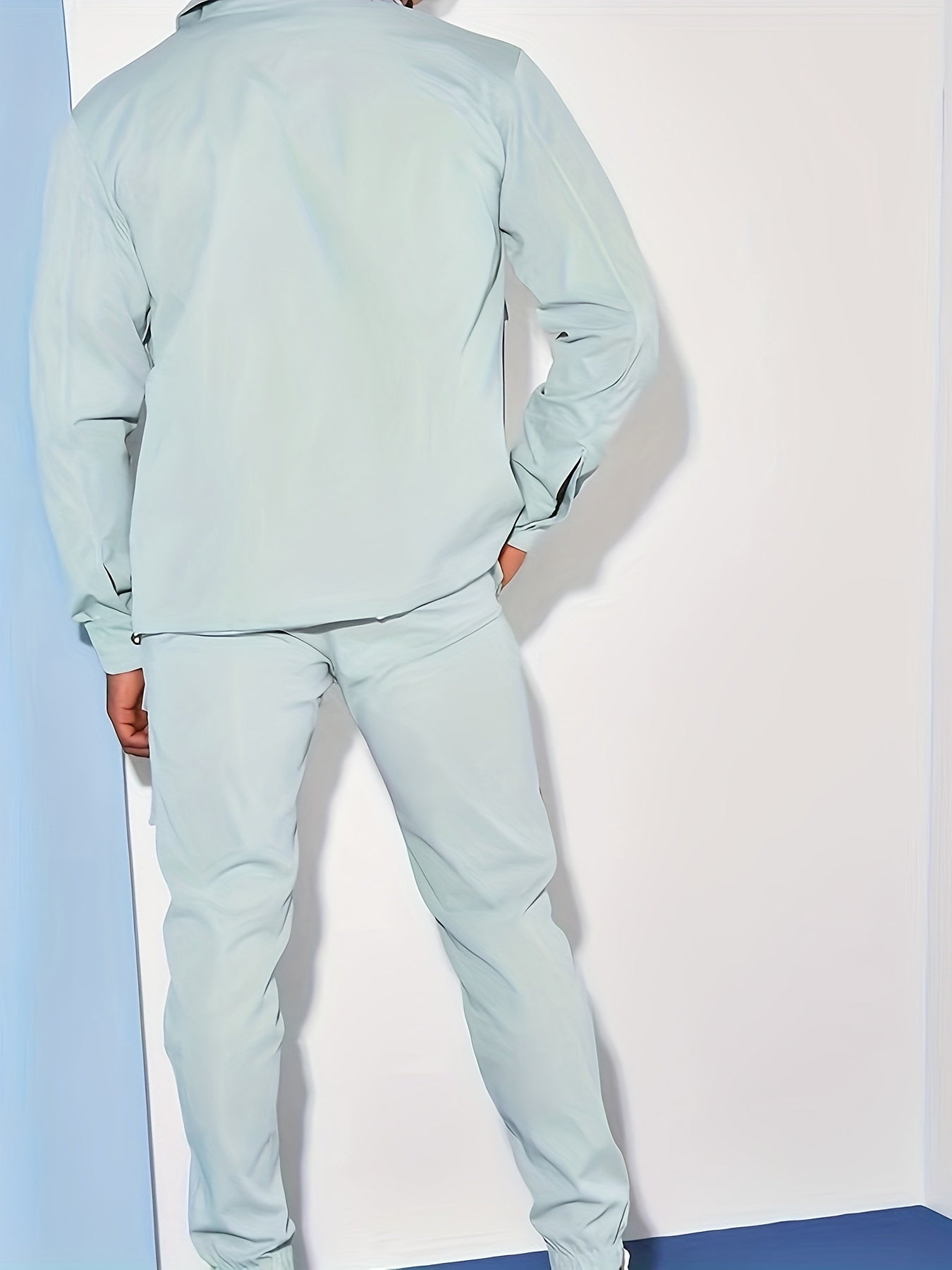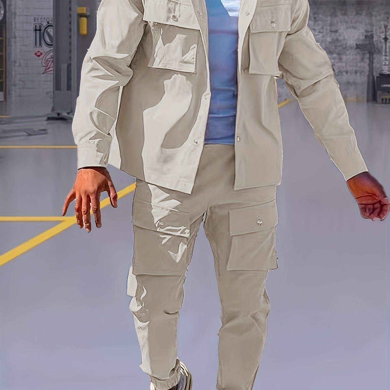 Erkaklar uchun tasodifiy kiyim to'plami bir rangli tugmachali ko'ylak va ko'p cho'ntakli yuk shimlaridan iborat bo'lib, polyester aralashmasidan tayyorlangan. Bahor va kuz mavsumlari uchun ideal.