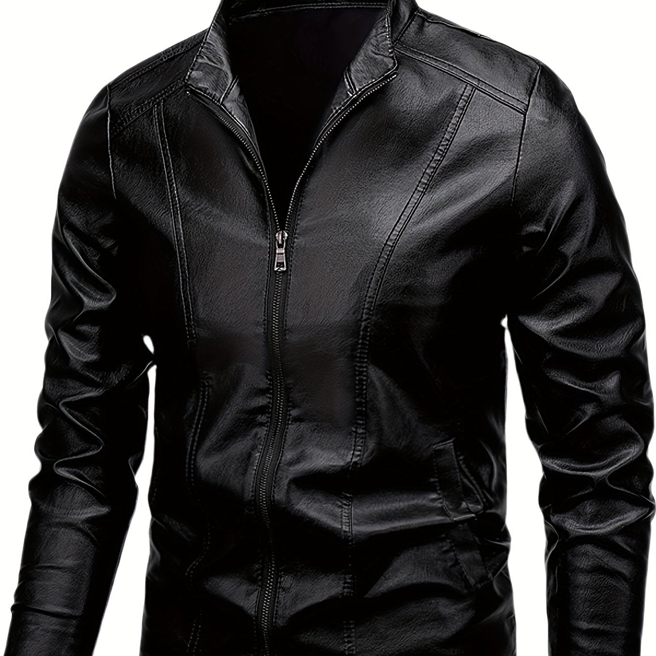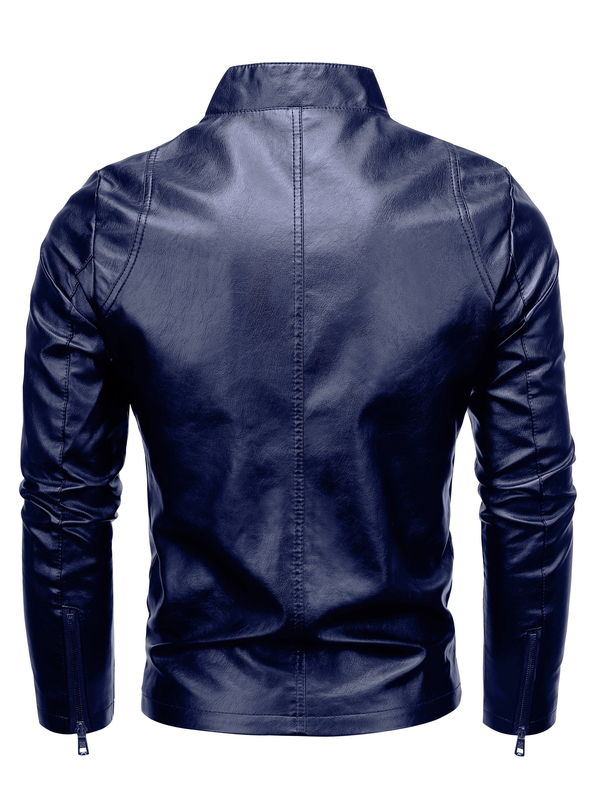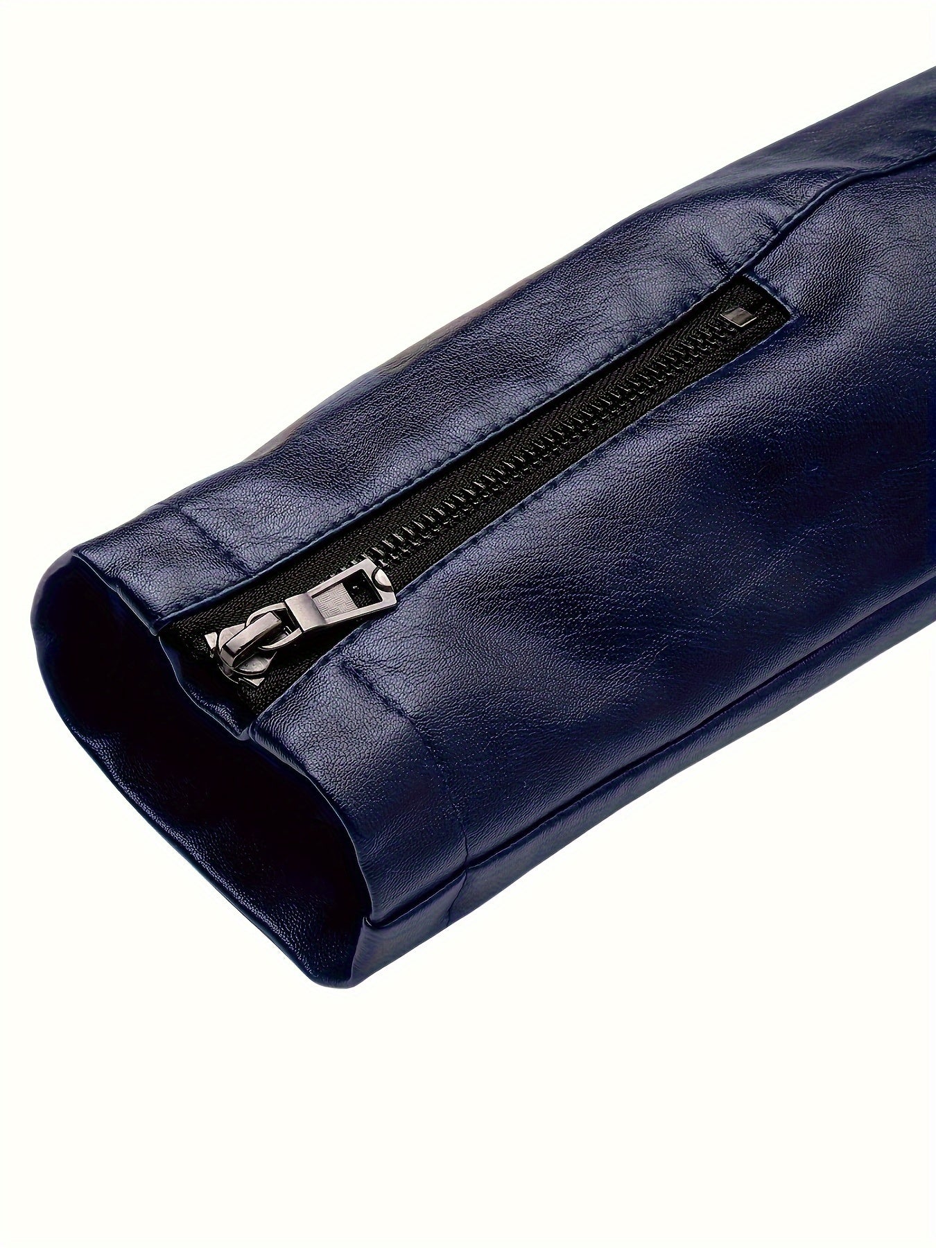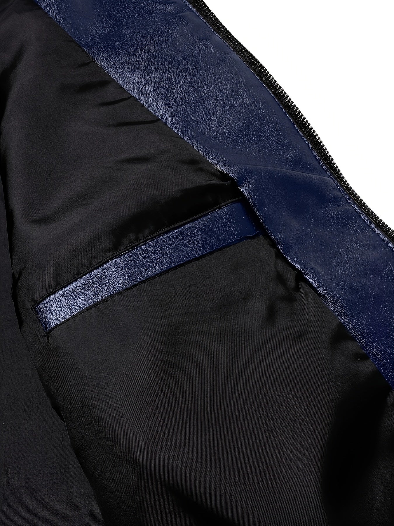 Erkaklar uchun tasodifiy PU charm kurtka, turli xil yenglar va fermuarli plakat bilan, oddiy moslashuv va uzun yenglar, cho'zilmaydigan to'qilgan moto uslubidagi tashqi kiyim.