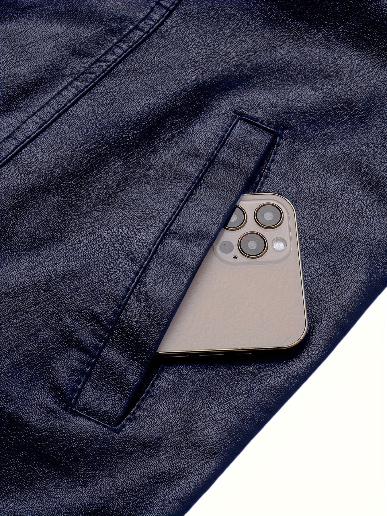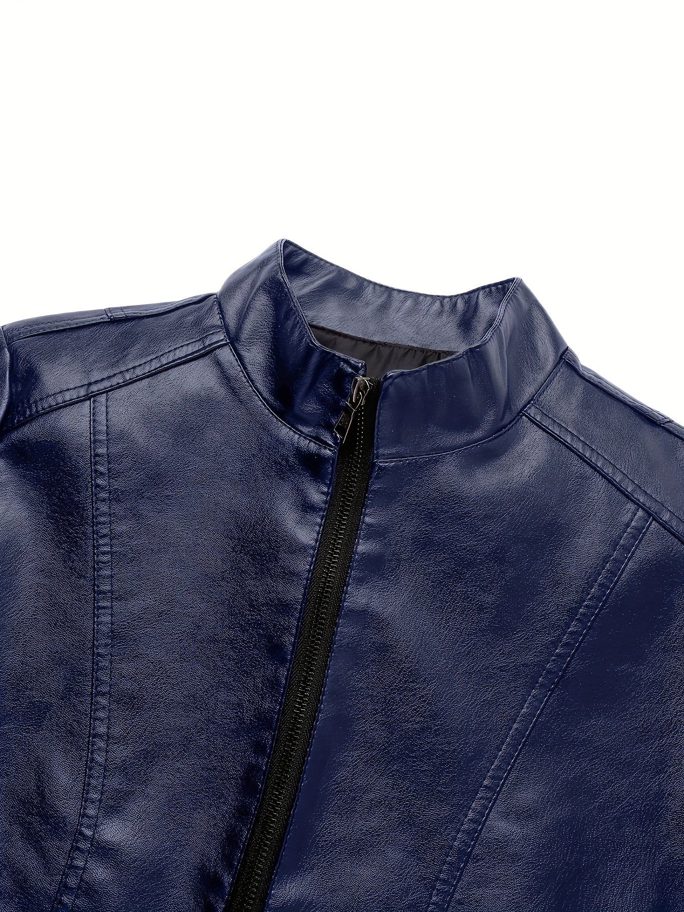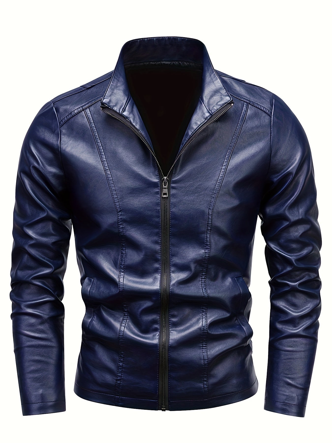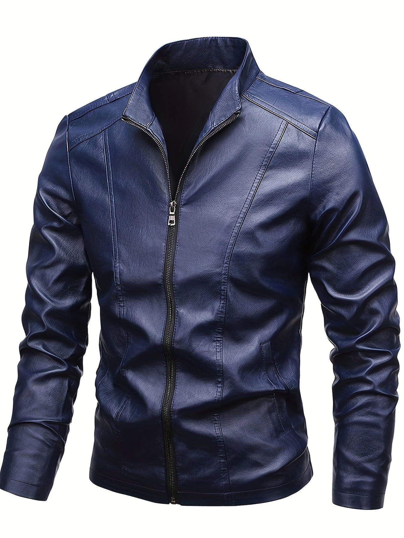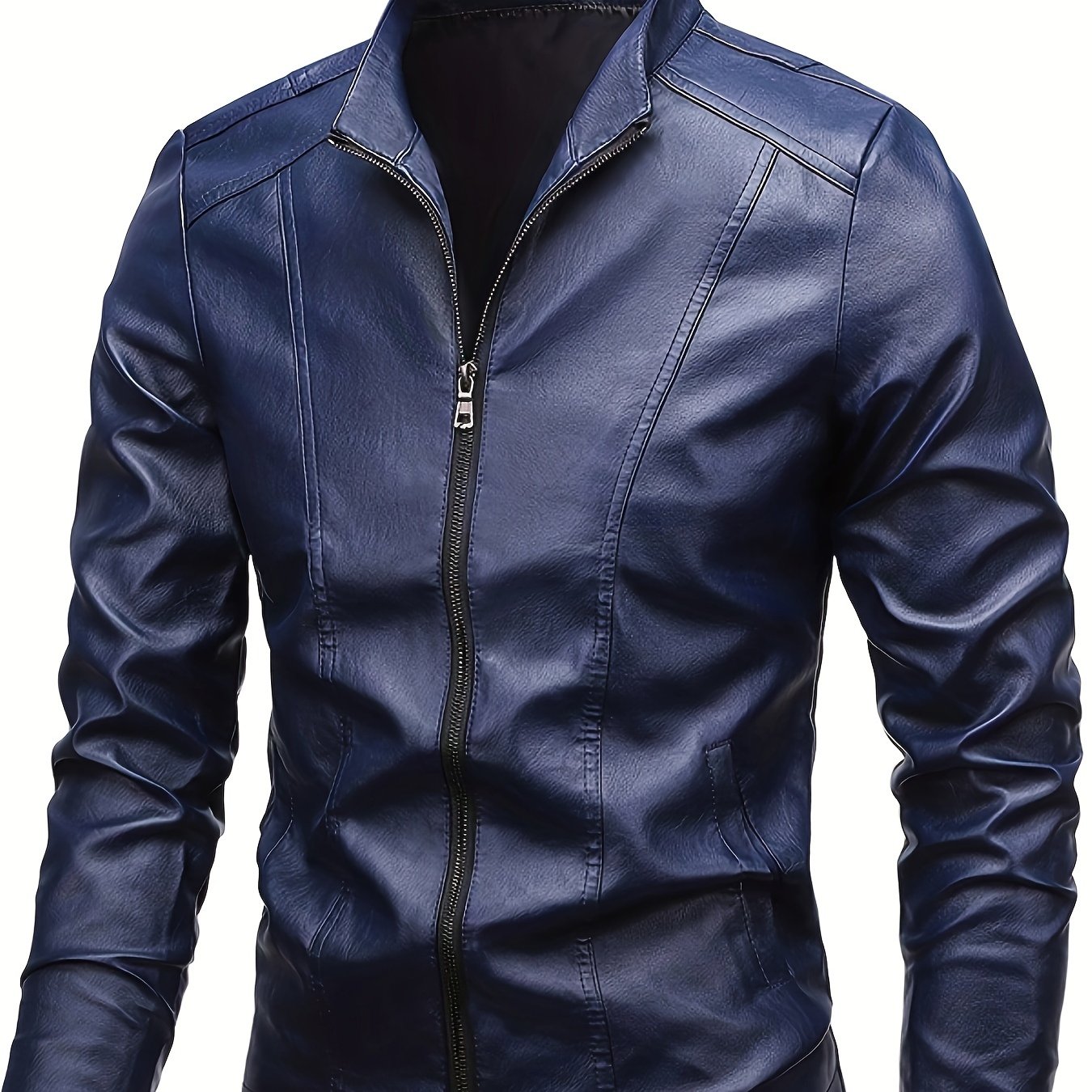 Erkaklar uchun tasodifiy PU charm kurtka, turli xil yenglar va fermuarli plakat bilan, oddiy moslashuv va uzun yenglar, cho'zilmaydigan to'qilgan moto uslubidagi tashqi kiyim.