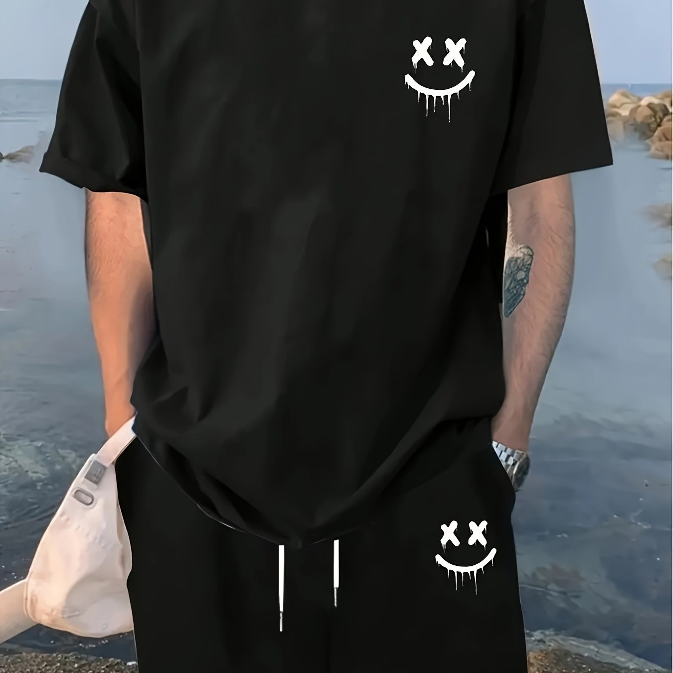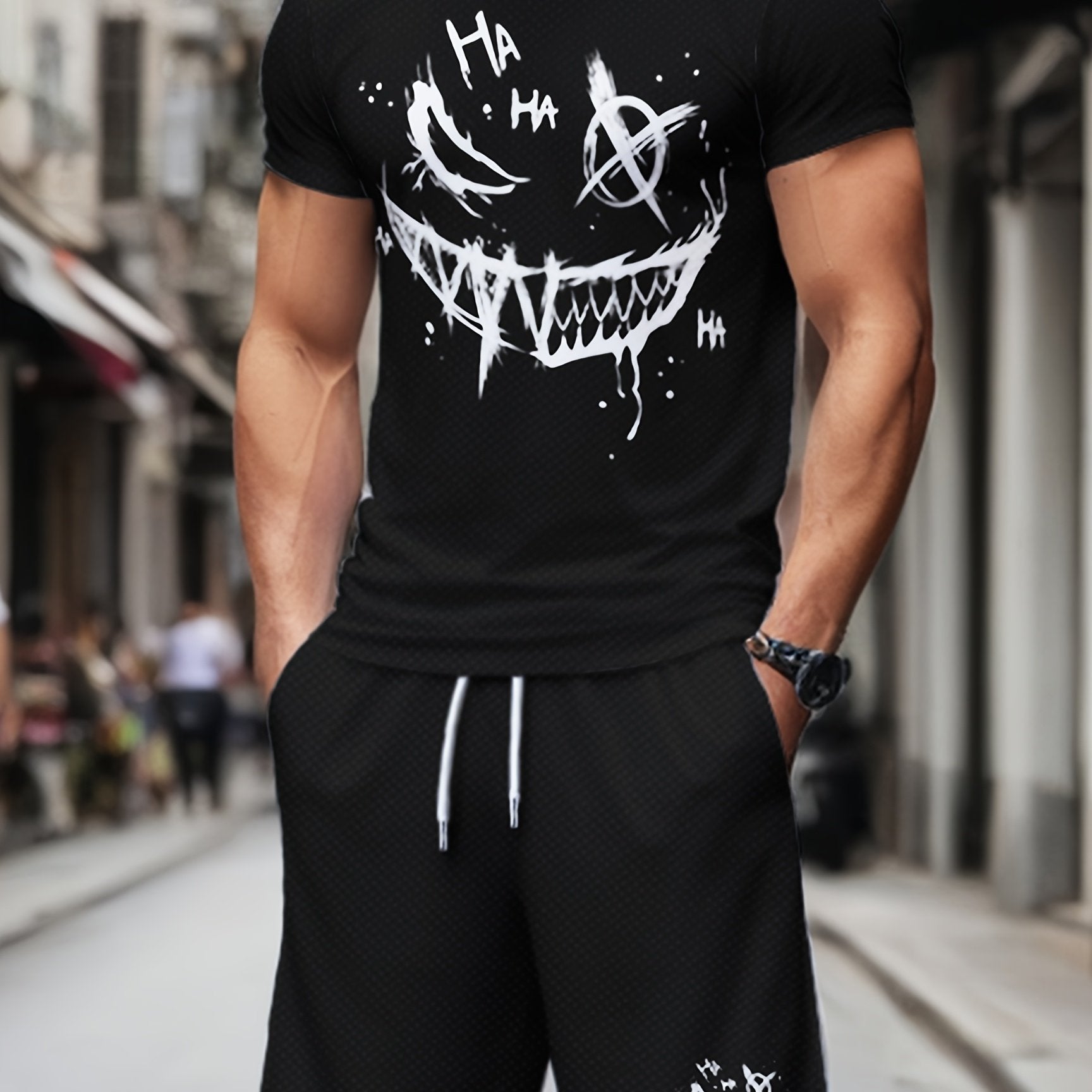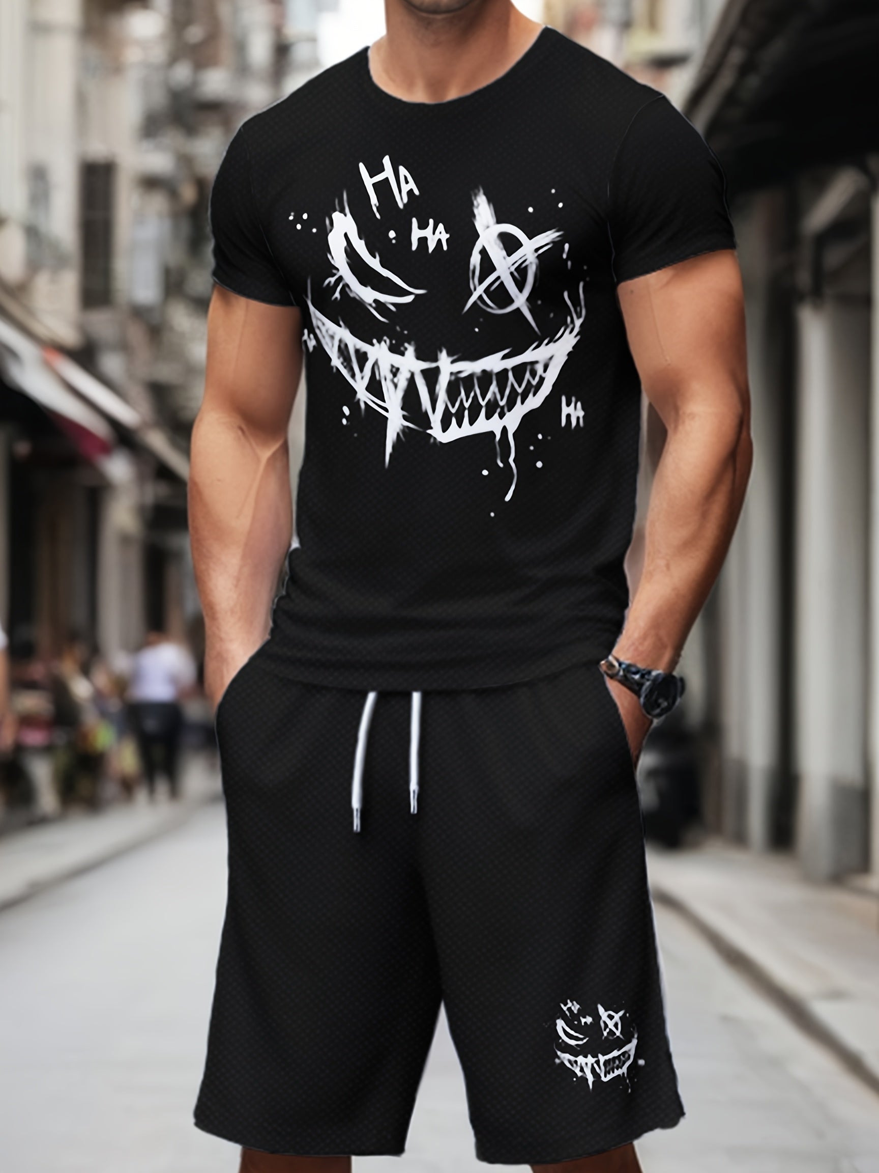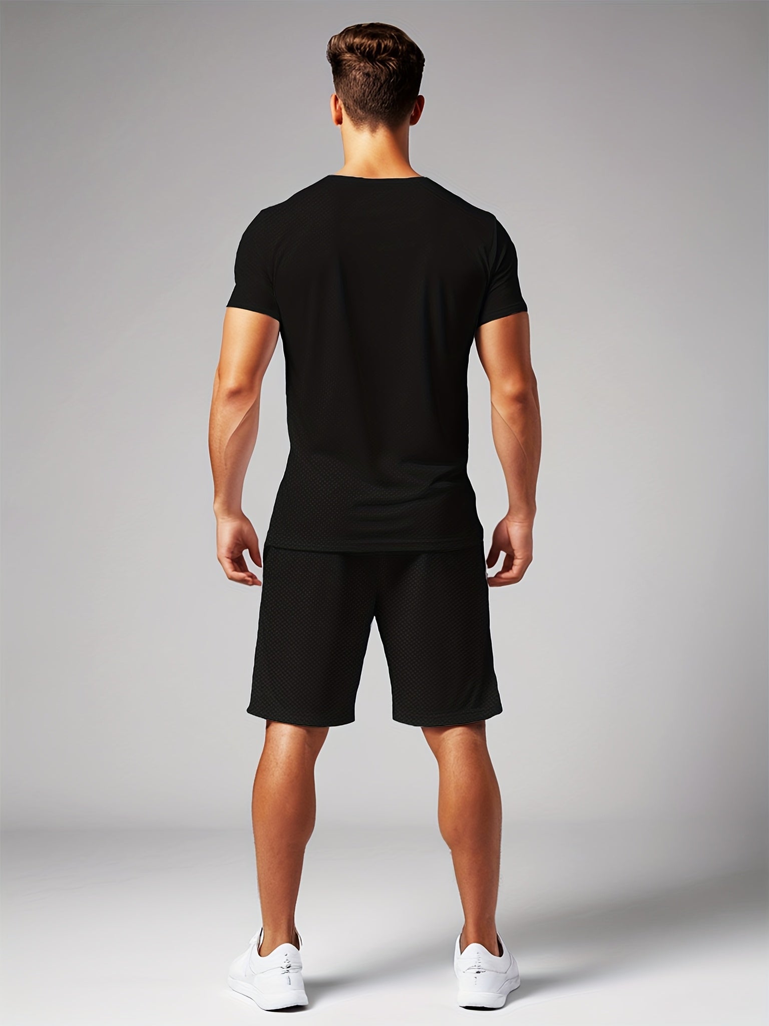 Erkaklar uchun tasodifiy qisqa yengli futbolka va shortlar to'plami, umumiy bosma bilan. Polyesterdan tayyorlangan, biroz cho'ziladigan, bu krujka yengli pullover yozgi ochiq havoda faoliyatlar uchun mukammaldir.