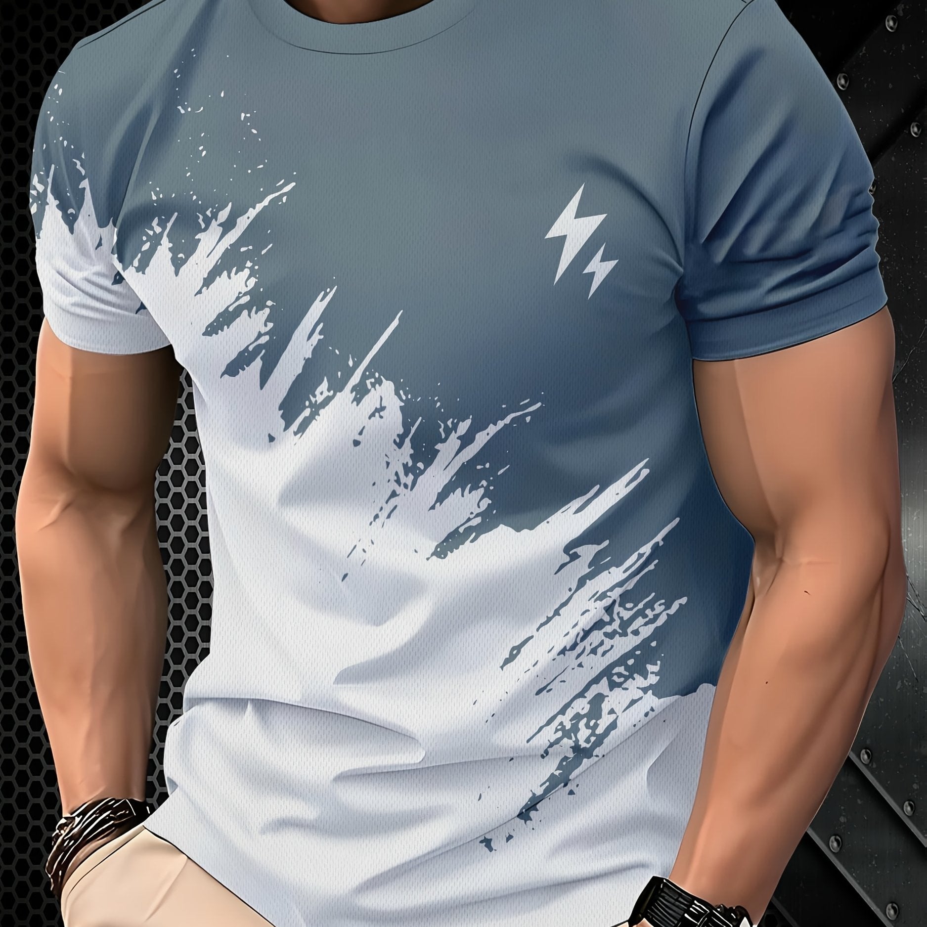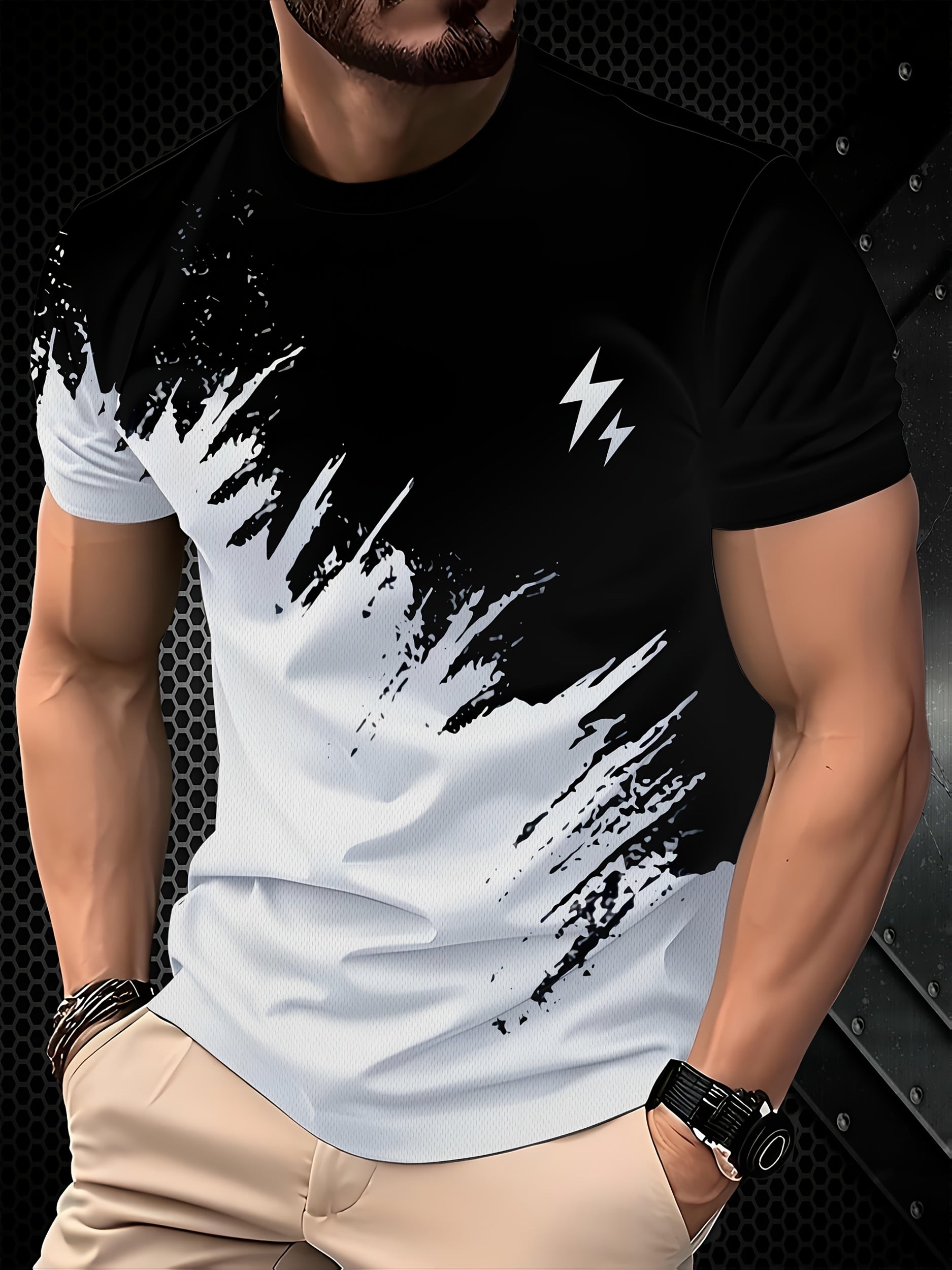 Erkaklar uchun tasodifiy qisqa qo'lqonli futbolka, 3D chaqmoq bosma, ikki rangli dizayn, dumaloq bo'yin. Polyester aralashmasidan tayyorlangan, mashinada yuvish mumkin. Yozgi ochiq havoda faoliyatlar va tasodifiy kiyimlar uchun juda yaxshi.