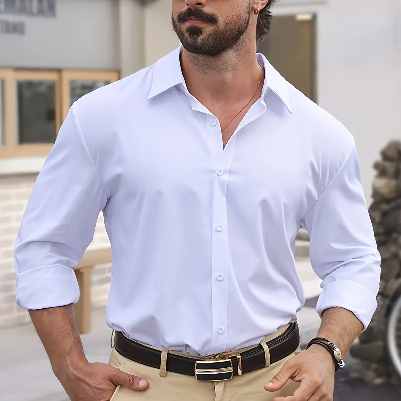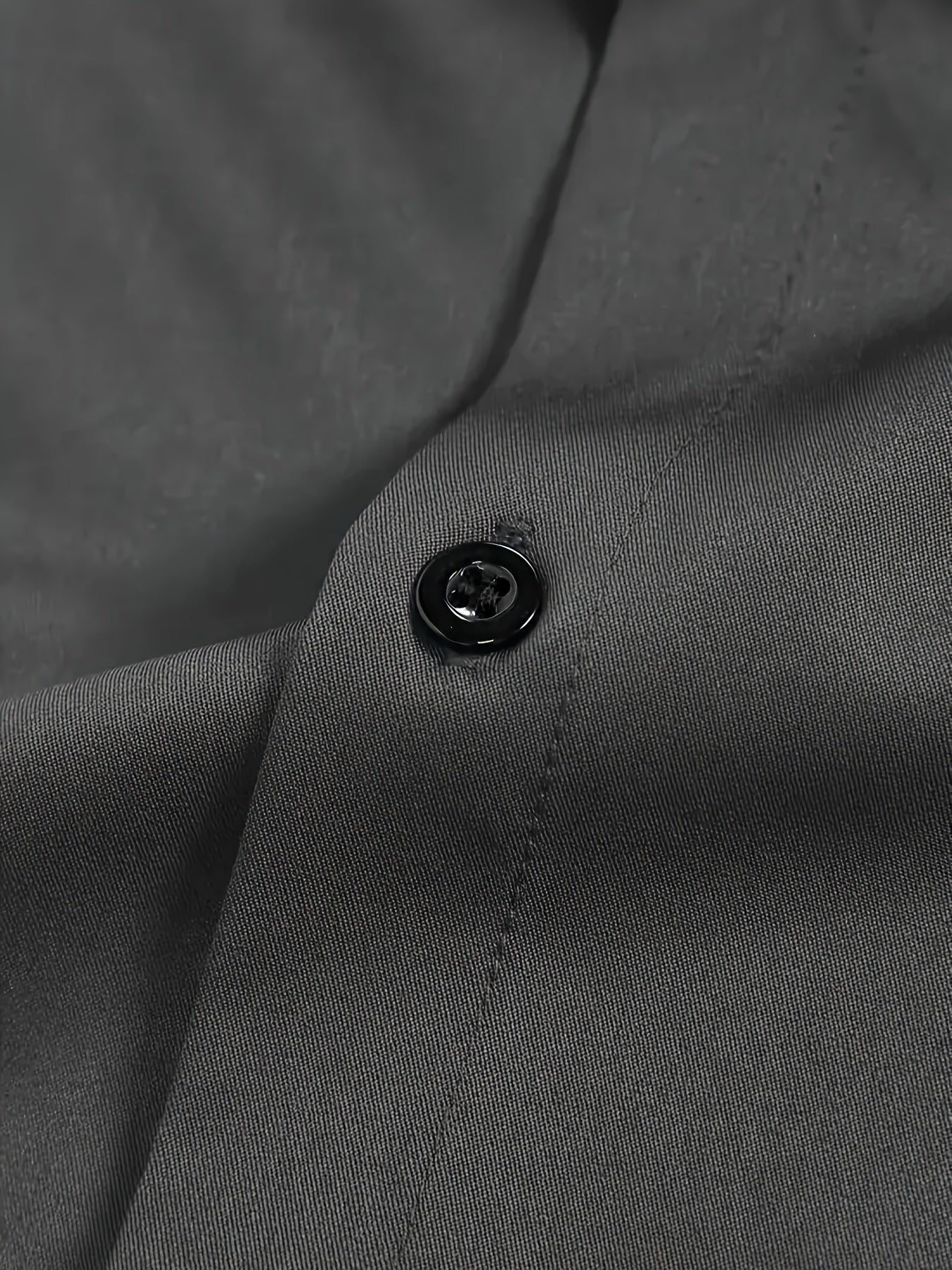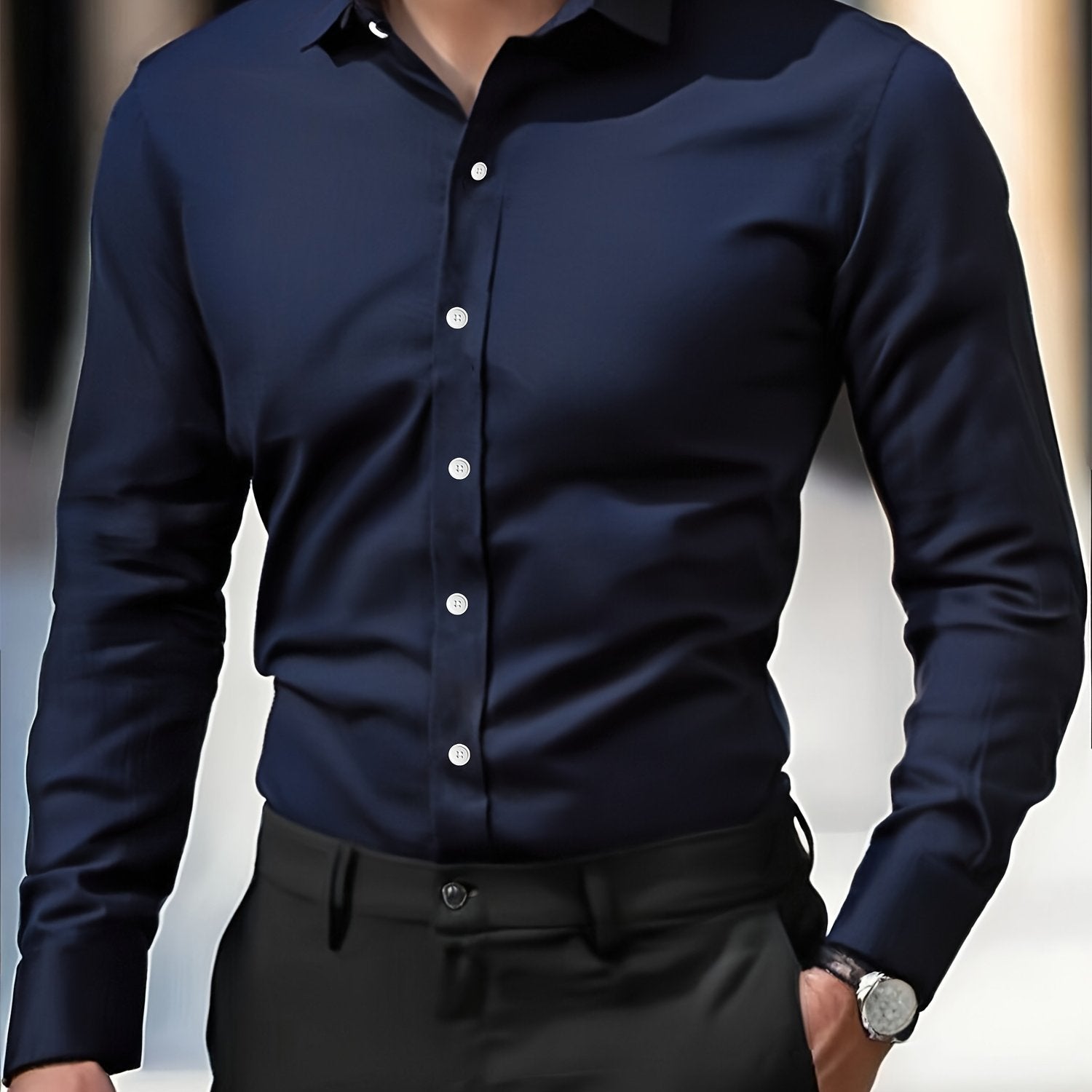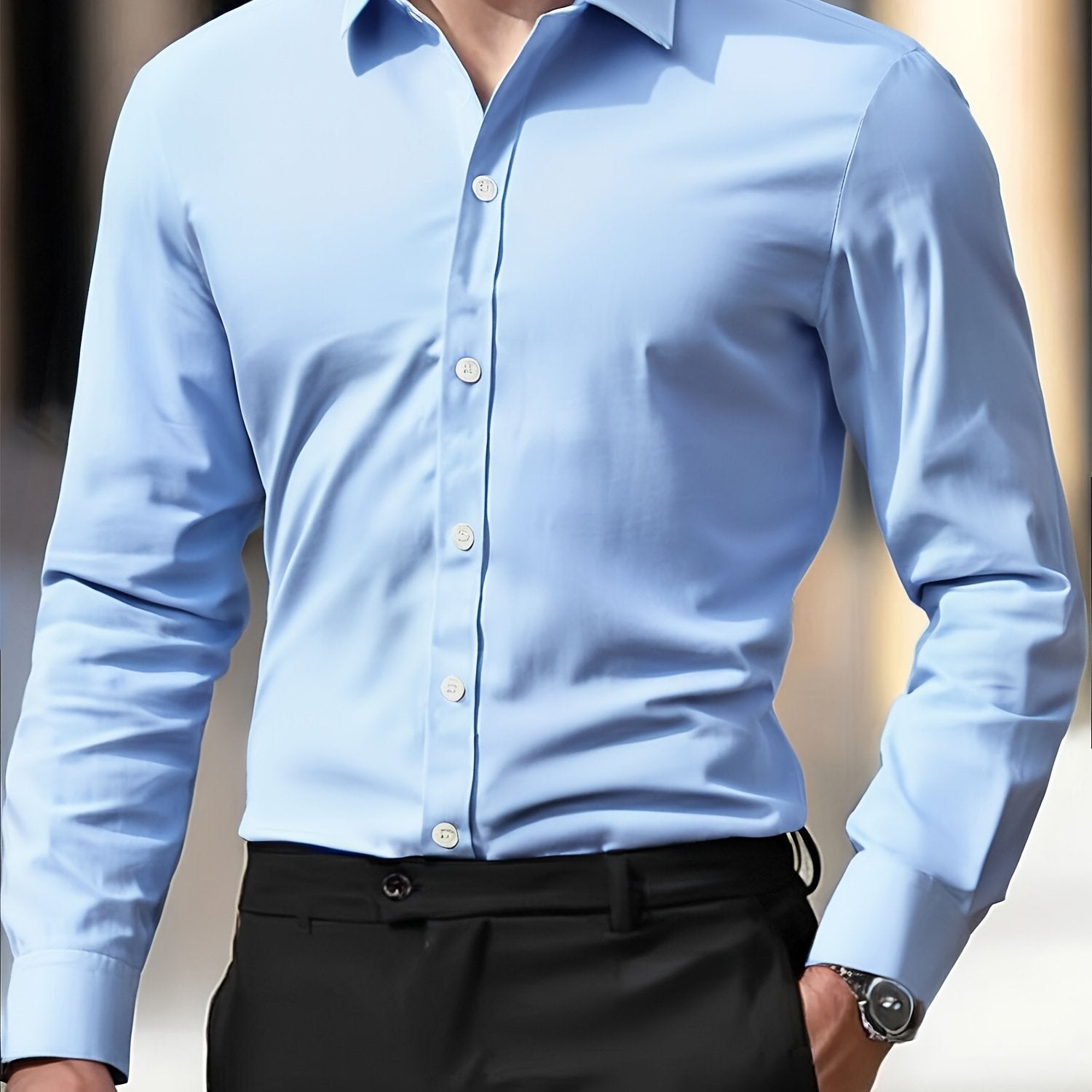 Erkaklar uchun zamonaviy uzun qo'lqopli tugmachali ko'ylak, ish va bahor/kovak uchun mo'ljallangan, cho'zilmaydigan polyesterdan tayyorlangan.