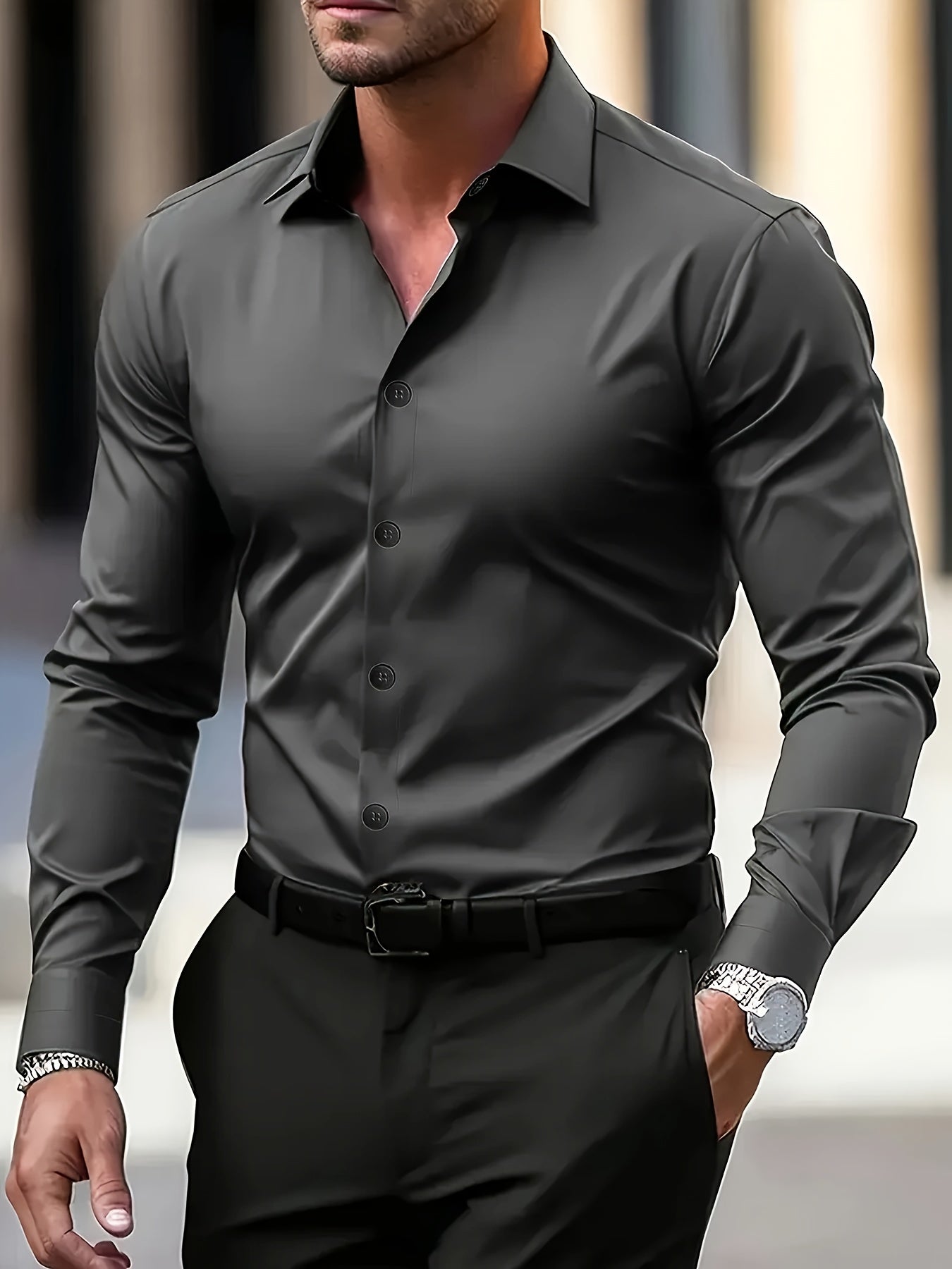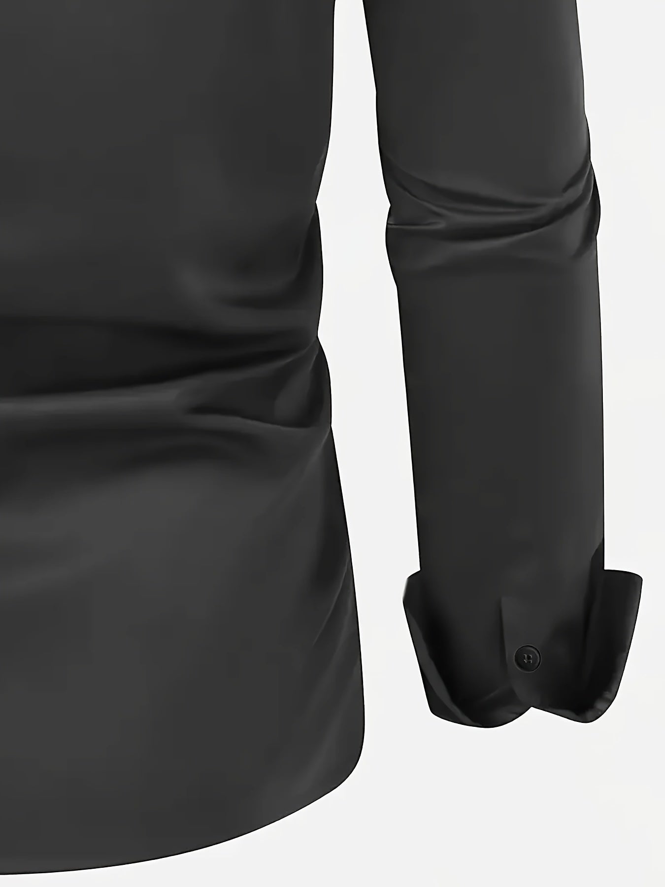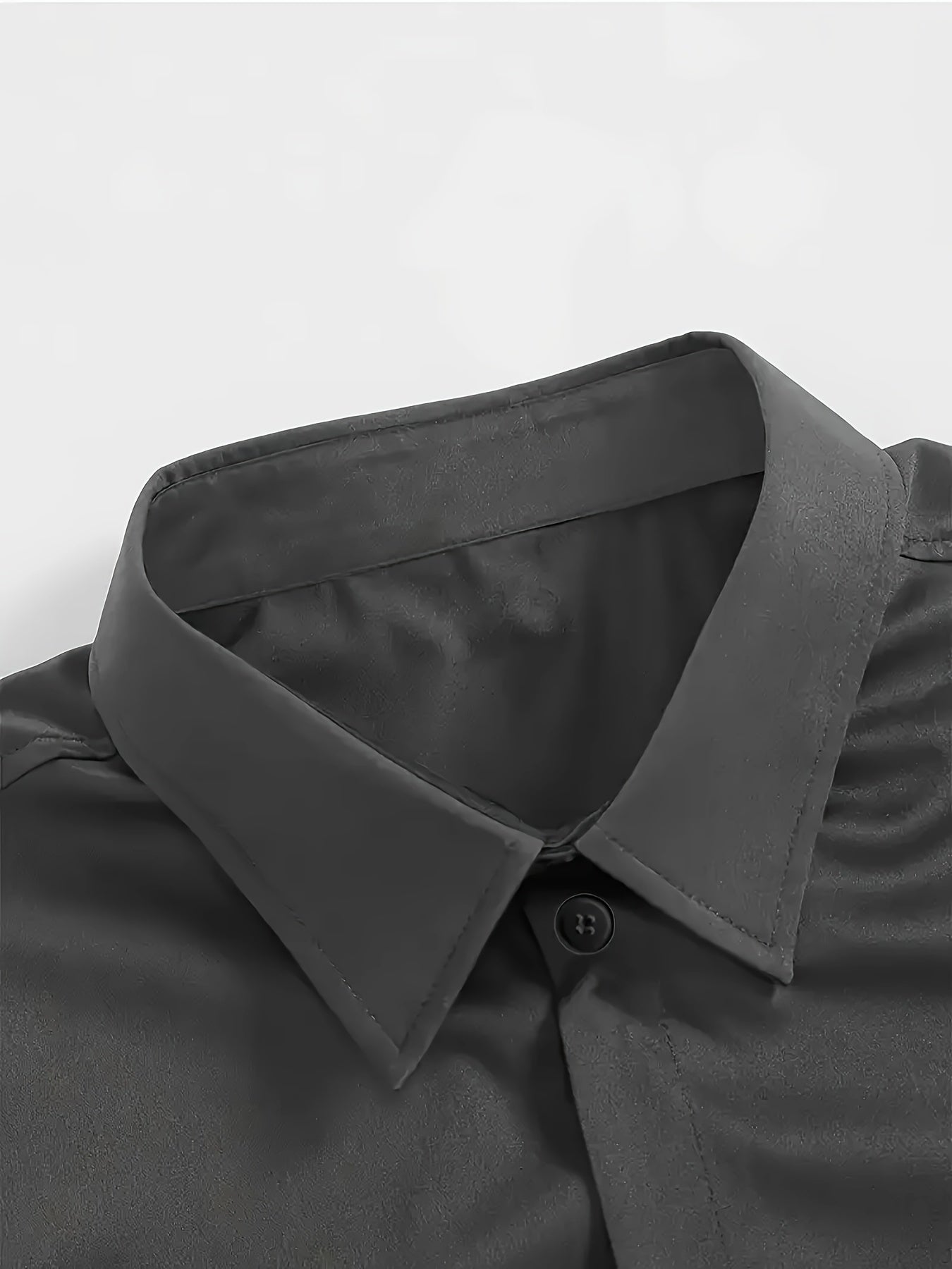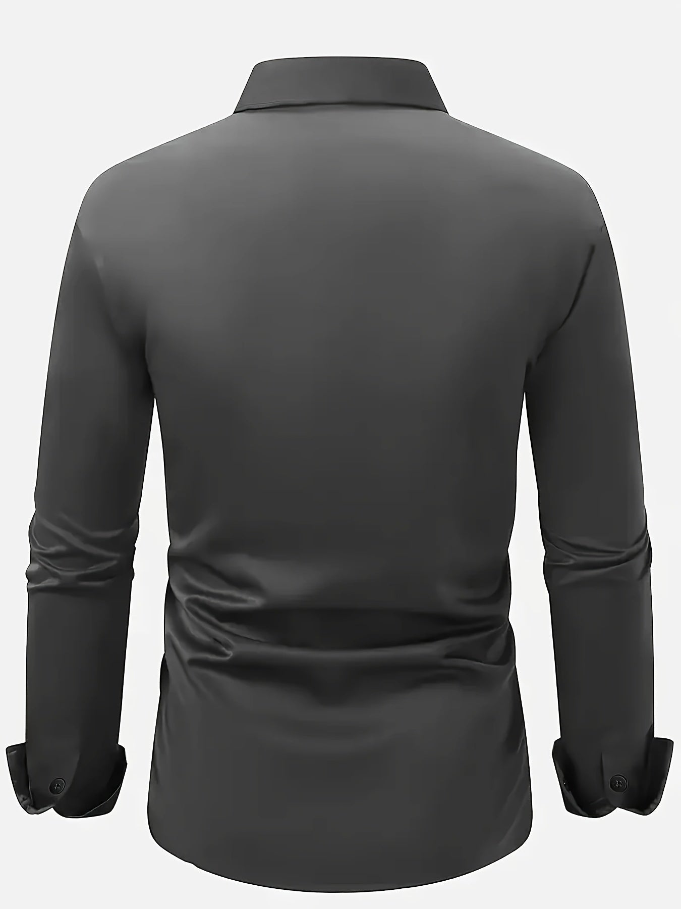 Erkaklar uchun zamonaviy uzun qo'lqopli tugmachali ko'ylak, ish va bahor/kovak uchun mo'ljallangan, cho'zilmaydigan polyesterdan tayyorlangan.