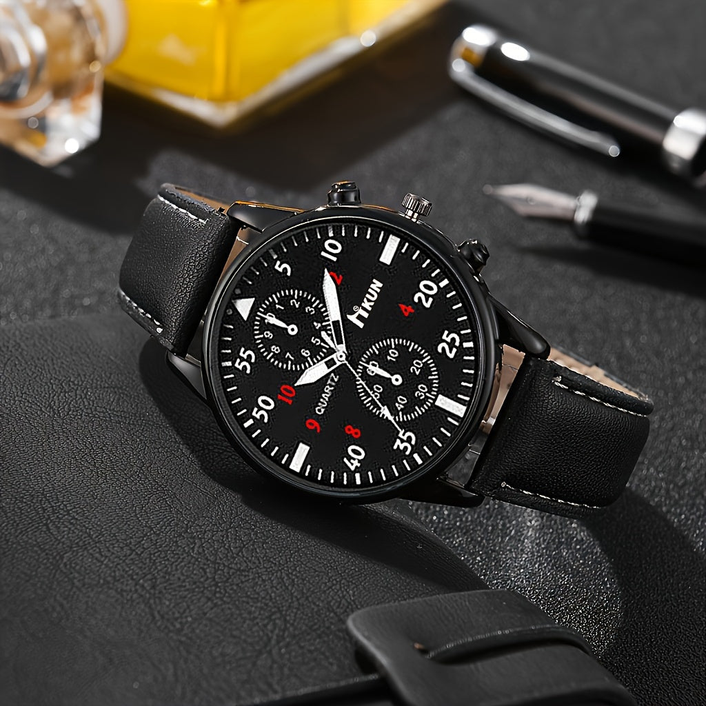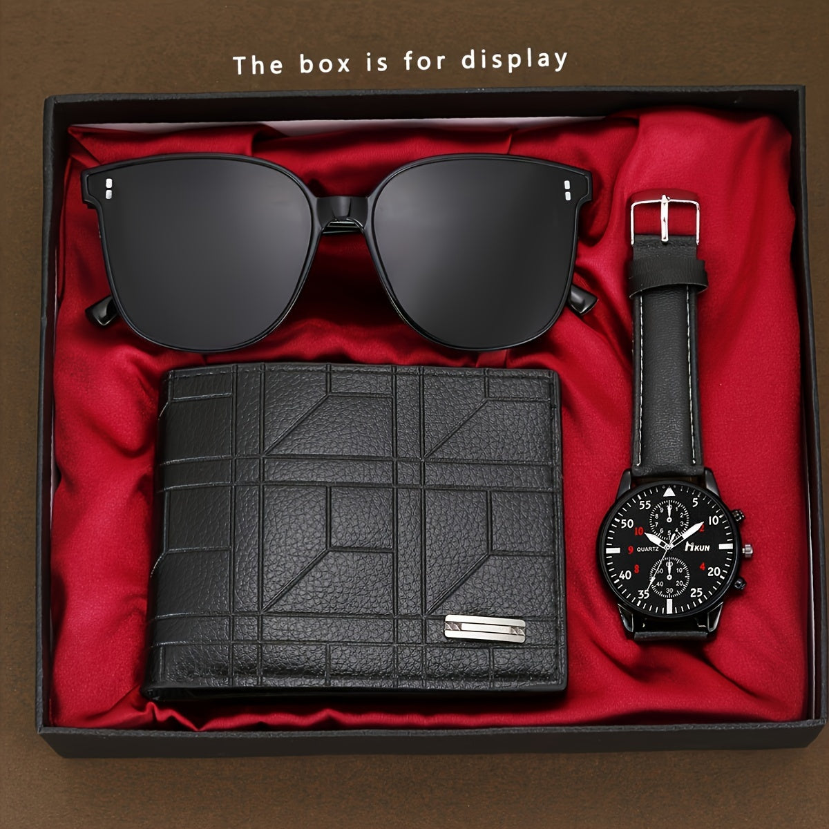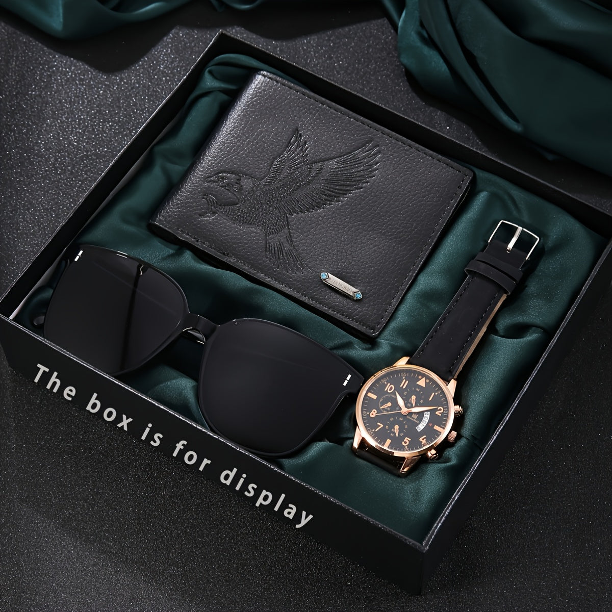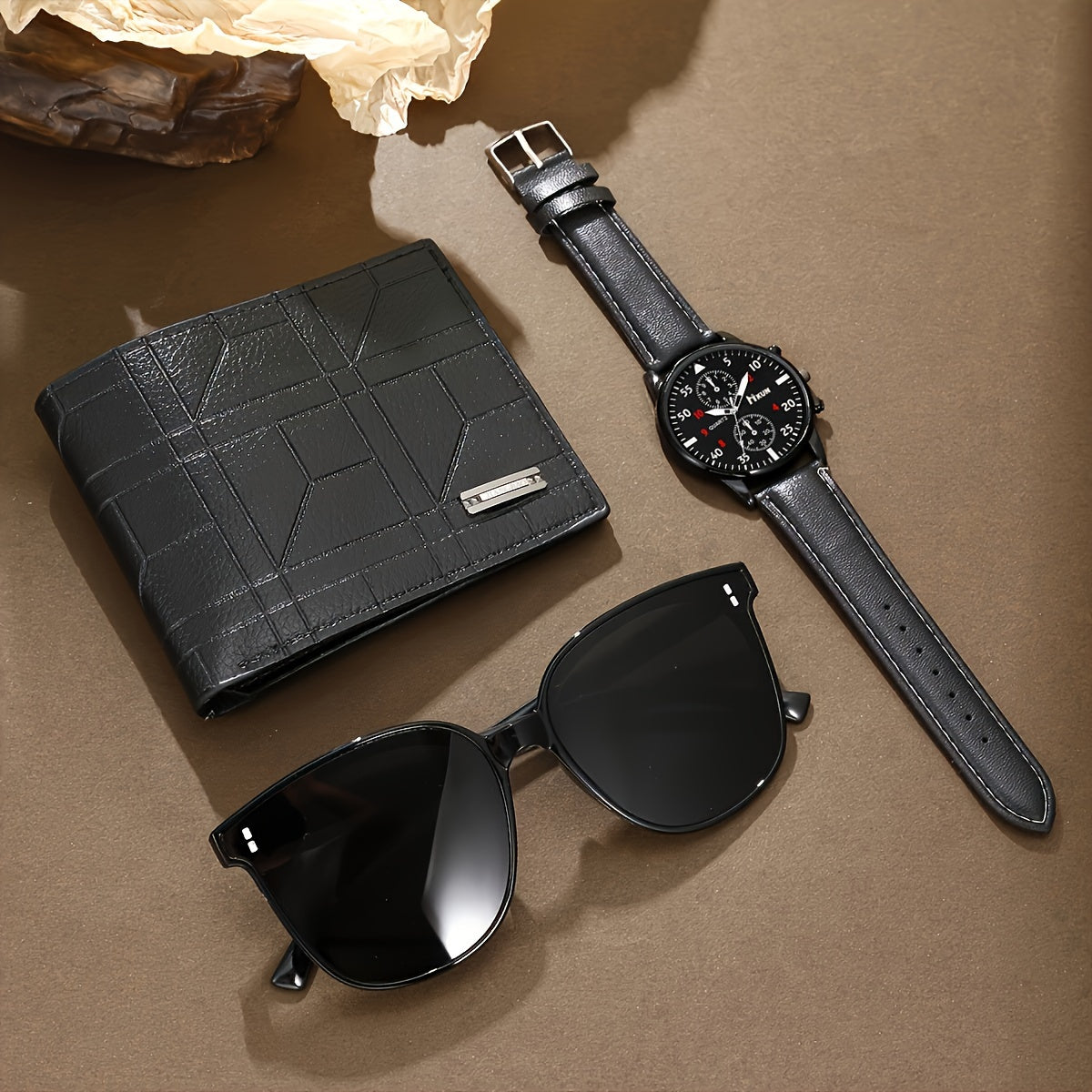 Erkaklar uchun aksessuarlar to'plami: kvarts soat, ko'zoynak, hamyon, sun'iy charm bilan taqilgan taqinch.