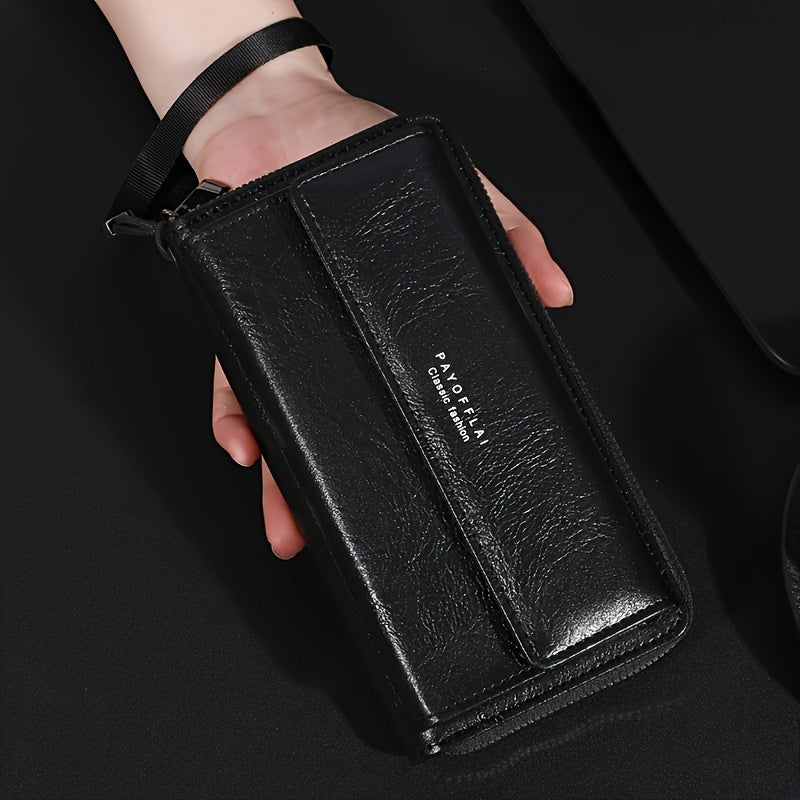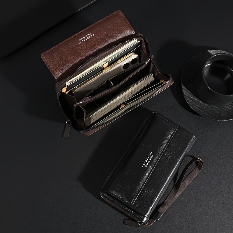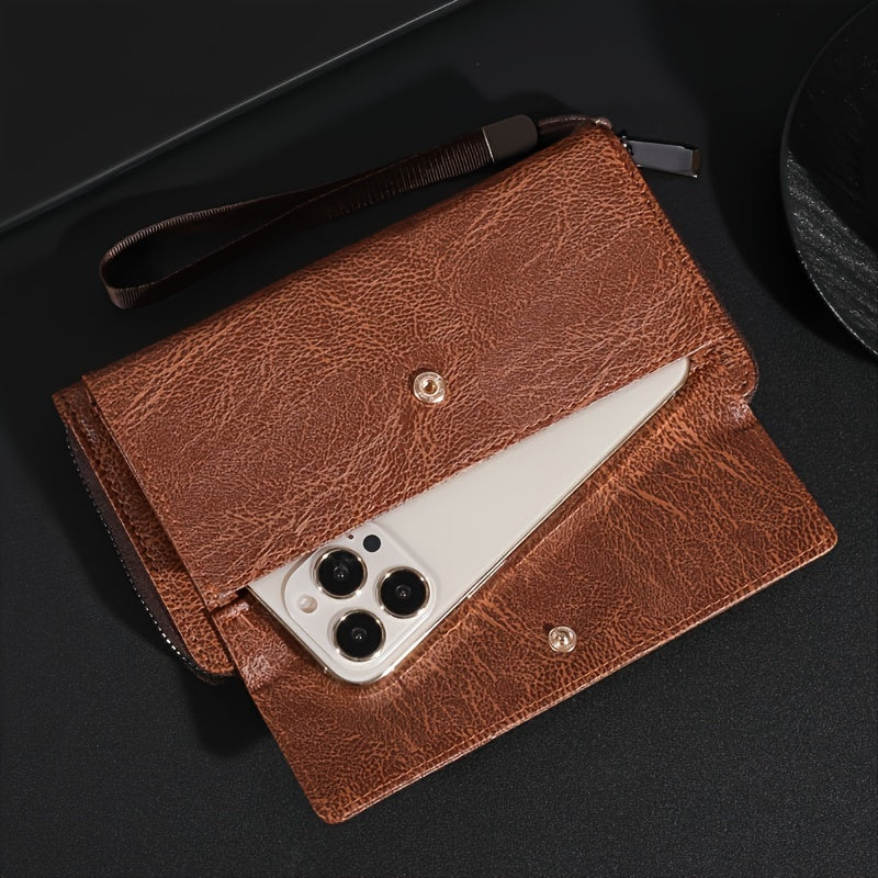Erkaklar uchun sun'iy charm hamyon, zipli tangalar cho'ntagi, tugma yopilishi, karta ushlagichi va bir nechta joylar bilan.