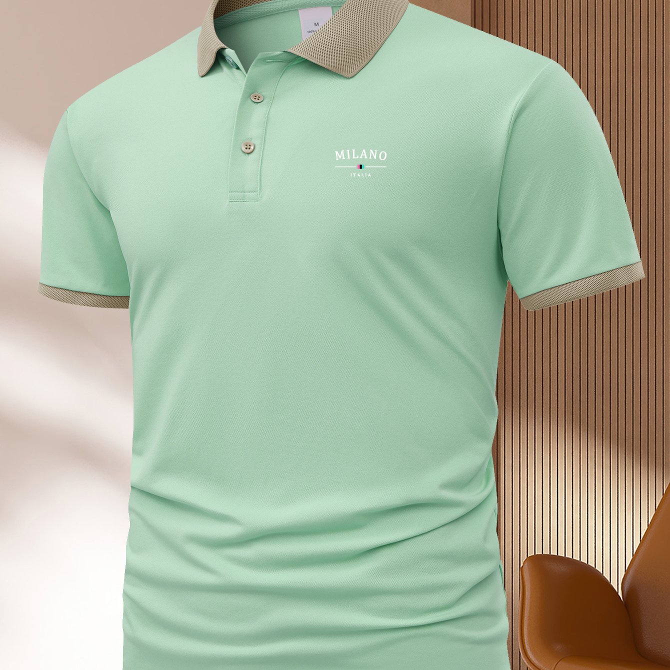 Erkaklar uchun geometrik naqshli qisqa yengli ko'ylak, lapel yaka, tugmachali old qismi, to'qilgan polyester mato, oddiy kesim, yoz uchun mukammal.