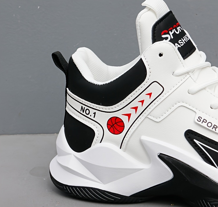 Erkaklar uchun yuqori bo'yli basketbol krossovkalari, oq va qora dizayn, "SPORT" yozuvi bilan, tasodifiy va sport kiyimlari uchun mustahkam sintetik yuqori qismi va kauchuk tagligi. Shokni yutuvchi, engil xususiyatlarga ega.