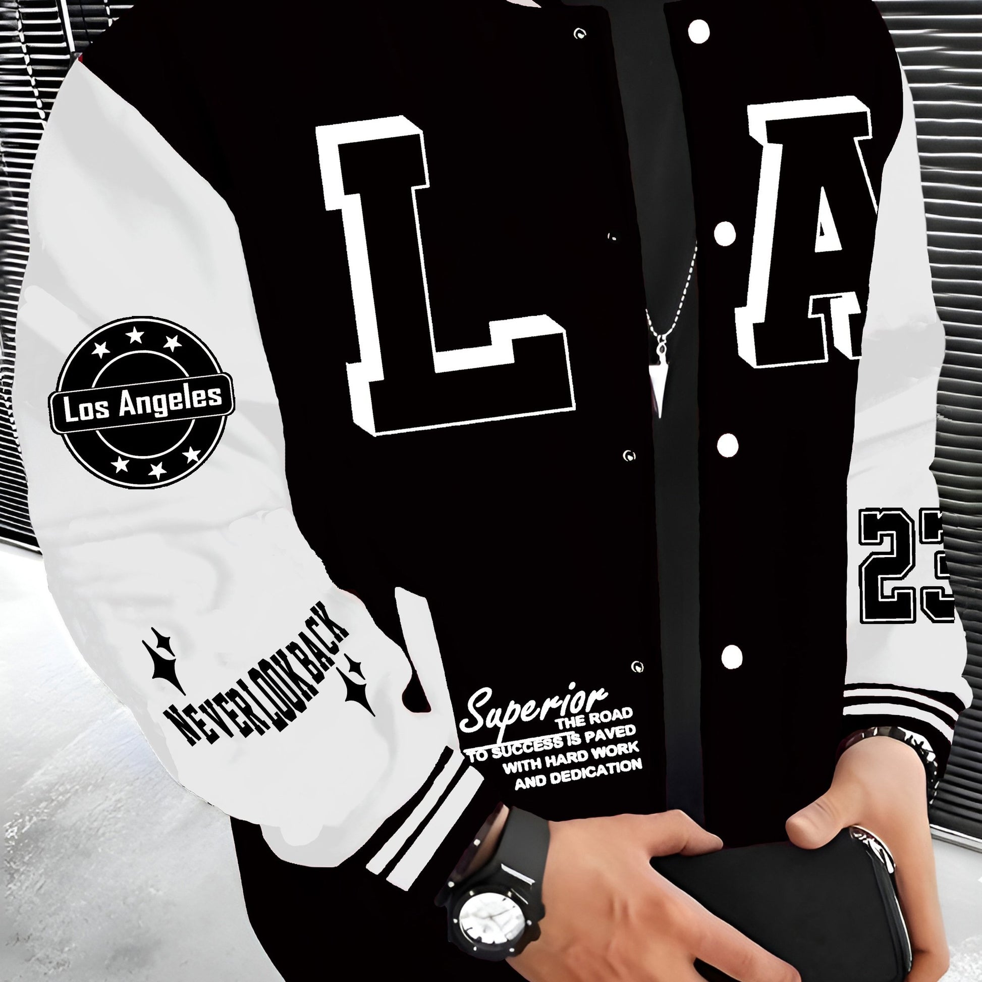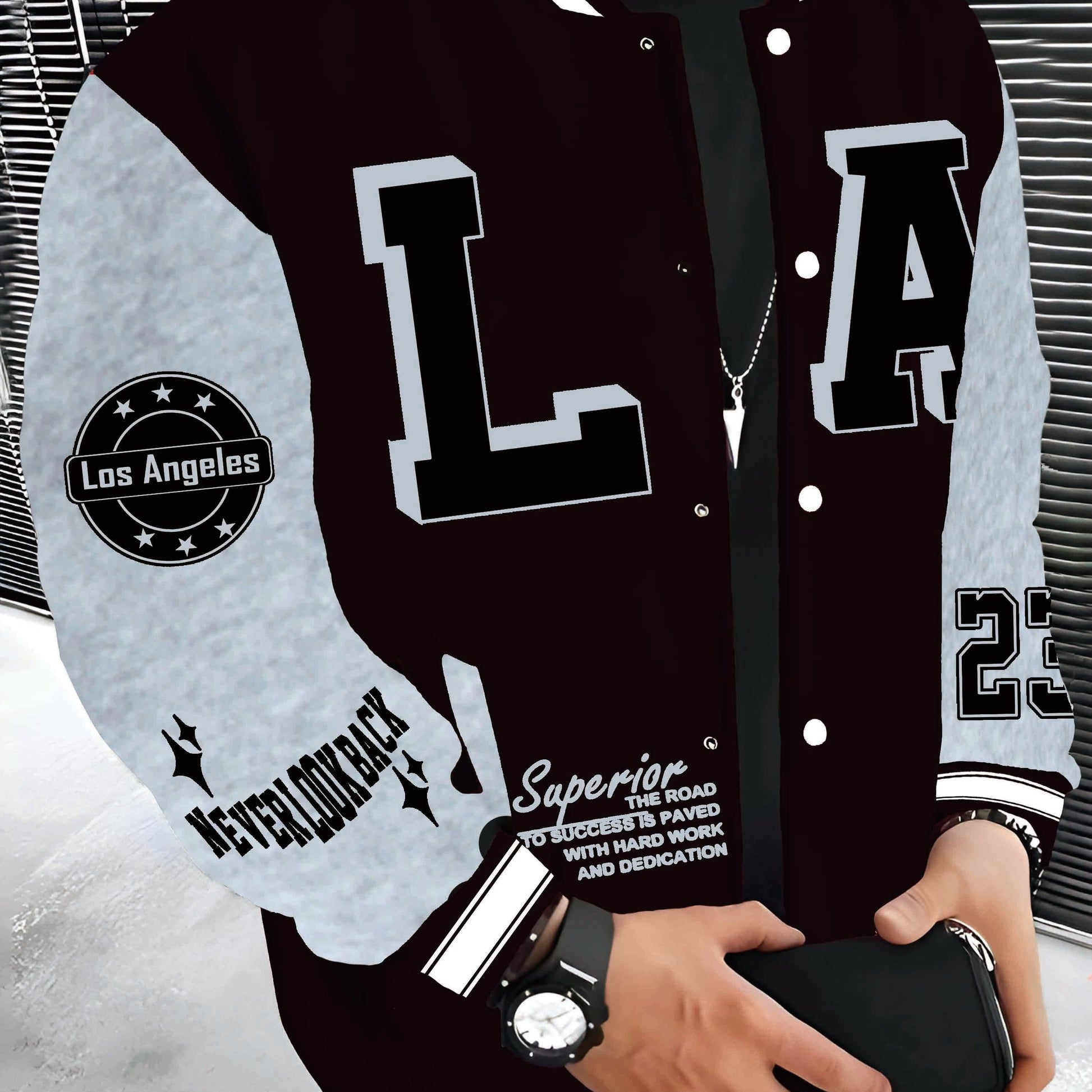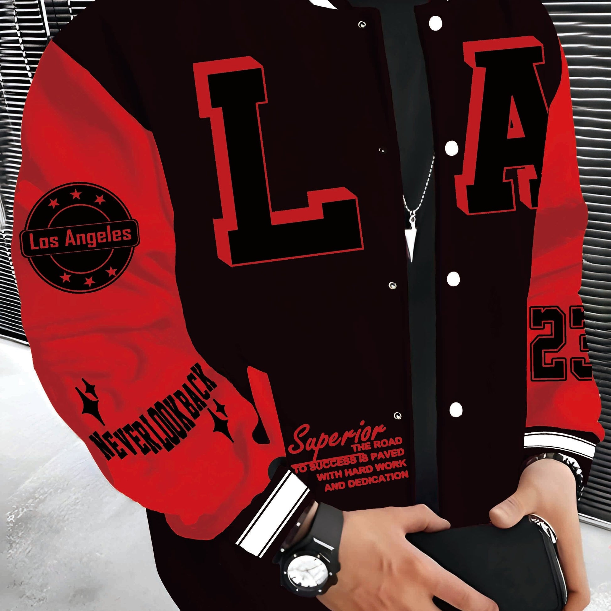 Qizil va qora rangdagi erkaklar uchun LA beysbol jeketi, oq yozuv bilan "SUPERIOR QUALITY" tikuv. Yengil va iliq polyesterdan tayyorlangan, cho'ntaklari bor, hip hop rok uslubini o'z ichiga oladi.