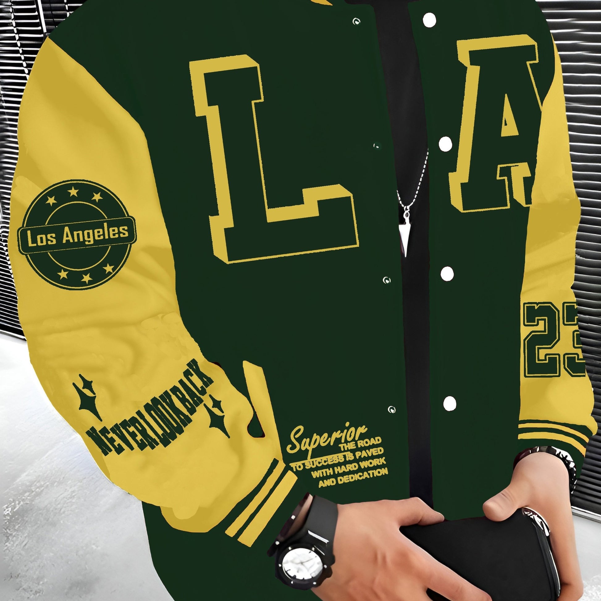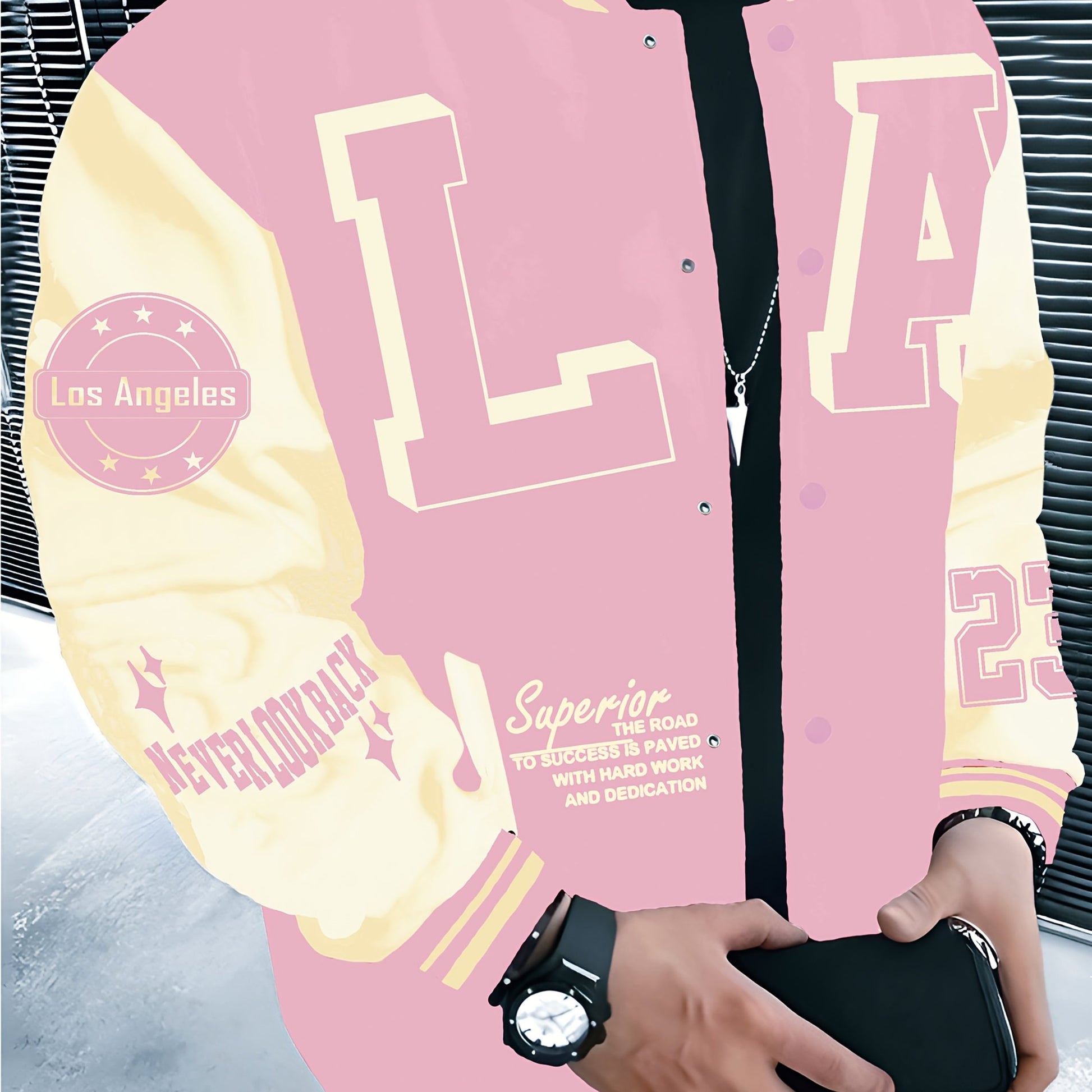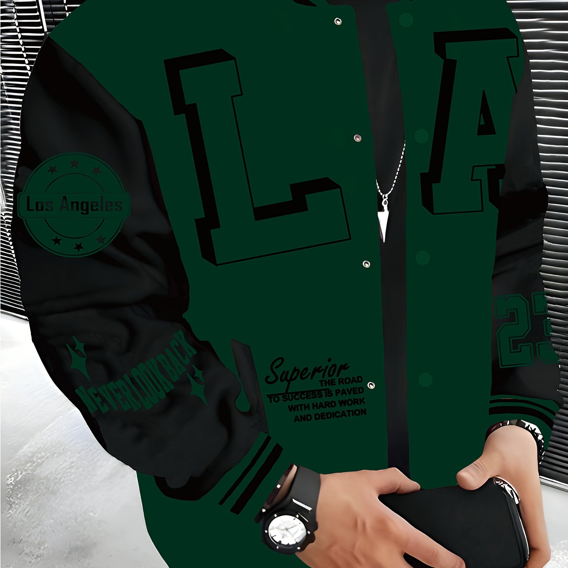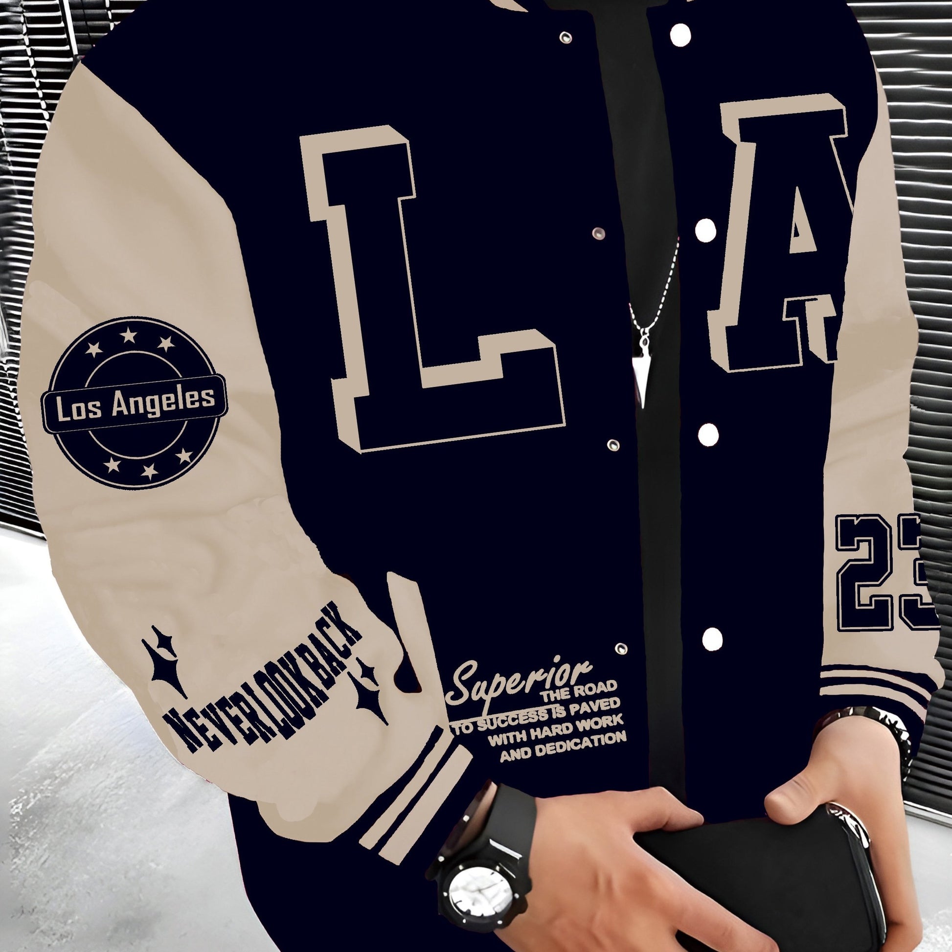 Qizil va qora rangdagi erkaklar uchun LA beysbol jeketi, oq yozuv bilan "SUPERIOR QUALITY" tikuv. Yengil va iliq polyesterdan tayyorlangan, cho'ntaklari bor, hip hop rok uslubini o'z ichiga oladi.