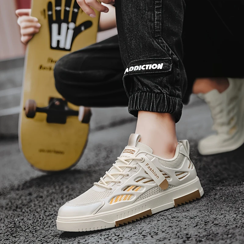 Erkaklar uchun to'rli skeytbord poyabzallari, chiziqli naqsh bilan, pastki dizayn. Bahor, yoz va kuz mavsumlari uchun mos. Bog'ichli yopilish, dumaloq barmoq, EVA ichki qismi va kauchuk taglikka ega.
