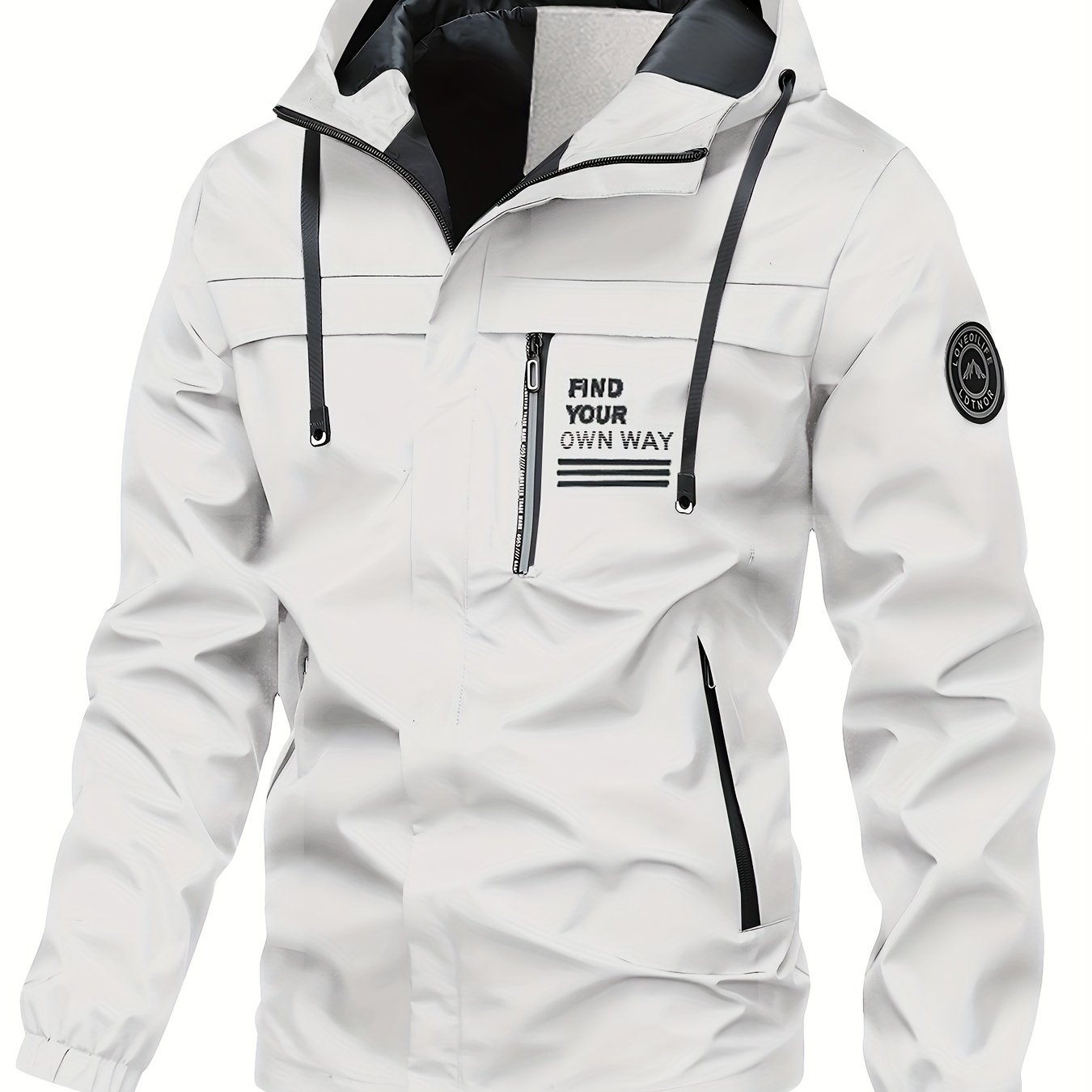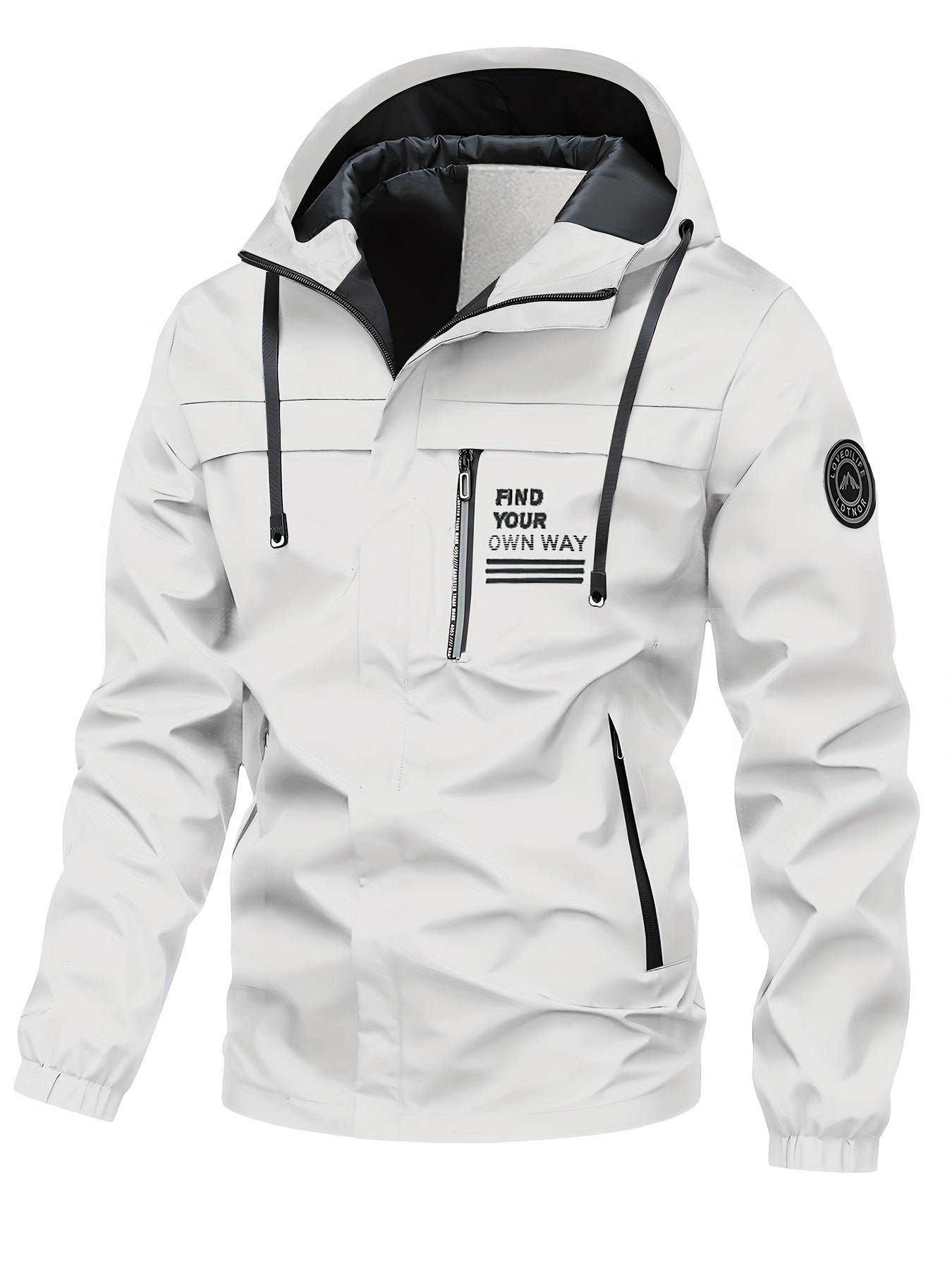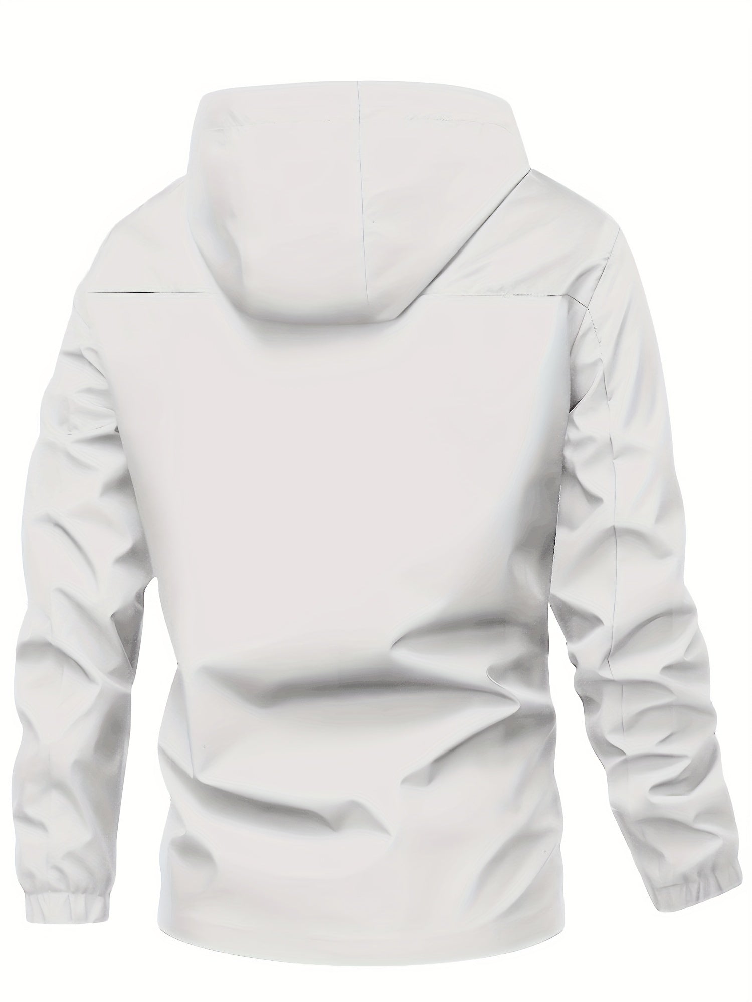 Erkaklar uchun ko'k rangli kapüşonli kurtka, zipli cho'ntaklar bilan, engil polyesterdan tayyorlangan, bahor va kuz uchun mashinada yuvilishi mumkin.