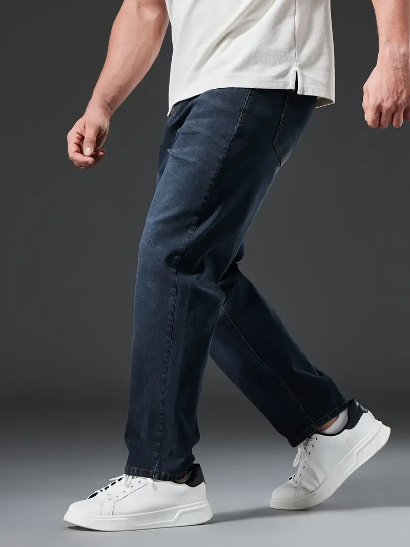 Erkaklar uchun plussiz casual tor to'g'ri oyoq jinsilari, bir rangli yuvilgan denim, o'rtacha cho'zilish bilan, kuz/qish mavsumi uchun mos.