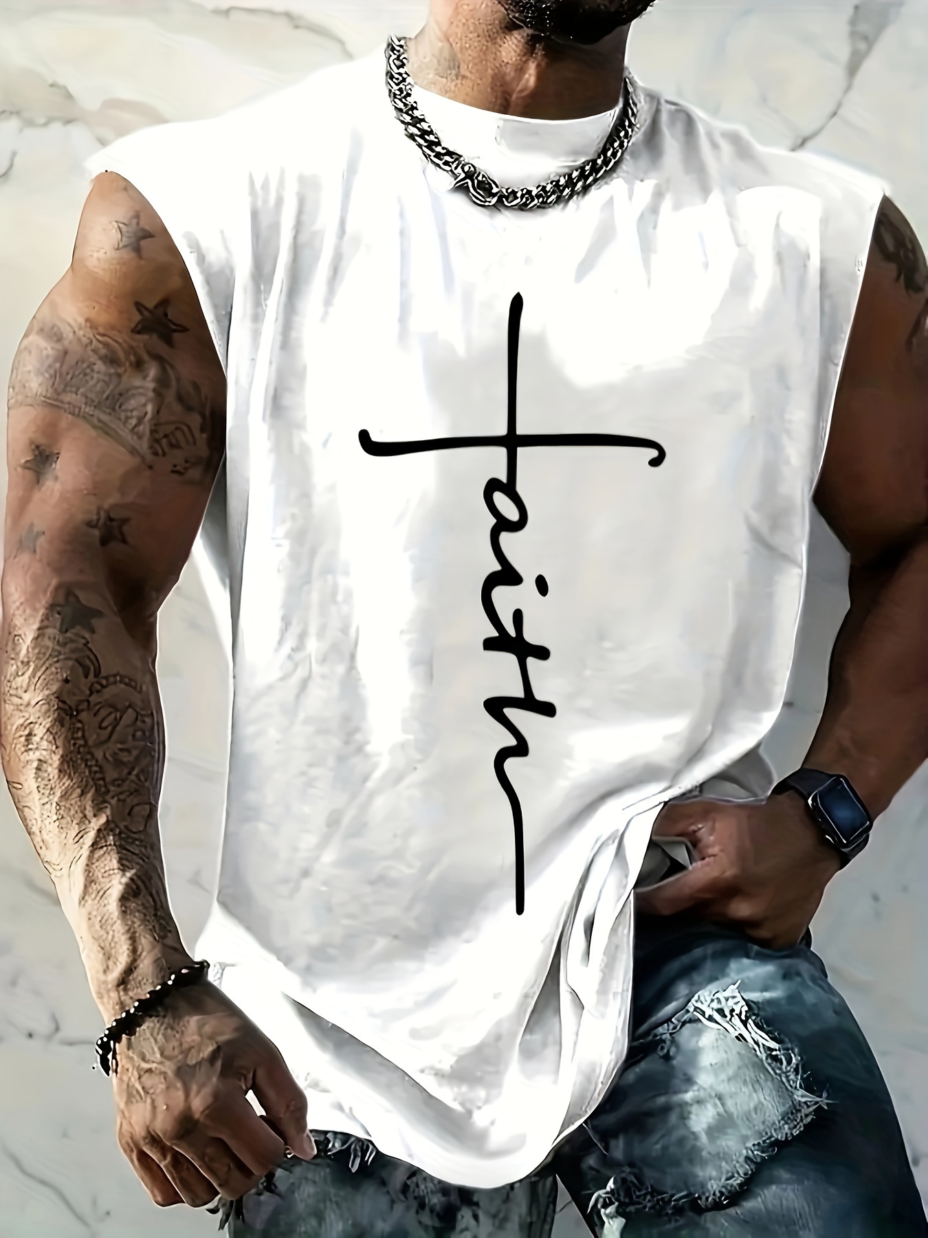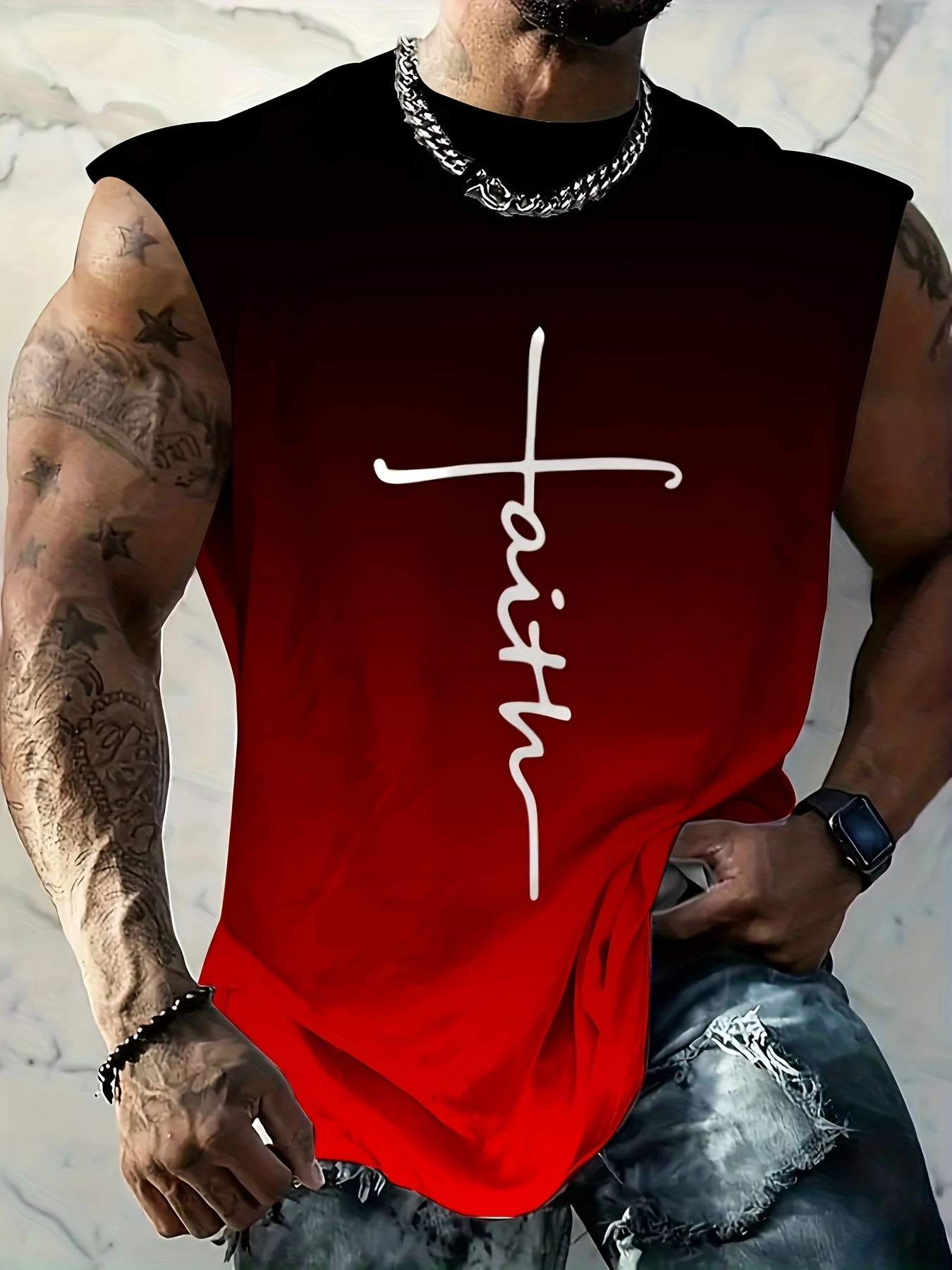 Erkaklar uchun Plus Size Gradient "Faith" Print Tank Top qora va teal dizaynida, yozgi fitnes, mashg'ulotlar va tasodifiy kiyimlar uchun mos, nafas oladigan va cho'ziluvchan, PLUS SIZE.