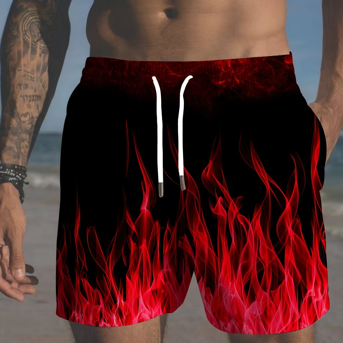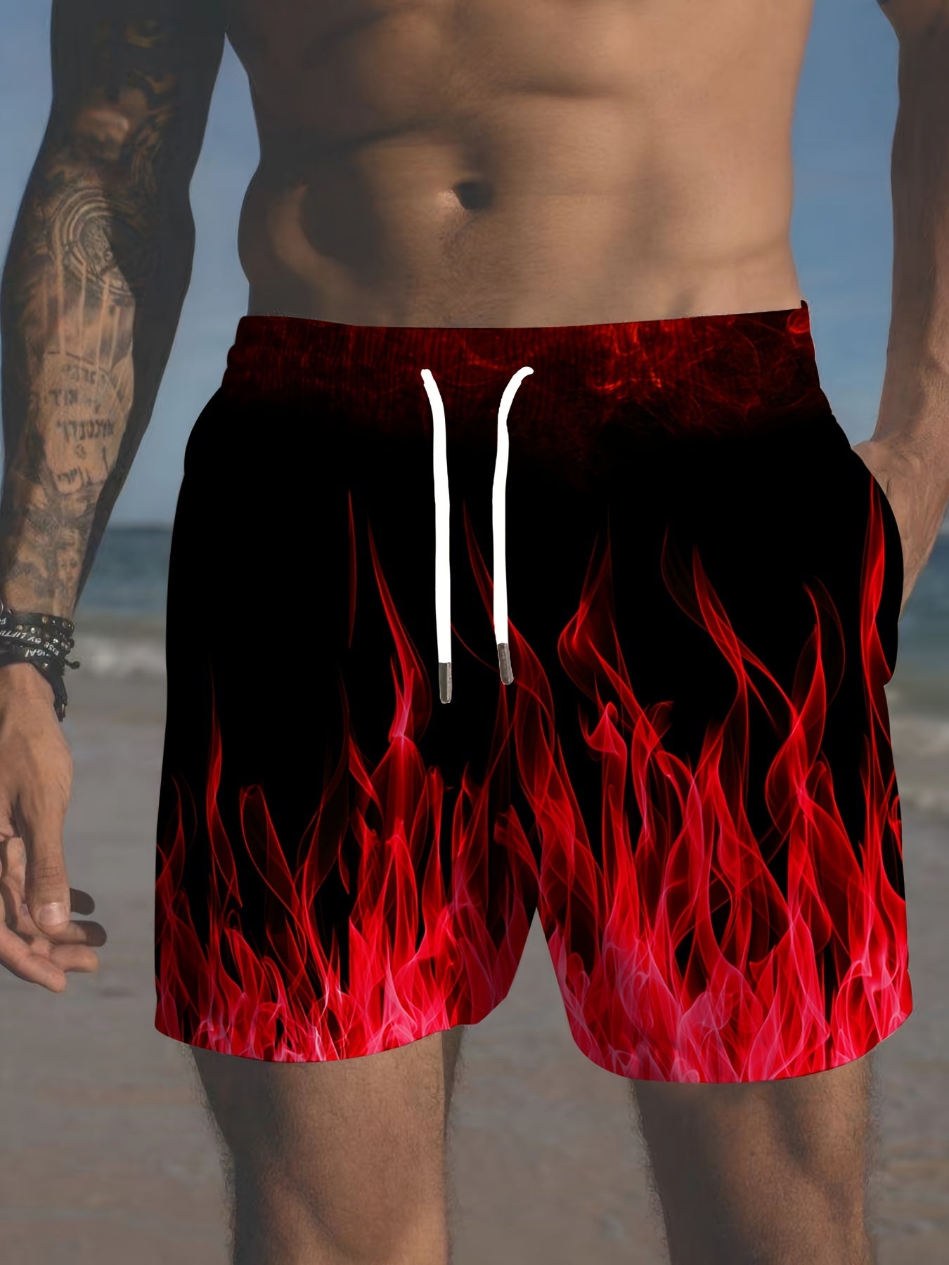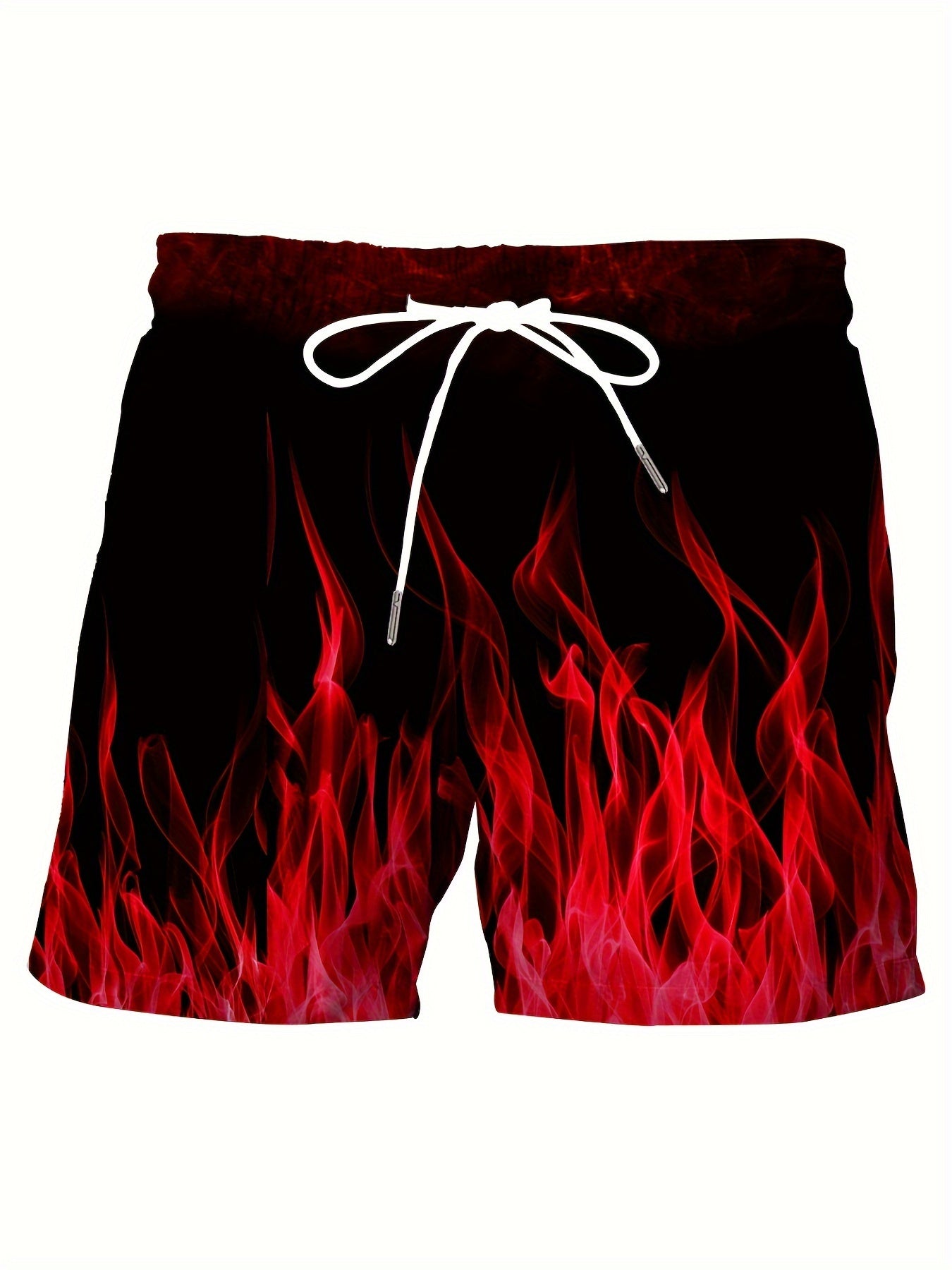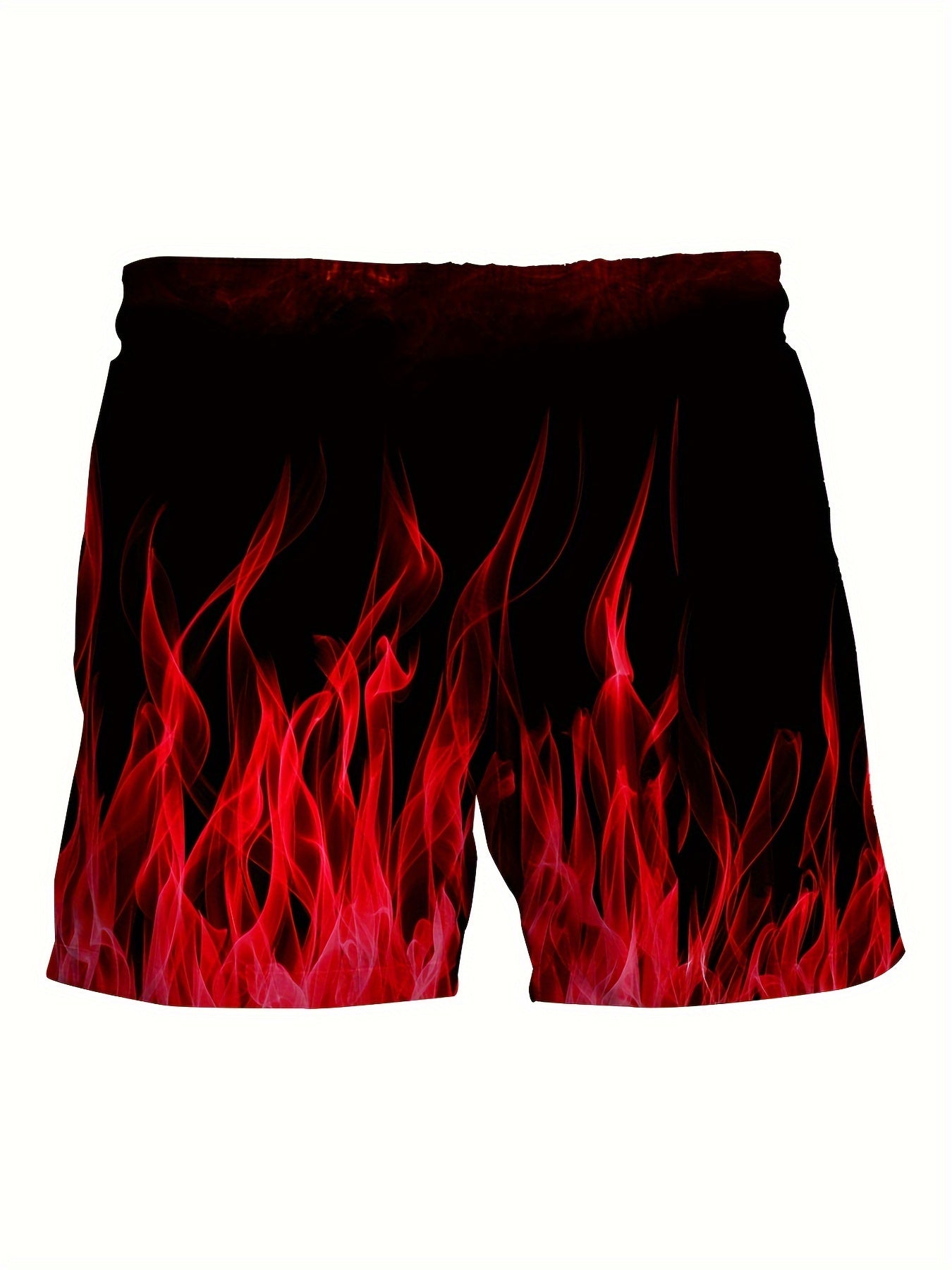 Erkaklar uchun plussiz gradient olov naqshli plyaj shortilari, tortishqichli bel bilan, yoz uchun mukammal.