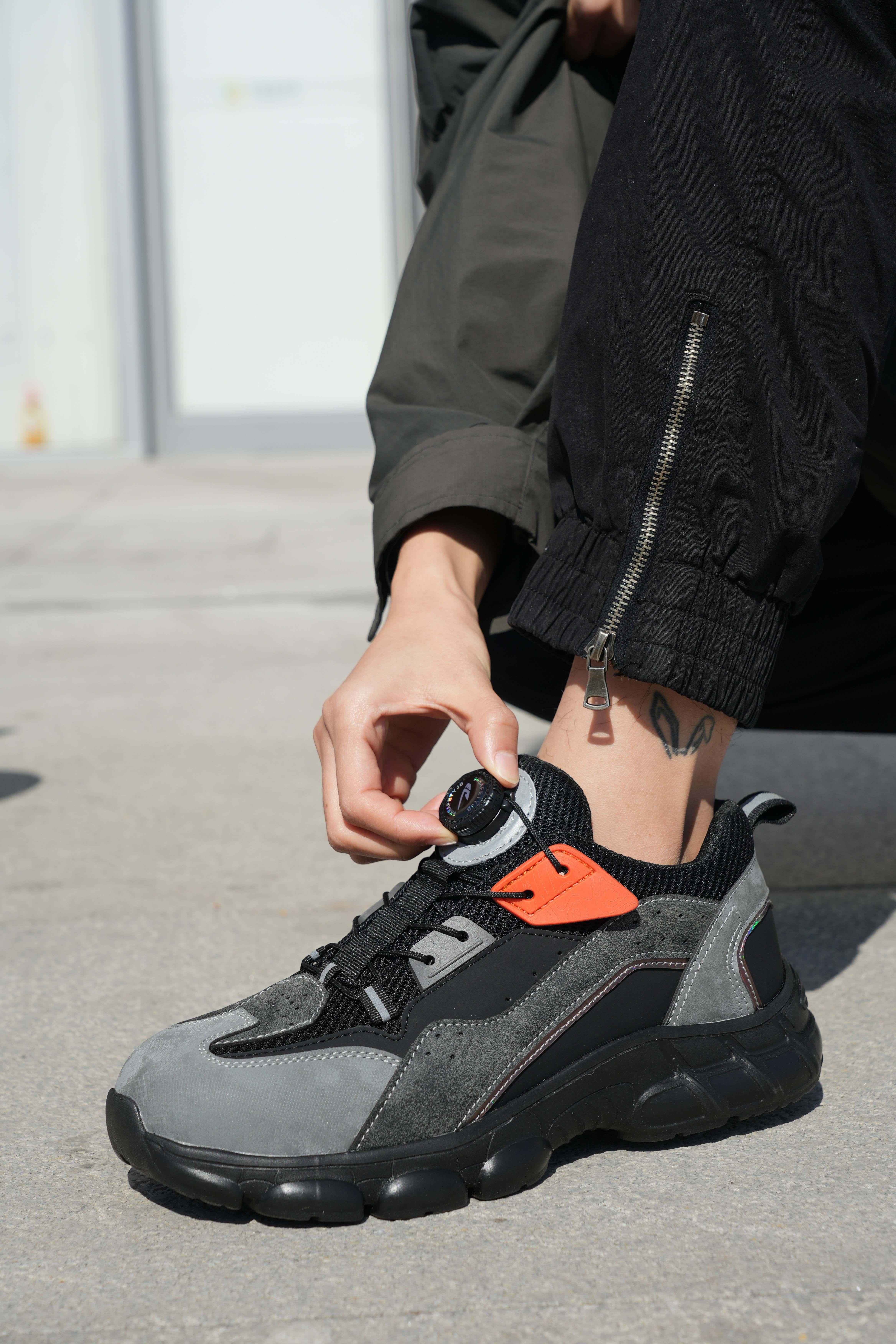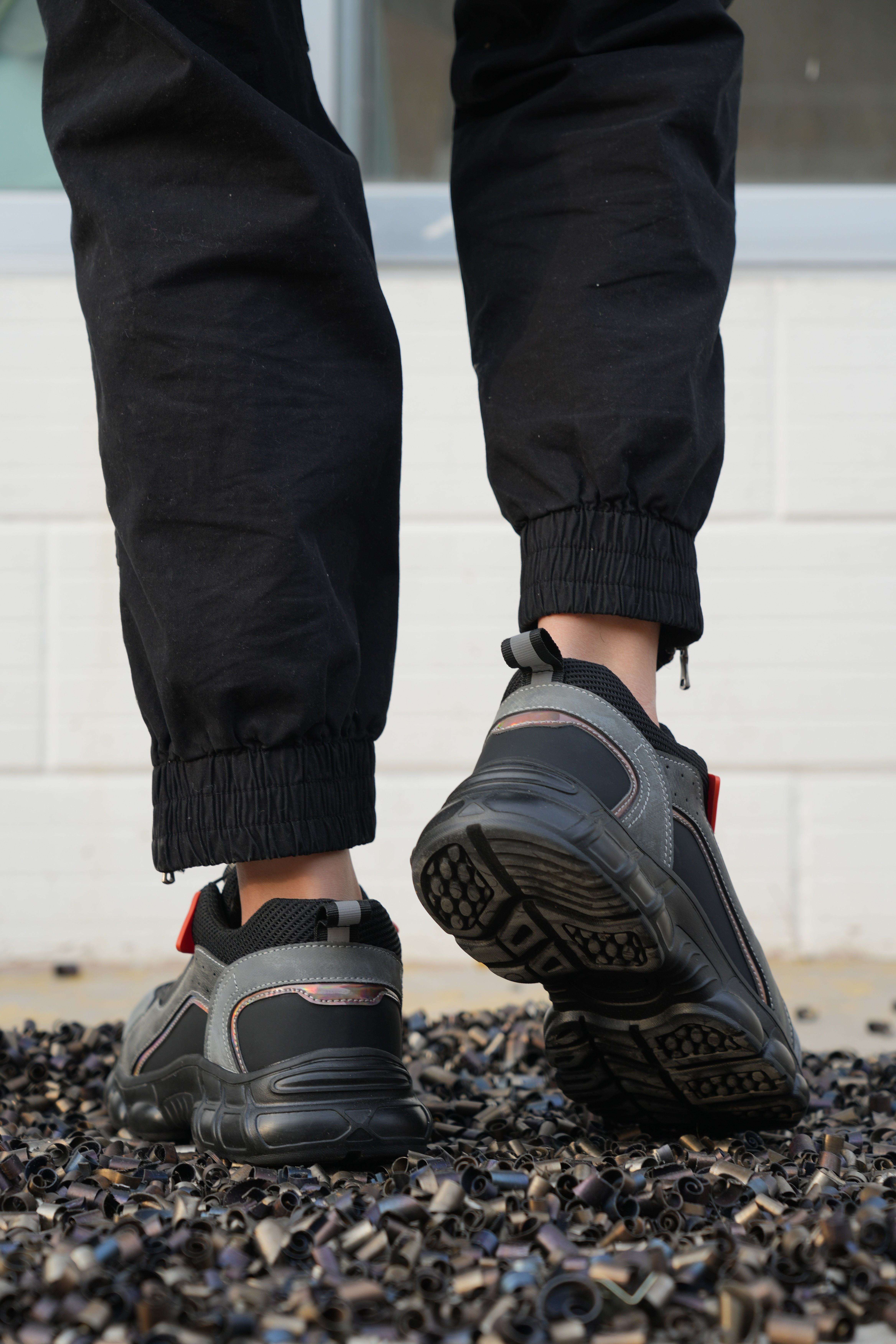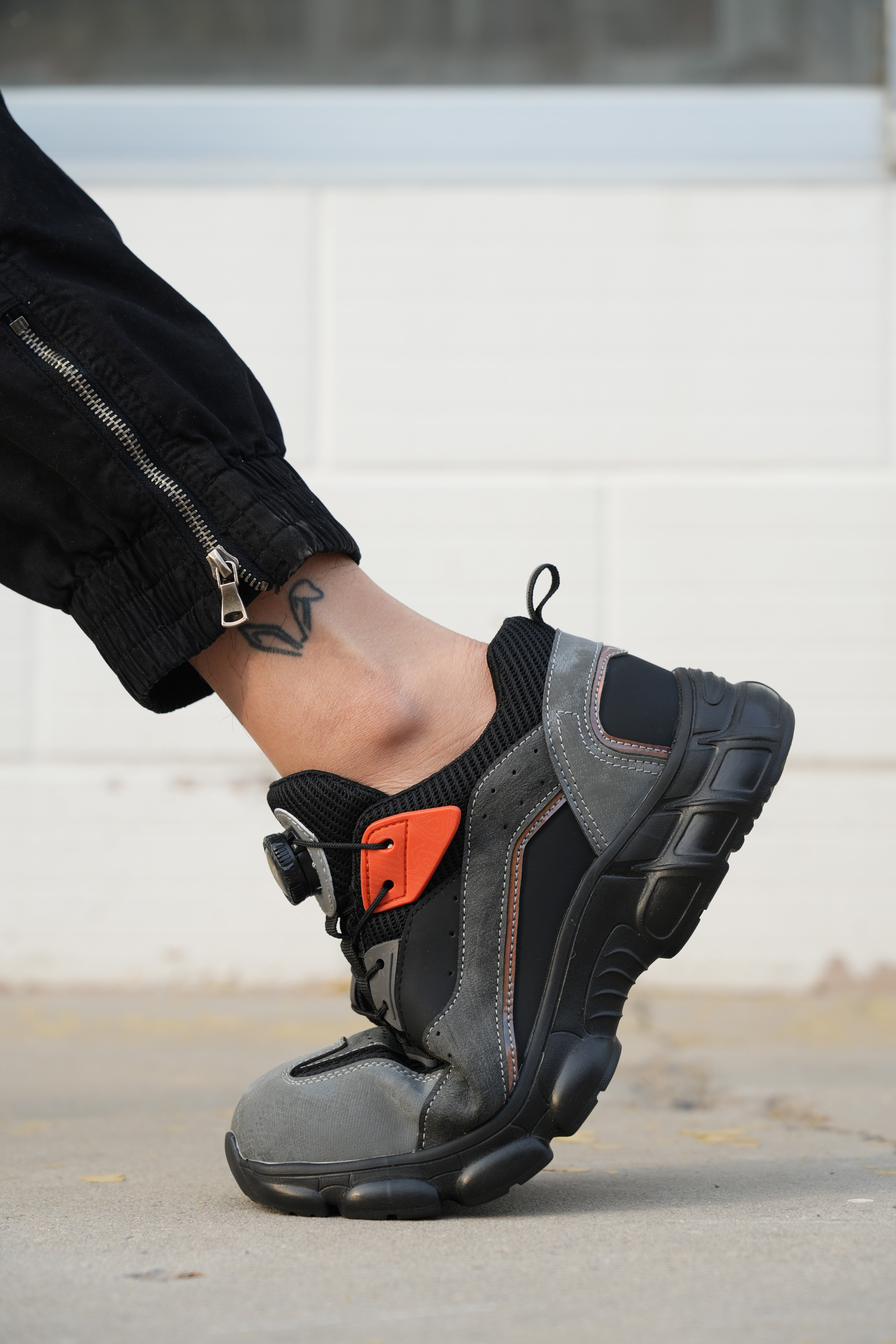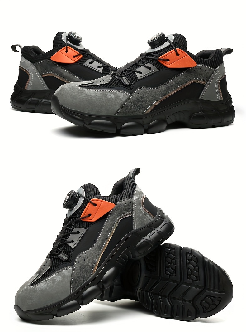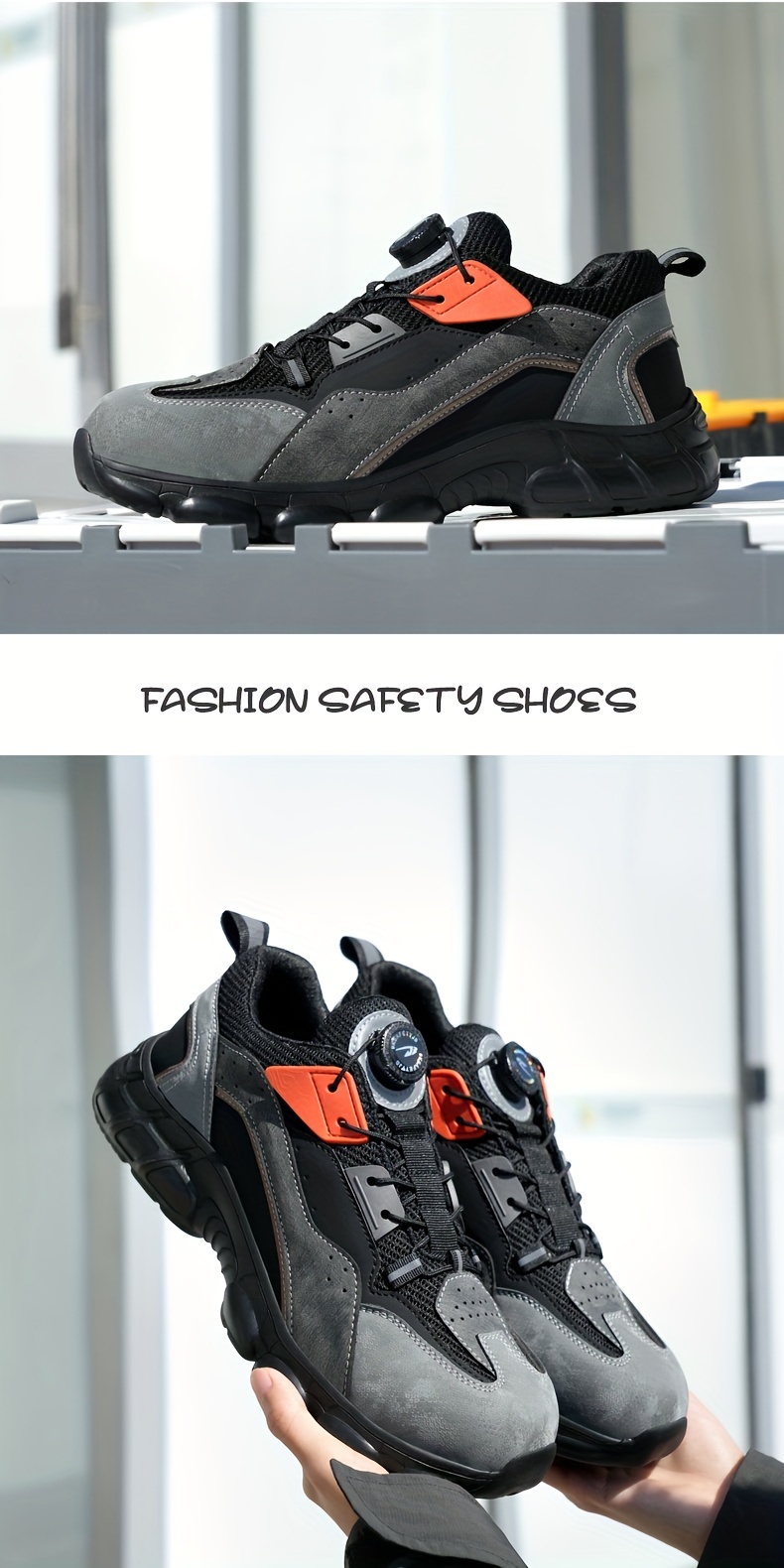 Erkaklar uchun plussiz xavfsizlik krossovkalari, po'latdan yasalgan barmoq, teshilmas taglik, aylanuvchi tugma yopilishi, qulay, sirpanmas, mustahkam, kulrang va qora aksentlar bilan.