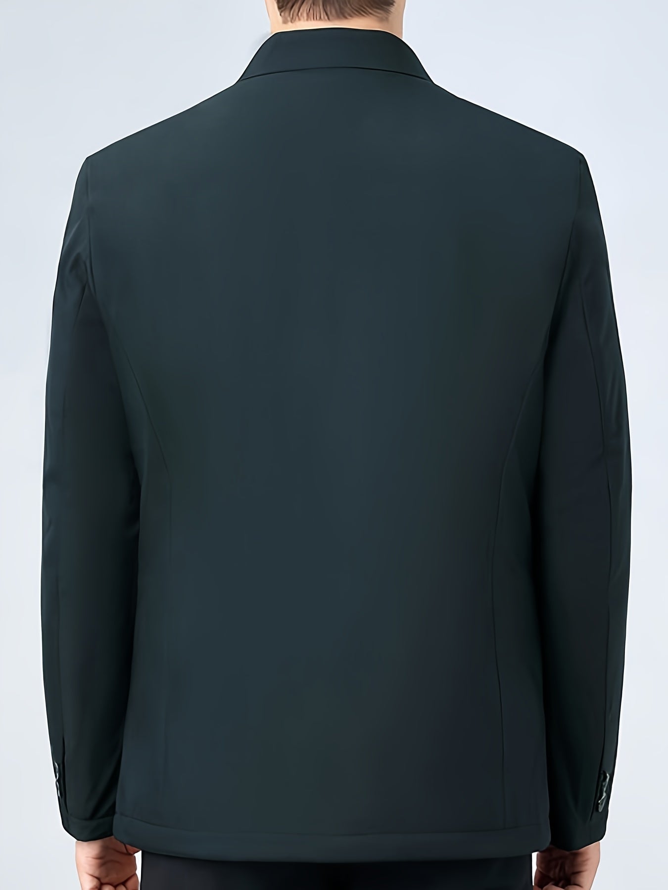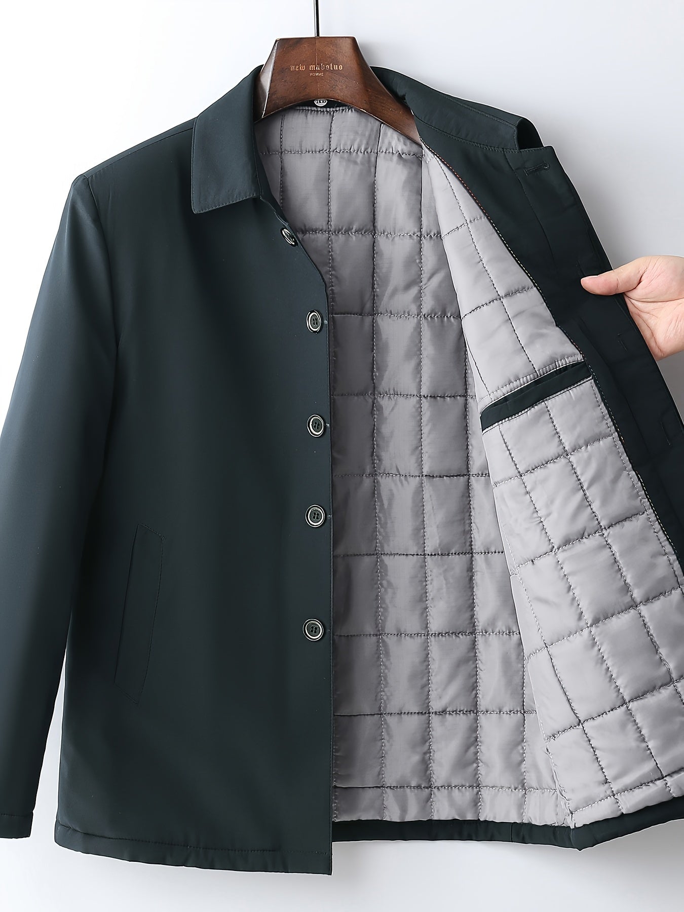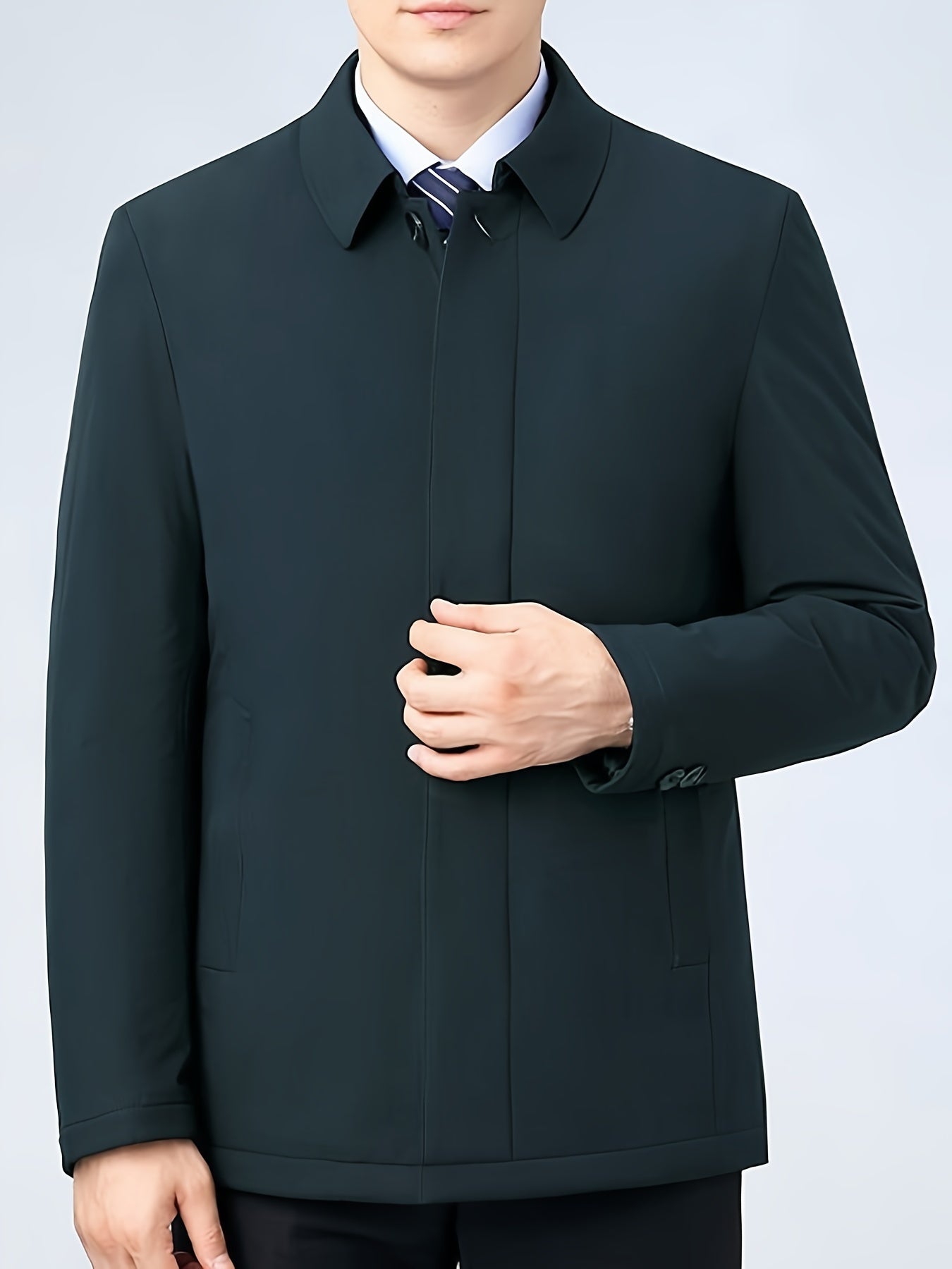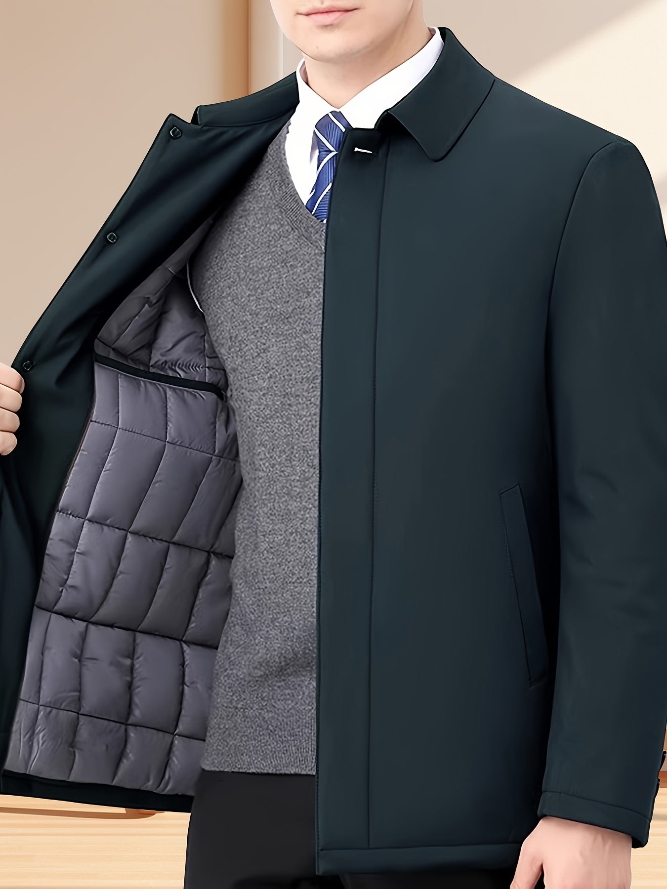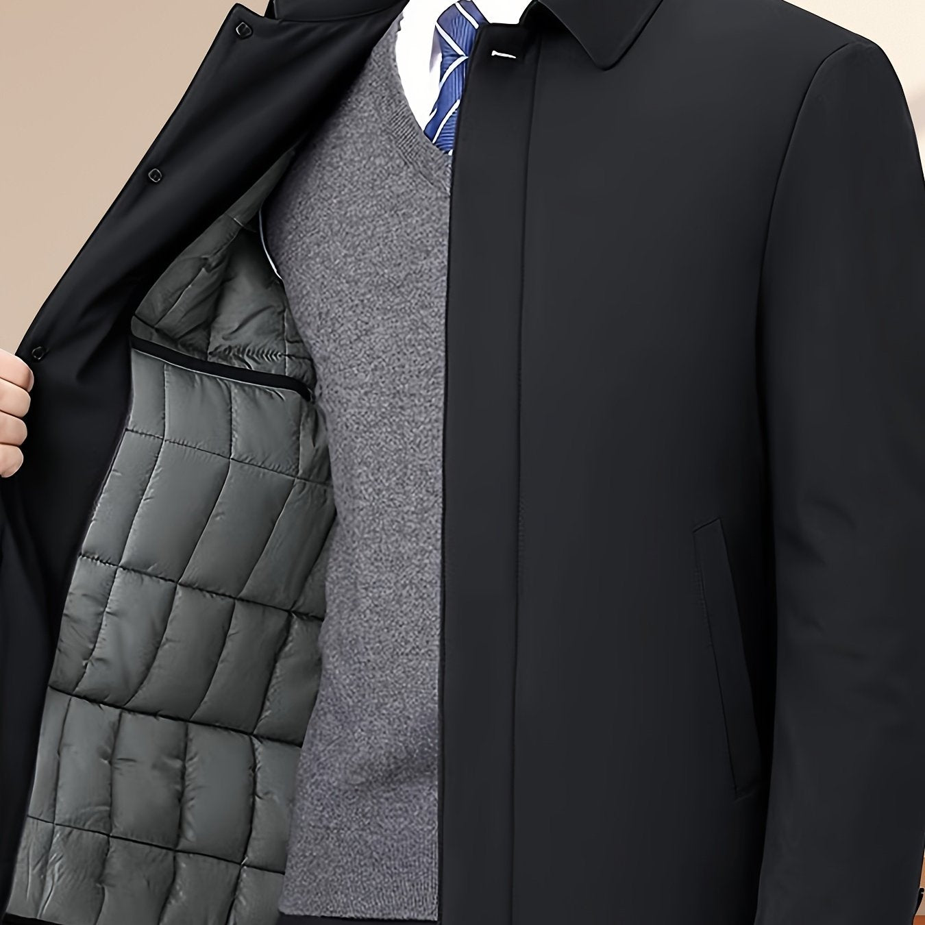 Erkaklar uchun premium qattiq rangli kuz/qish palto, issiqlik uchun qalinlashtirilgan polyesterdan tayyorlangan, lapel yaka, oddiy kesim va to'liq astarlangan, qari erkaklar uchun.