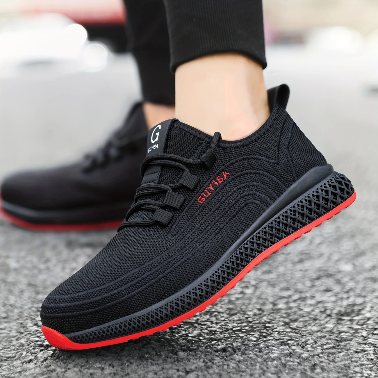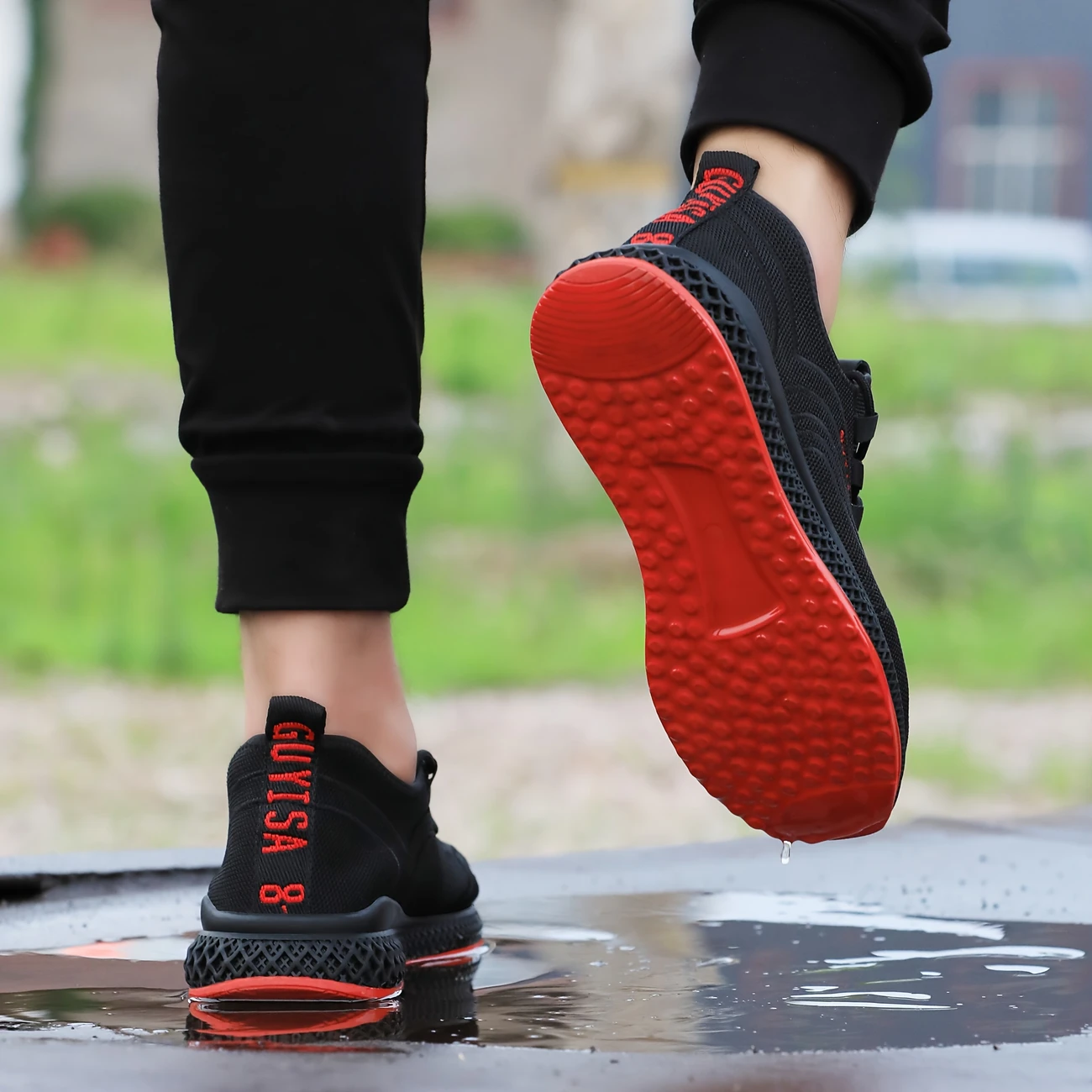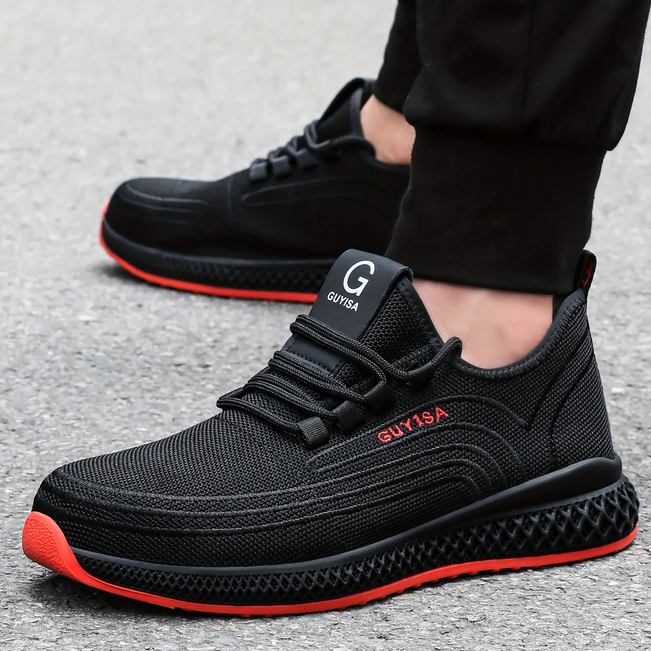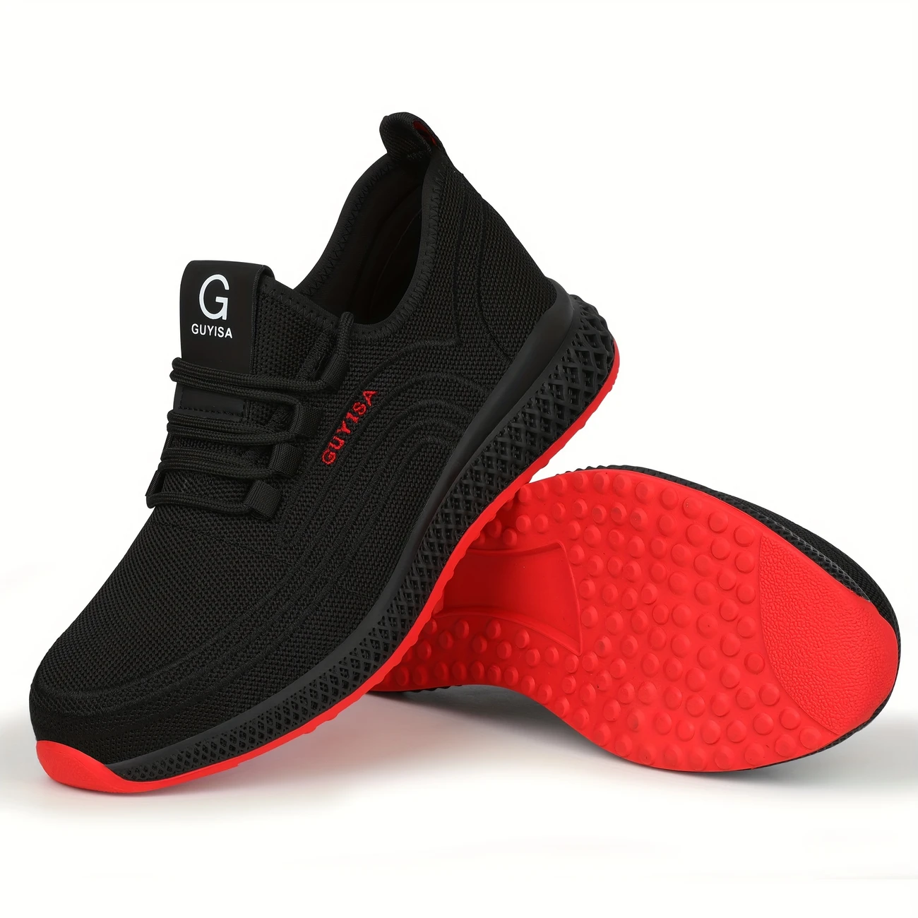 Erkaklar uchun xavfsizlik ish poyafzallari, po'latdan yasalgan barmoq, nafas oladigan to'r mato, qulay yumshoq taglik, sirpanmaydigan kauchuk, PU ichki taglik, bog'ichli dizayn, barcha mavsumlar uchun ochiq havoda foydalanishga mos, Safegoat brendidan.