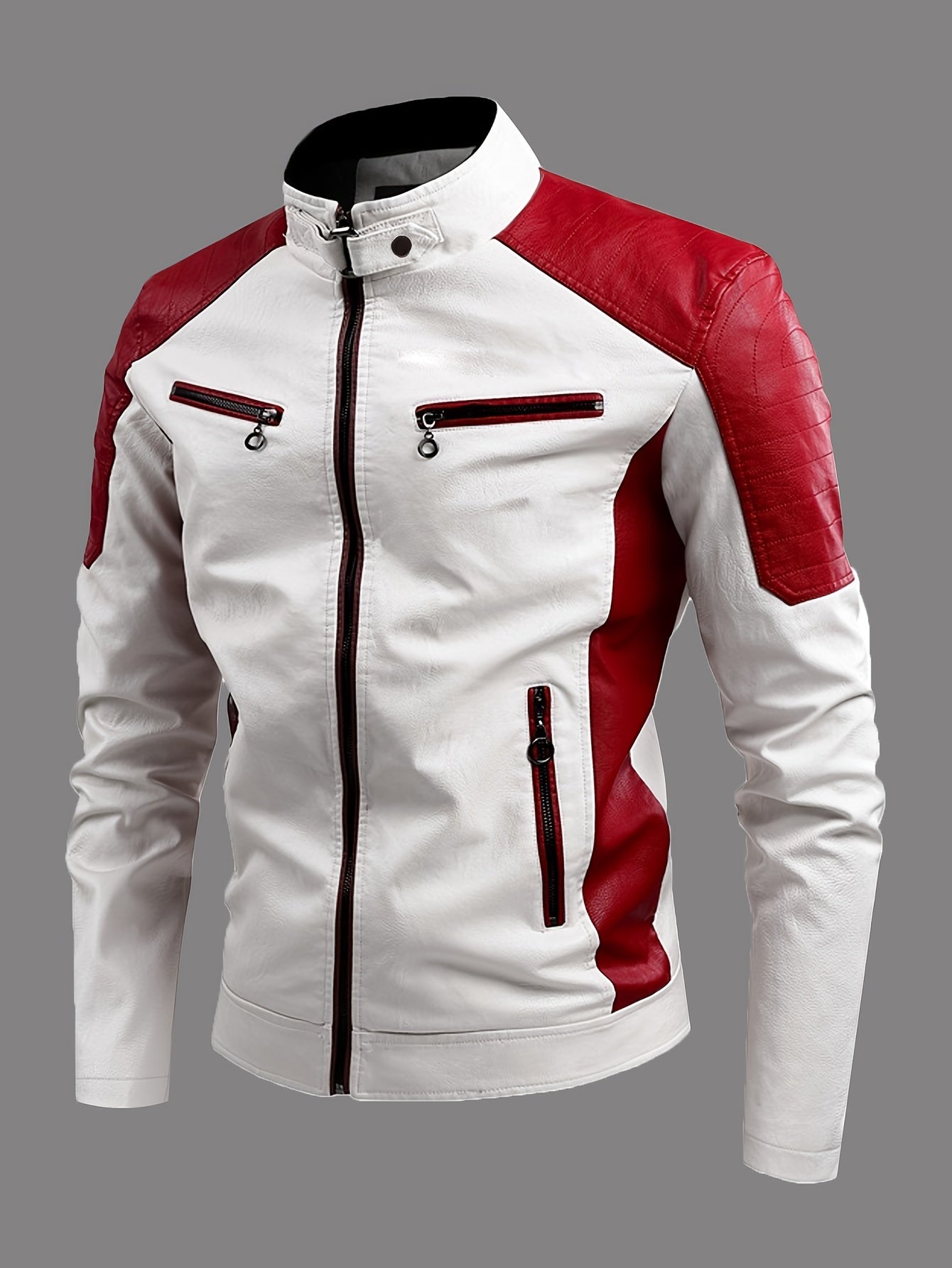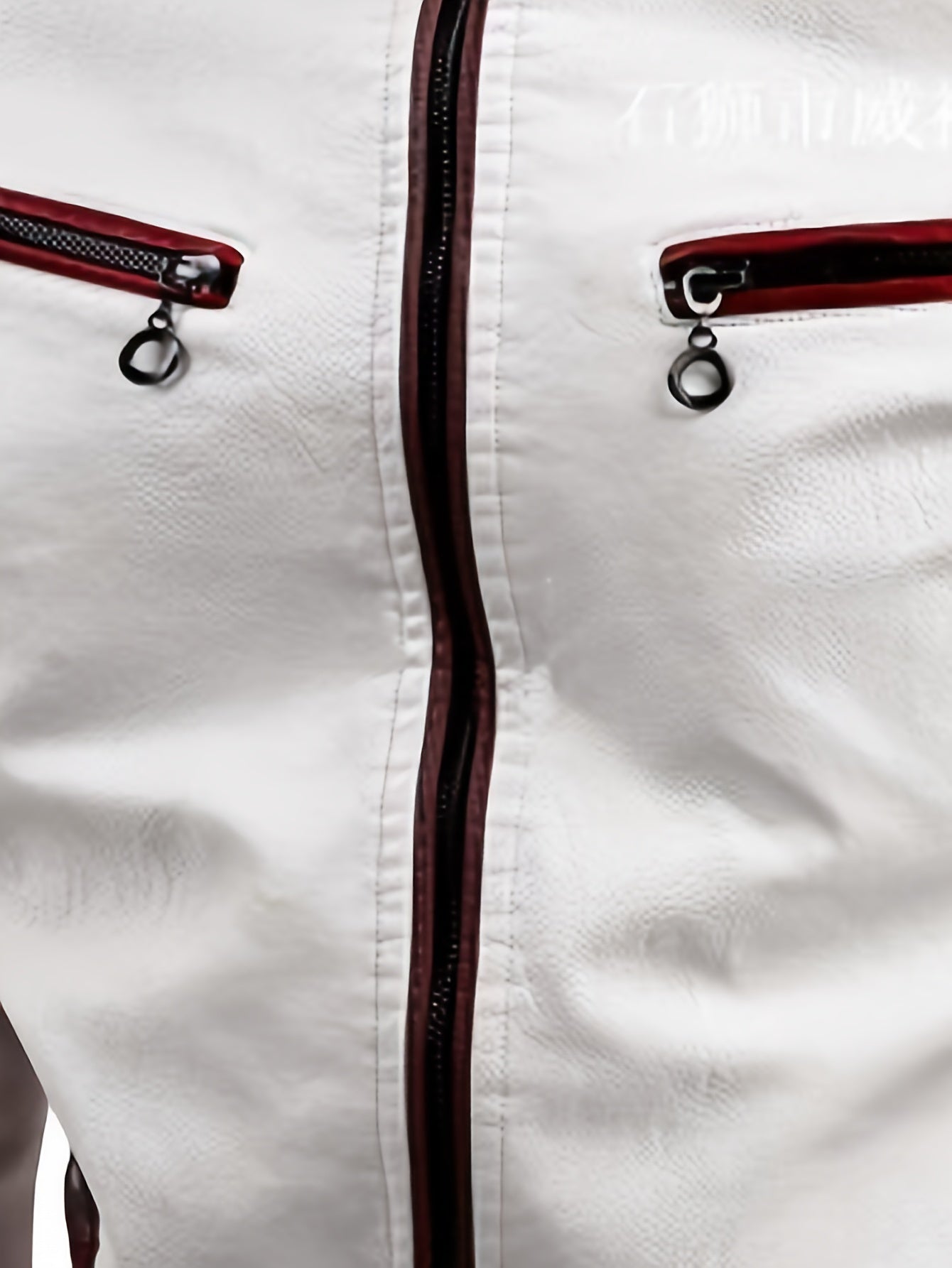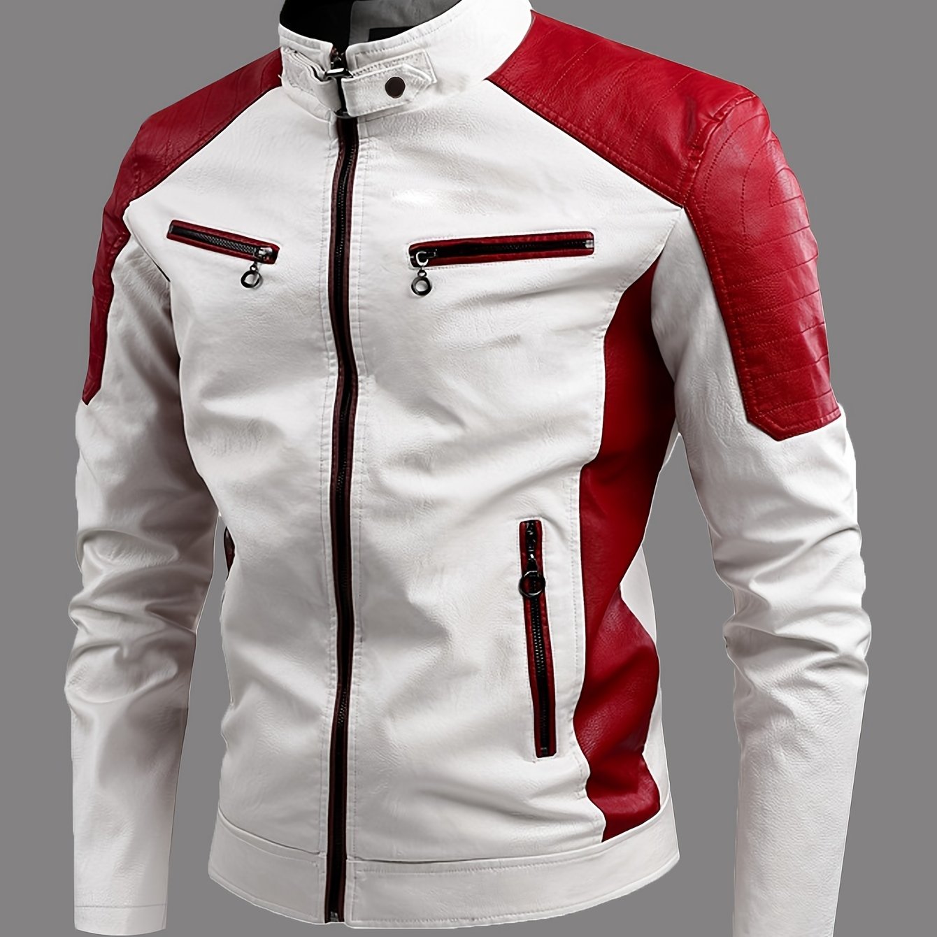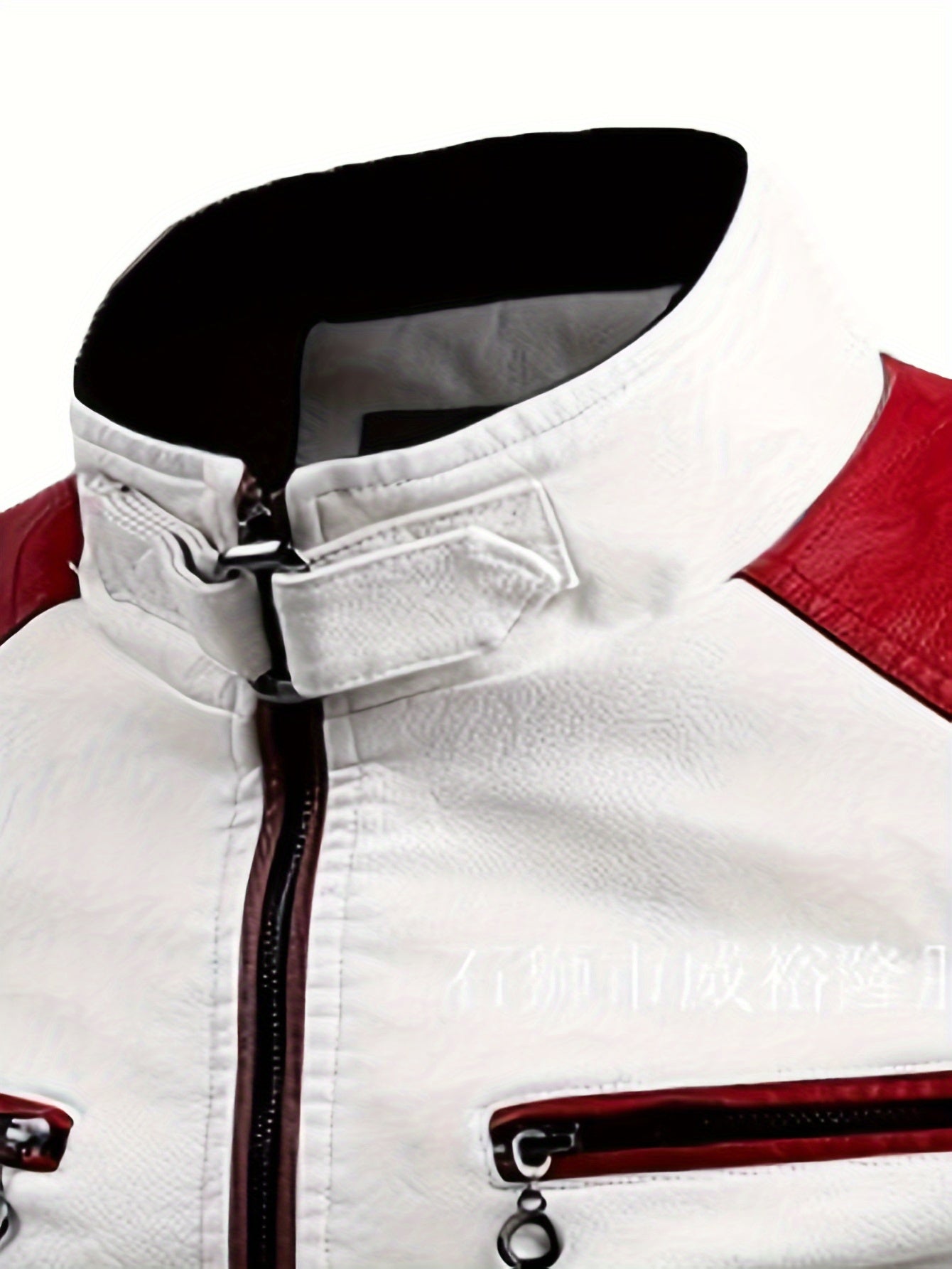 Erkaklar uchun tor kesimli rangli blokli jakket, turli cho'ntaklar, turg'un yaka, fermuar, kuz/qish/fall uchun oq va qizil dizayn.