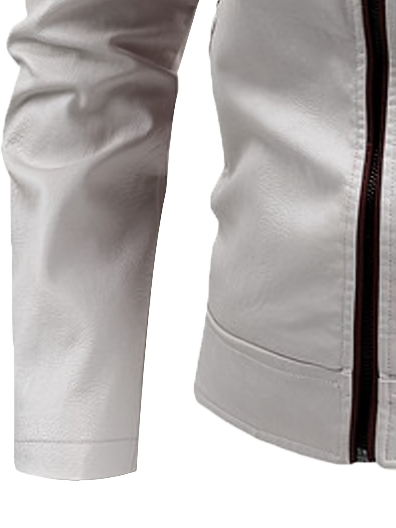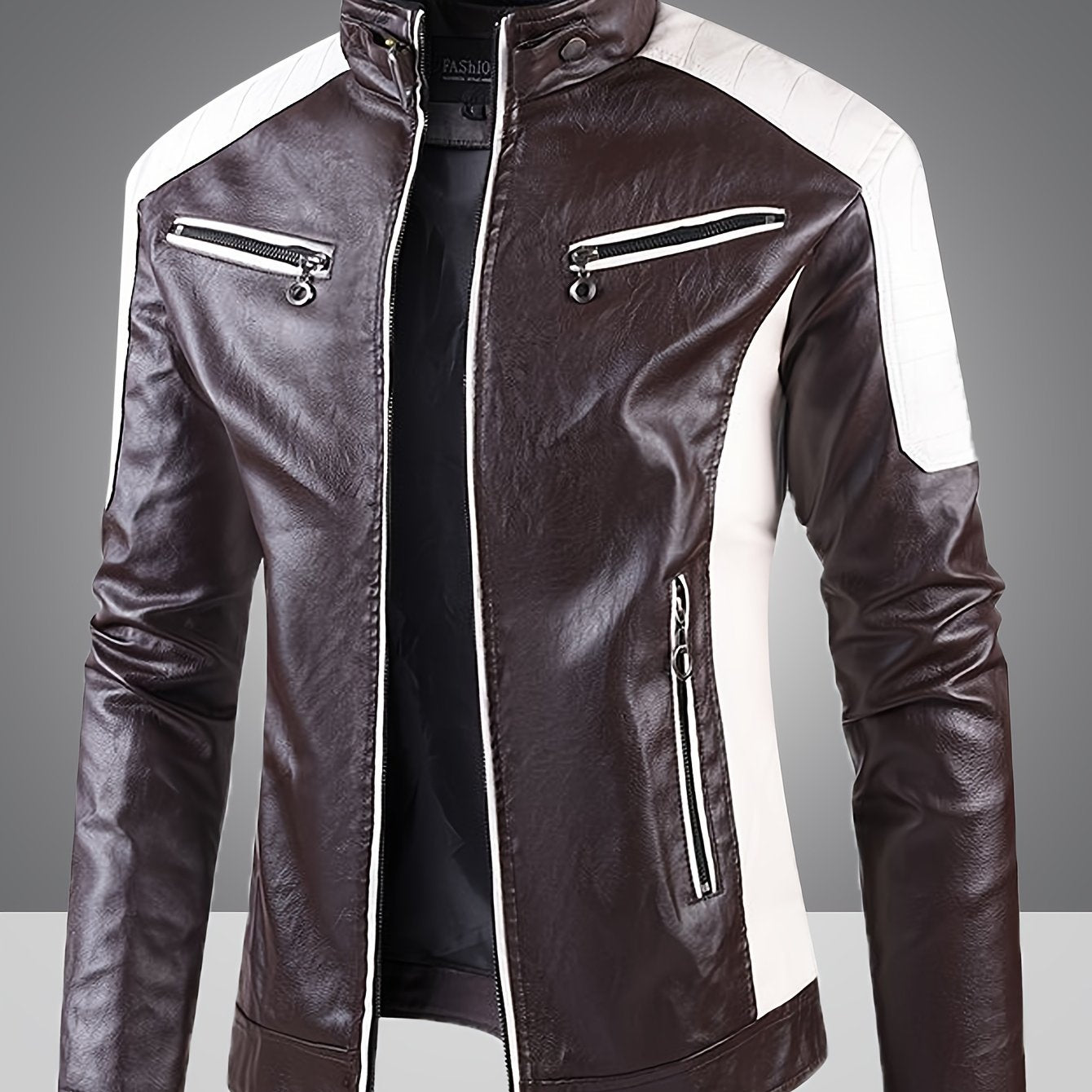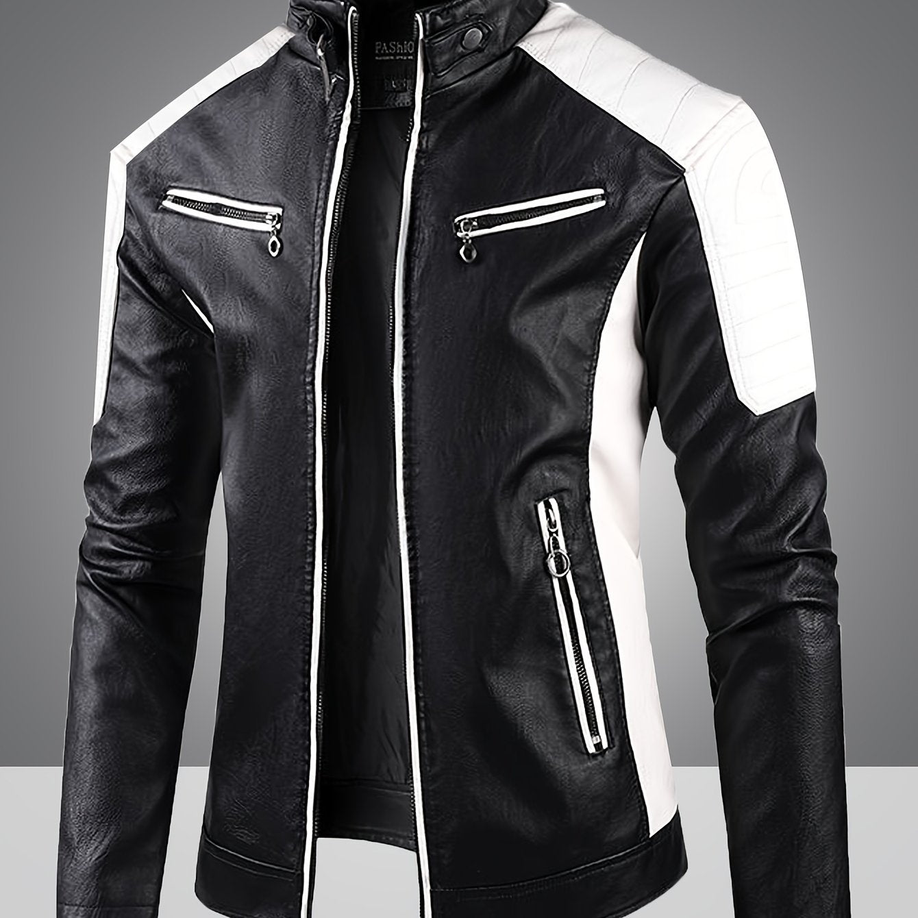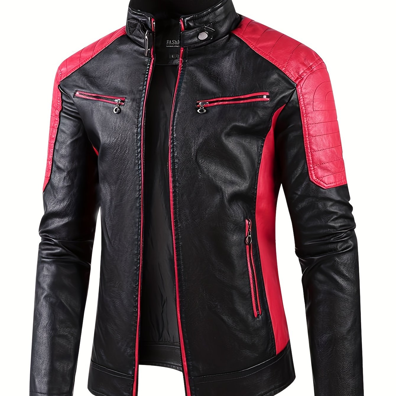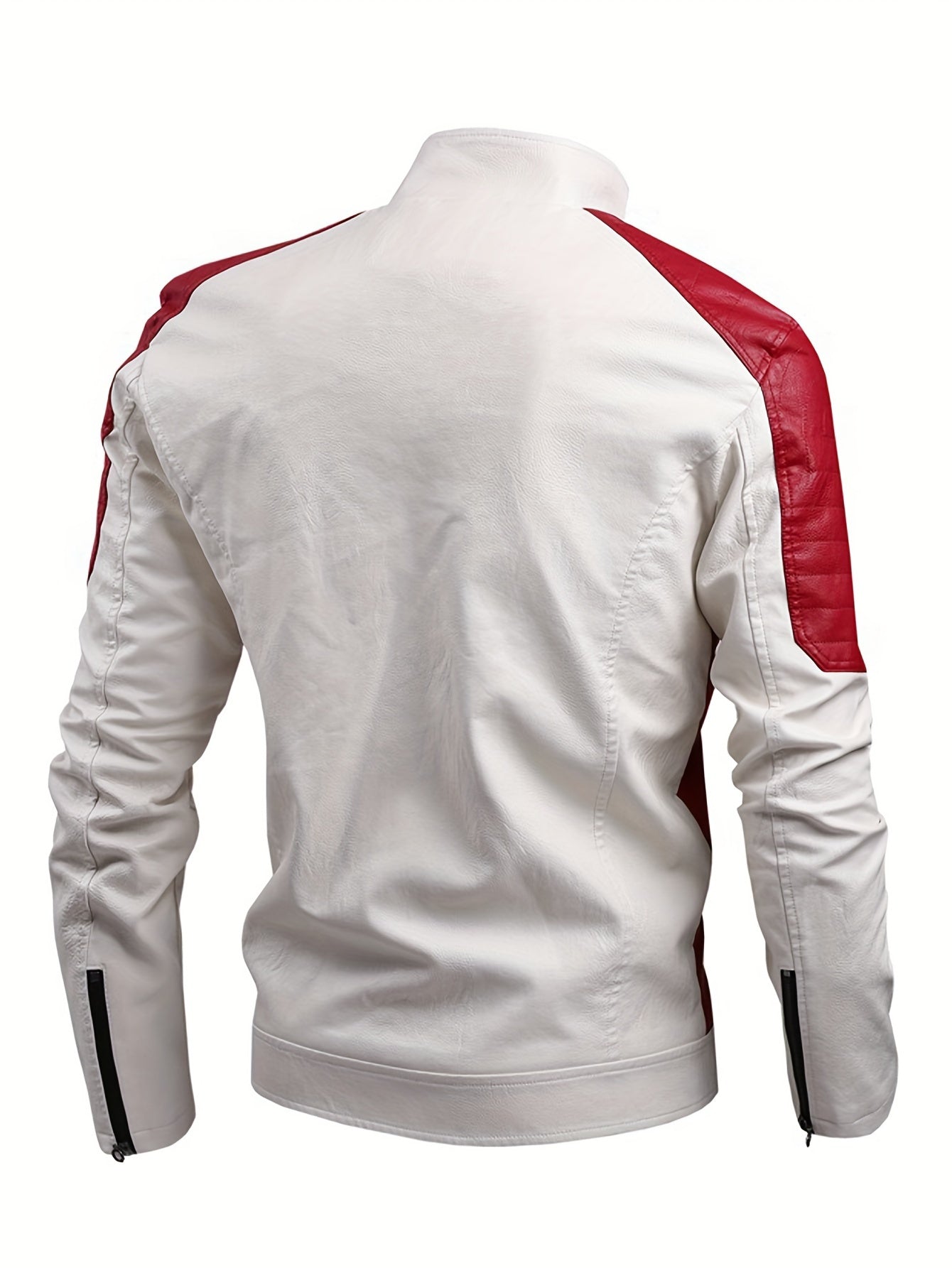 Erkaklar uchun tor kesimli rangli blokli jakket, turli cho'ntaklar, turg'un yaka, fermuar, kuz/qish/fall uchun oq va qizil dizayn.